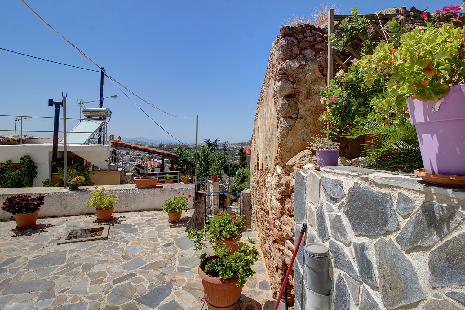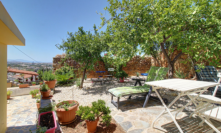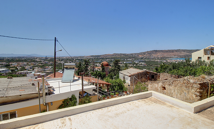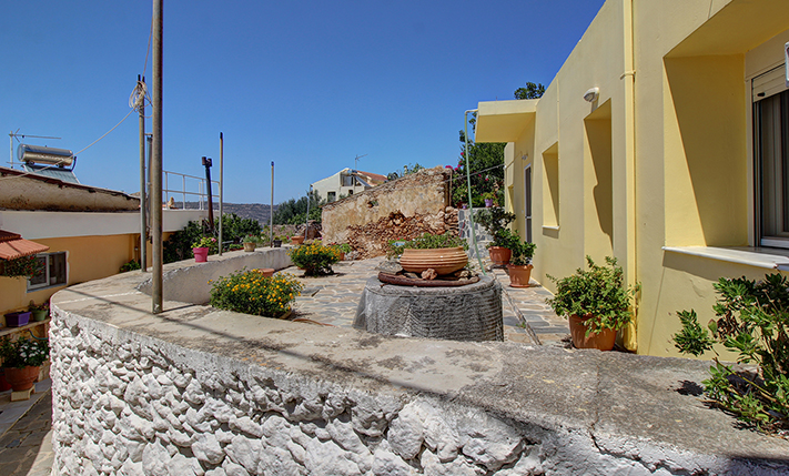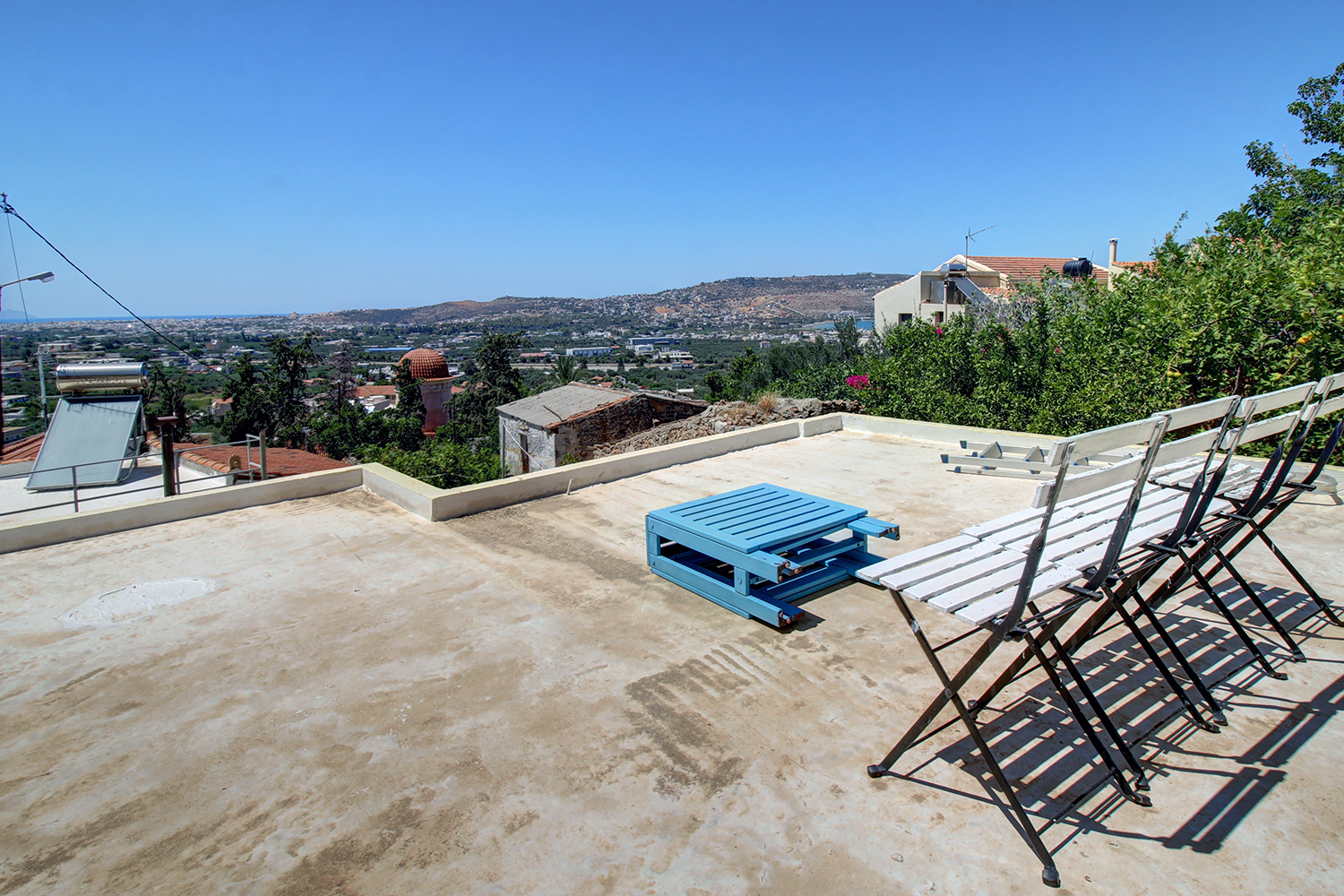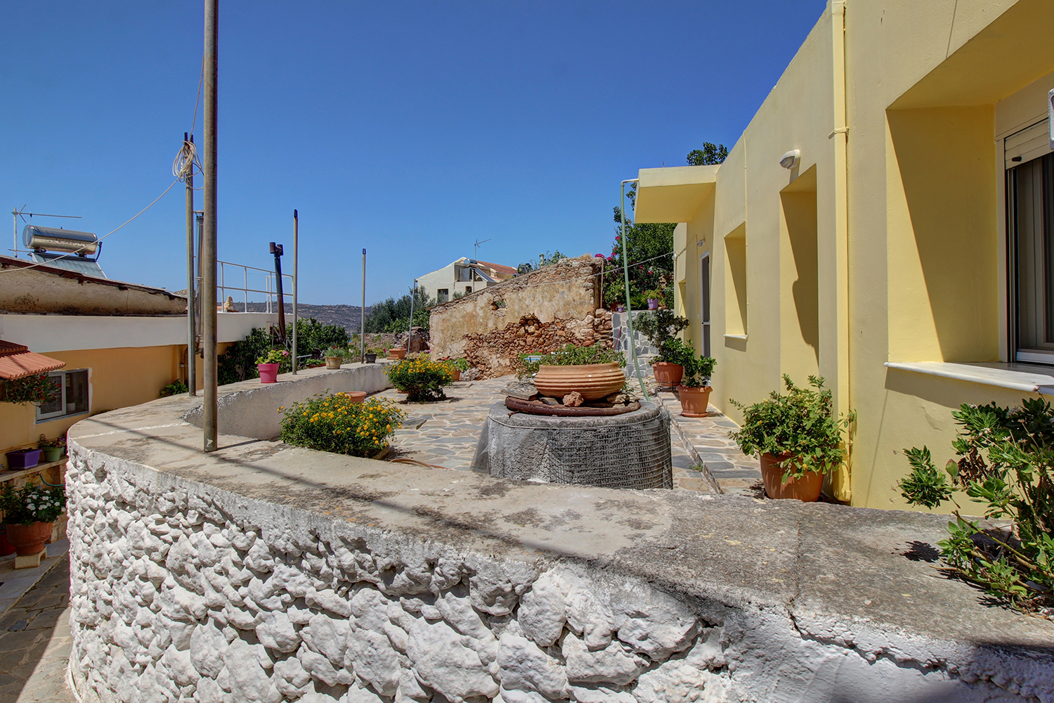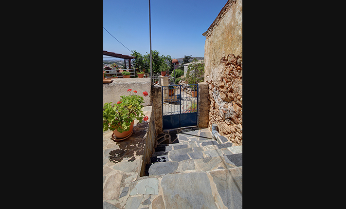 The building is ground floor and the plot is elevated and has a dry-stone wall around it. It consists of two parts and the main residence occupies 88 m². A 17 m² second part is adjacent but has independent access through the courtyard. The property has a northwest orientation and from several points the views are beautiful up to the bay of Souda in the background. In front of the residence we find a good-sized stone-paved yard and a well. A beautiful garden has been created between the two independent parts of the building. On the back side of the building 2-3 steps lead to the rooftop terrace that offers unobstructed views over the city, which can become an impressive and functional space, if you configure it properly. The back side of the property is adjacent to a small picturesque square, which is accessible by your vehicle. You can park either there or at a distance of about 40 m away, where there is a wide road.