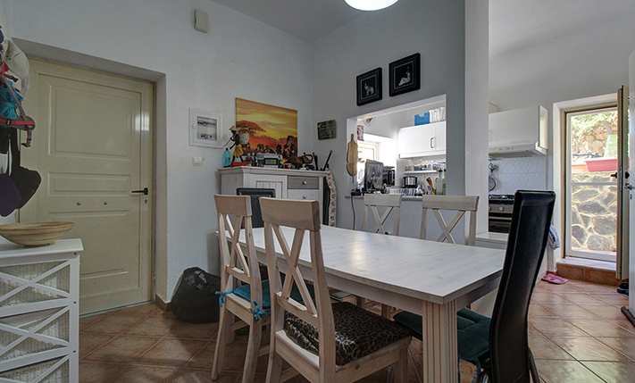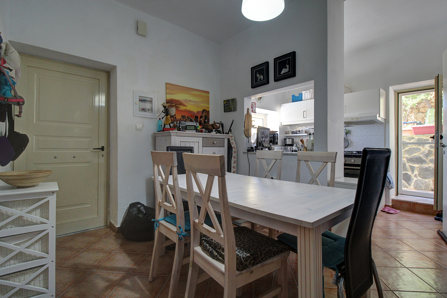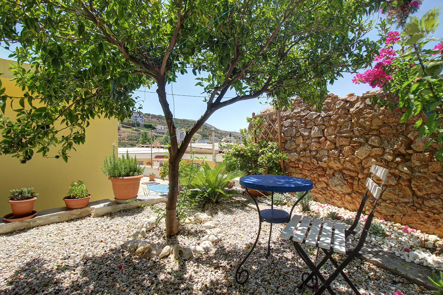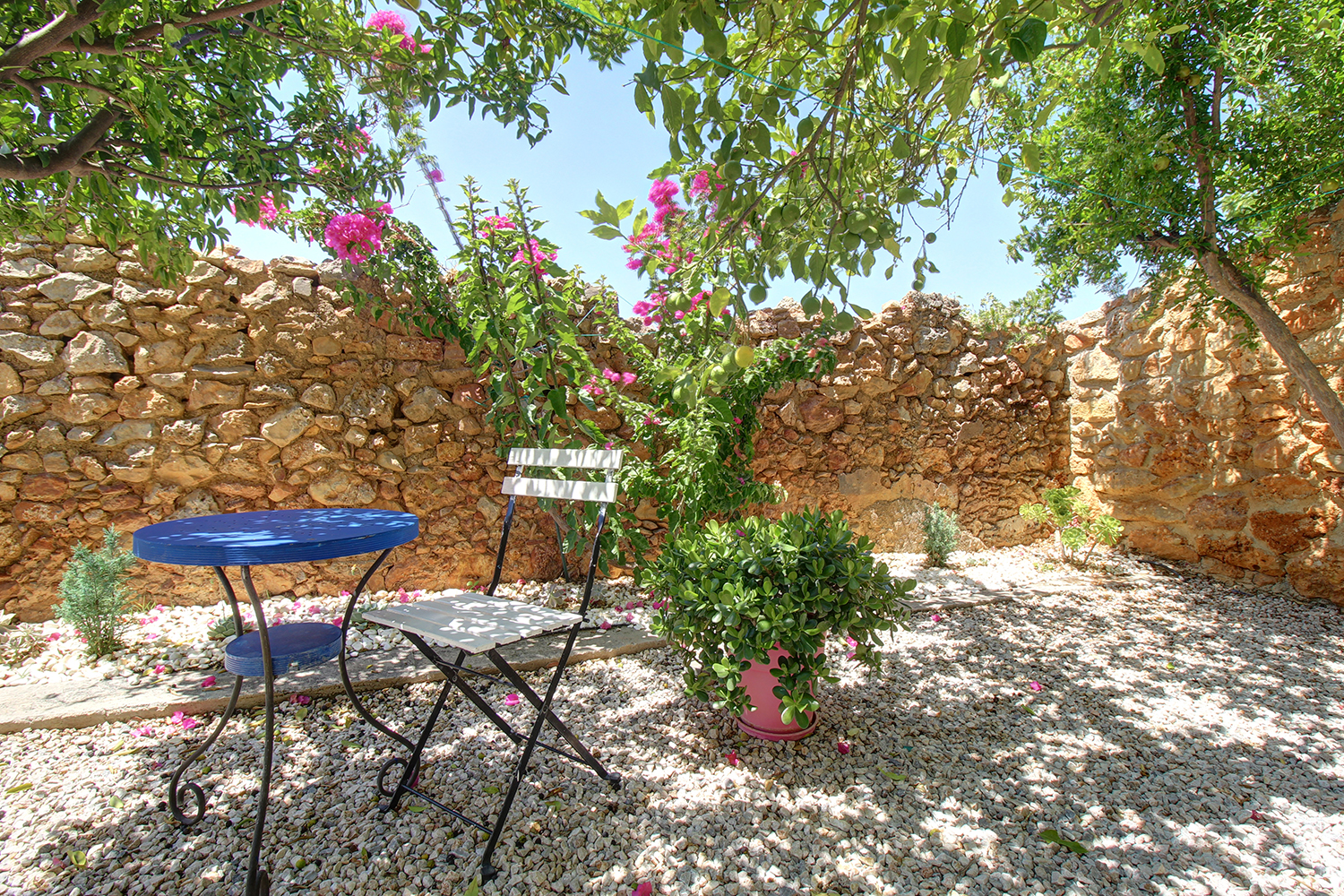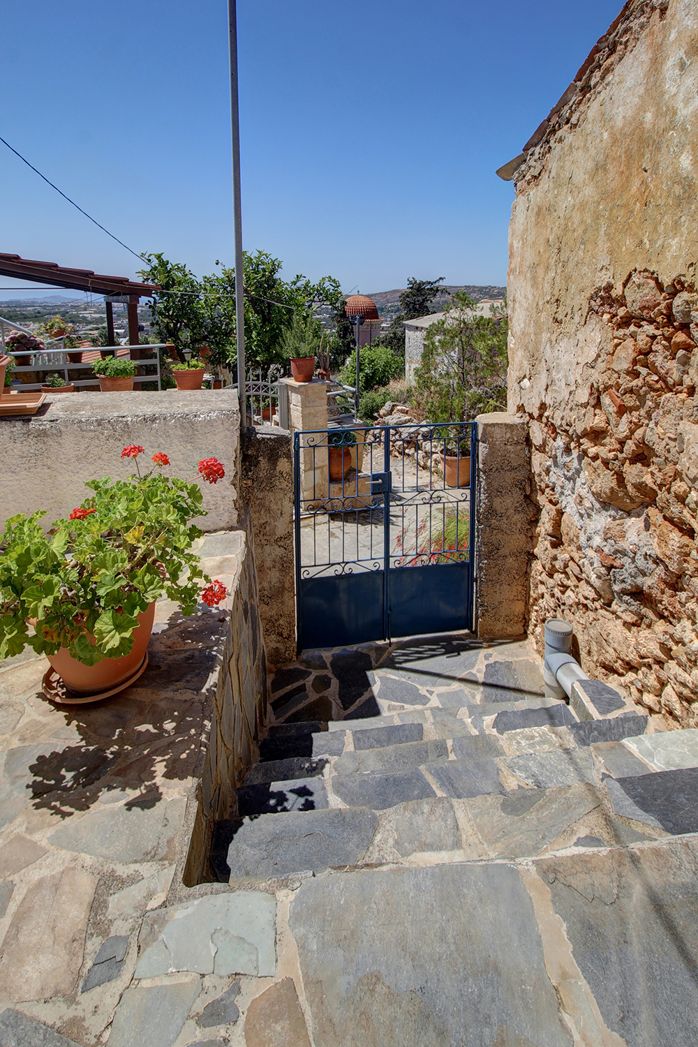 The building is ground floor and the plot is elevated and has a dry-stone wall around it. It consists of two parts and the main residence occupies 88 m². A 17 m² second part is adjacent but has independent access through the courtyard. The property has a northwest orientation and from several points the views are beautiful up to the bay of Souda in the background. In front of the residence we find a good-sized stone-paved yard and a well. A beautiful garden has been created between the two independent parts of the building. On the back side of the building 2-3 steps lead to the rooftop terrace that offers unobstructed views over the city, which can become an impressive and functional space, if you configure it properly. The back side of the property is adjacent to a small picturesque square, which is accessible by your vehicle. You can park either there or at a distance of about 40 m away, where there is a wide road.