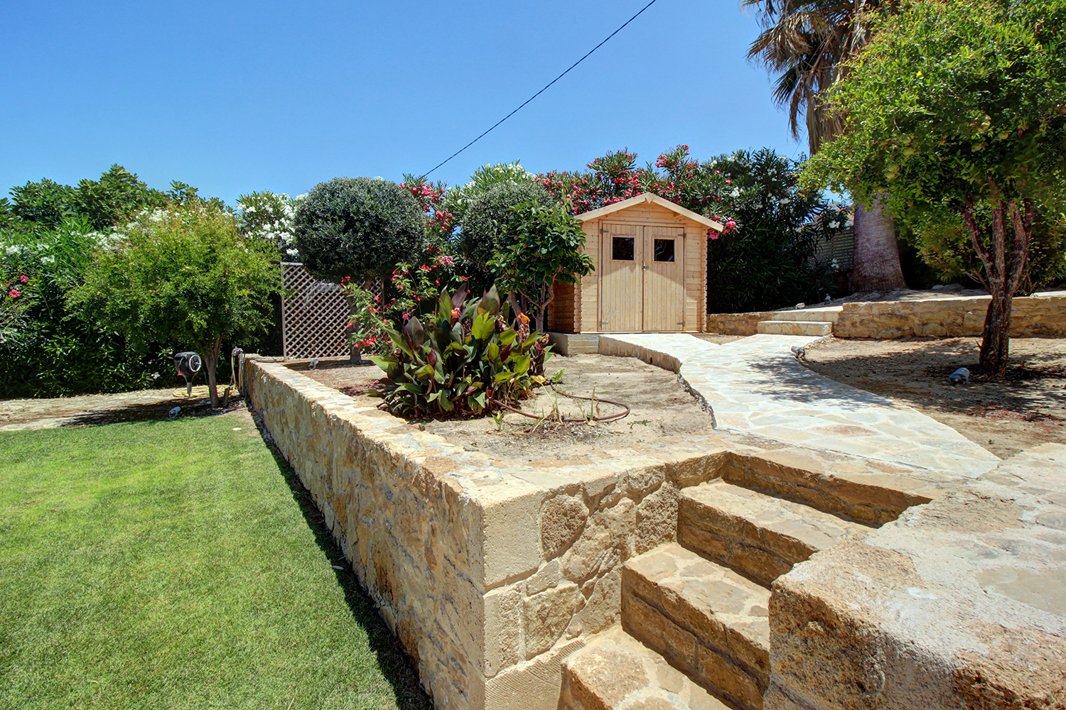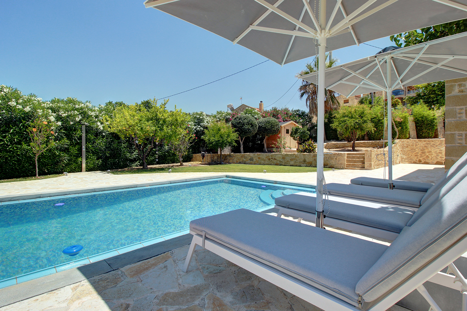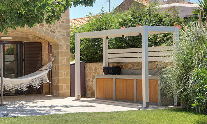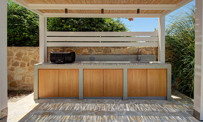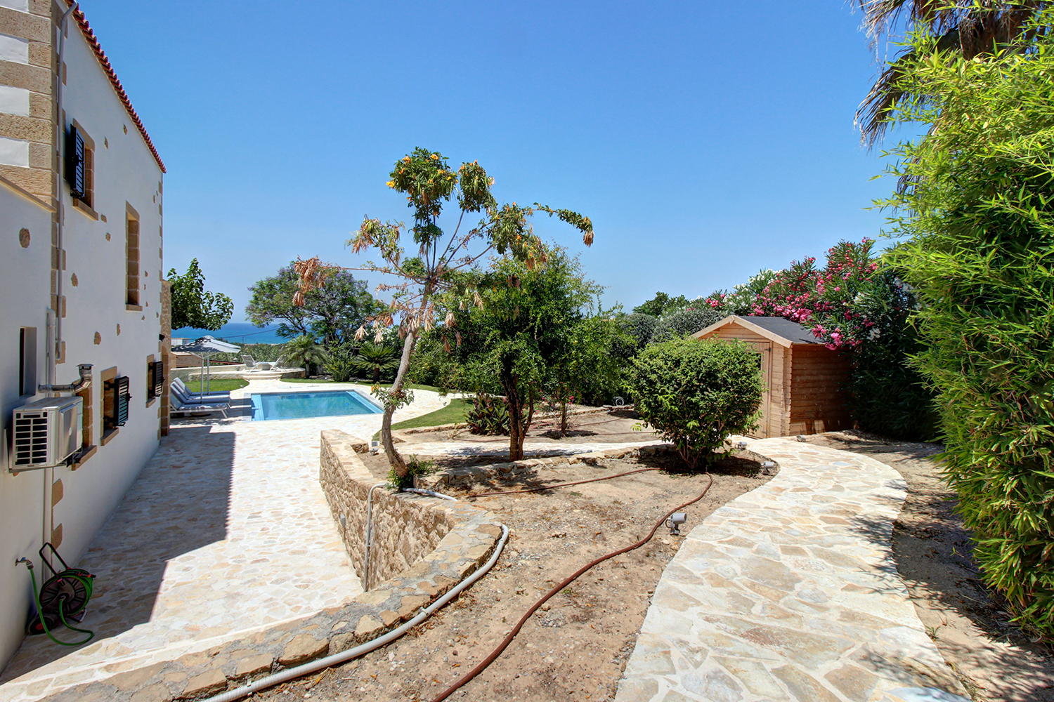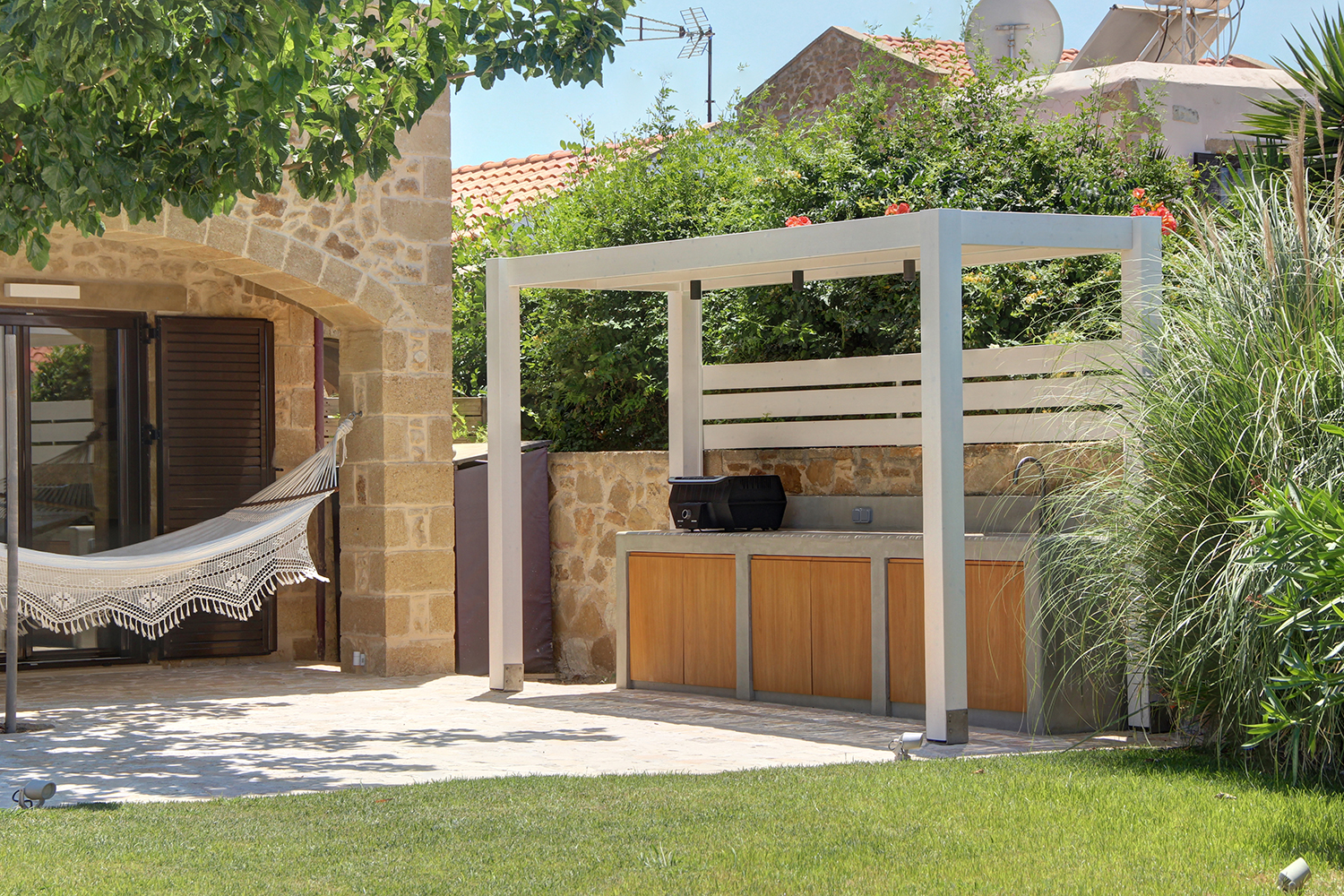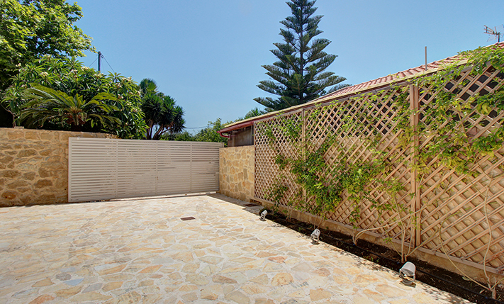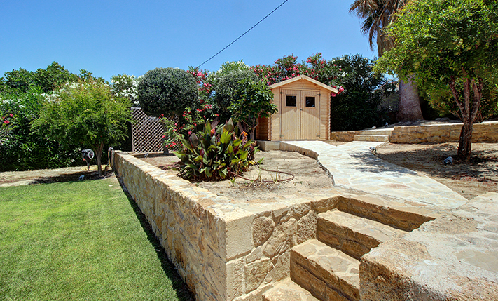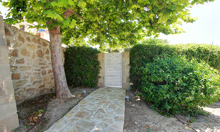 The plot is fully fenced, making it ideal for children to play safely or for containing your pets. At the front of the house, there is ample parking space, accessible through an electric metal gate. A small section of the garden has been separated by a wall and gate, making it suitable for use as a vegetable garden. All remaining outdoor areas around the residence are fully landscaped, featuring a lawn, trees that provide privacy, paved courtyards, and multiple spots where one can enjoy the beautiful view either in the shade or under the warm summer sun. At the rear of the house, there is a covered northern veranda, and right next to it, an outdoor kitchen has been constructed for barbecues, equipped with a sink, cupboards, and a pergola with reed covering. The private swimming pool of the house is a salt-water pool. It is equipped with a new filtration system, measures approximately 23 m², and is surrounded by a spacious sunbathing area.
