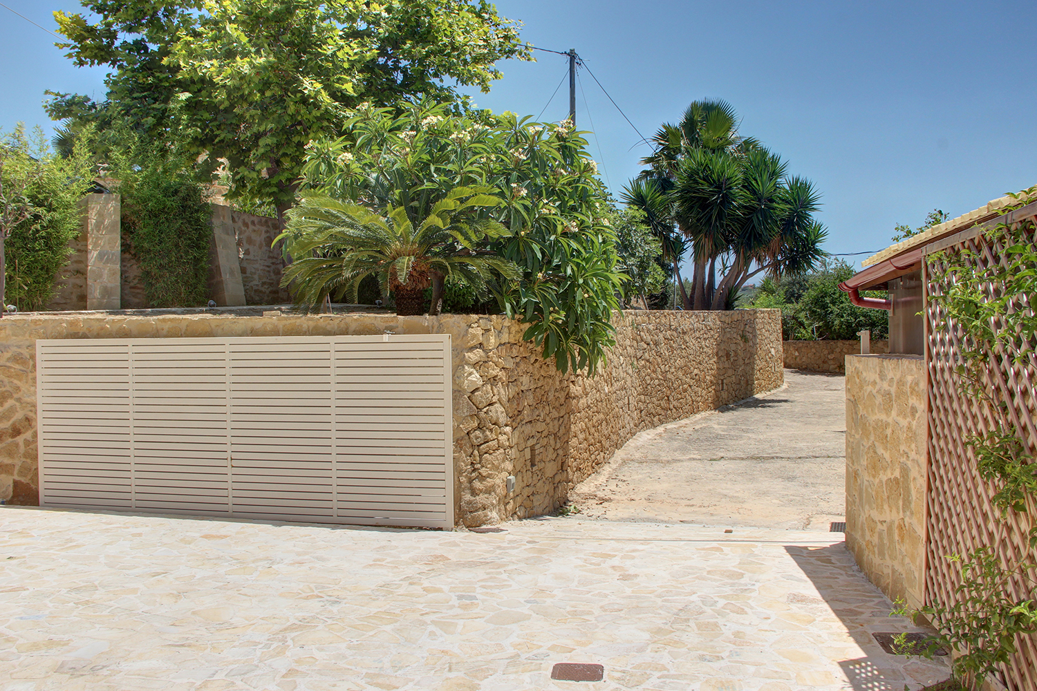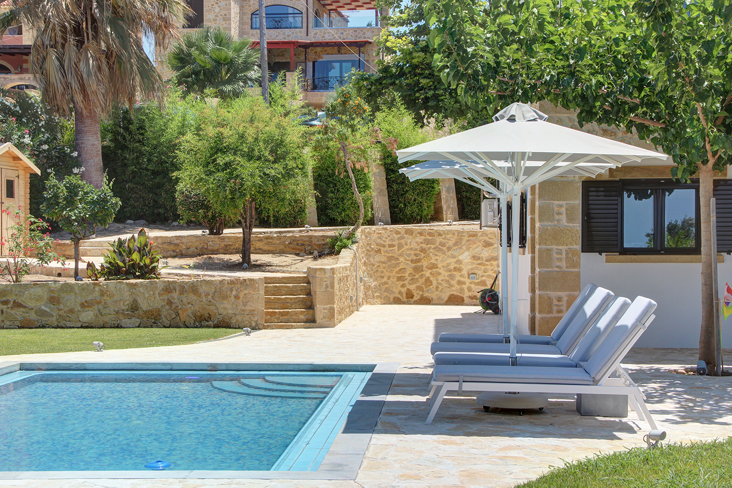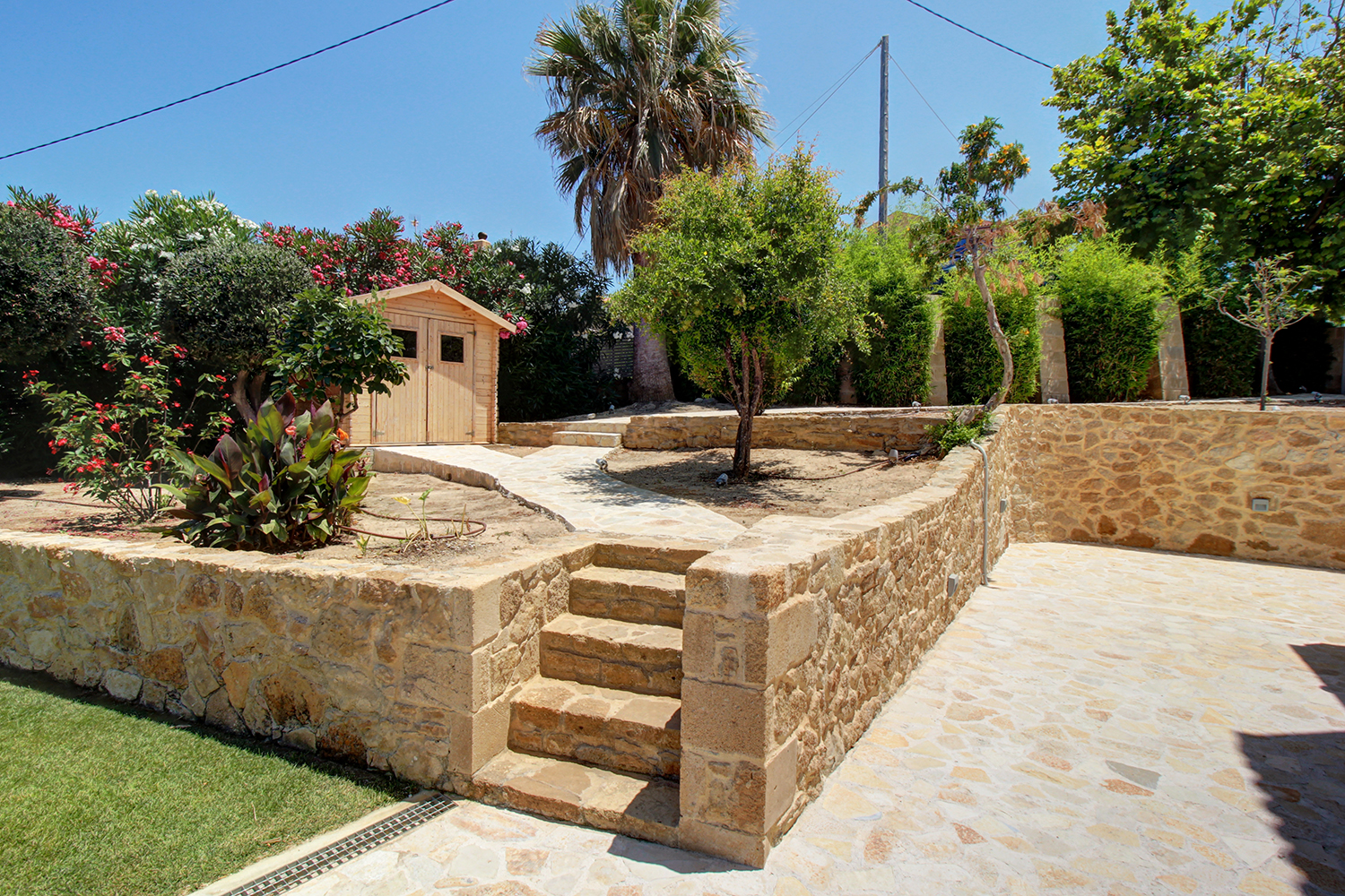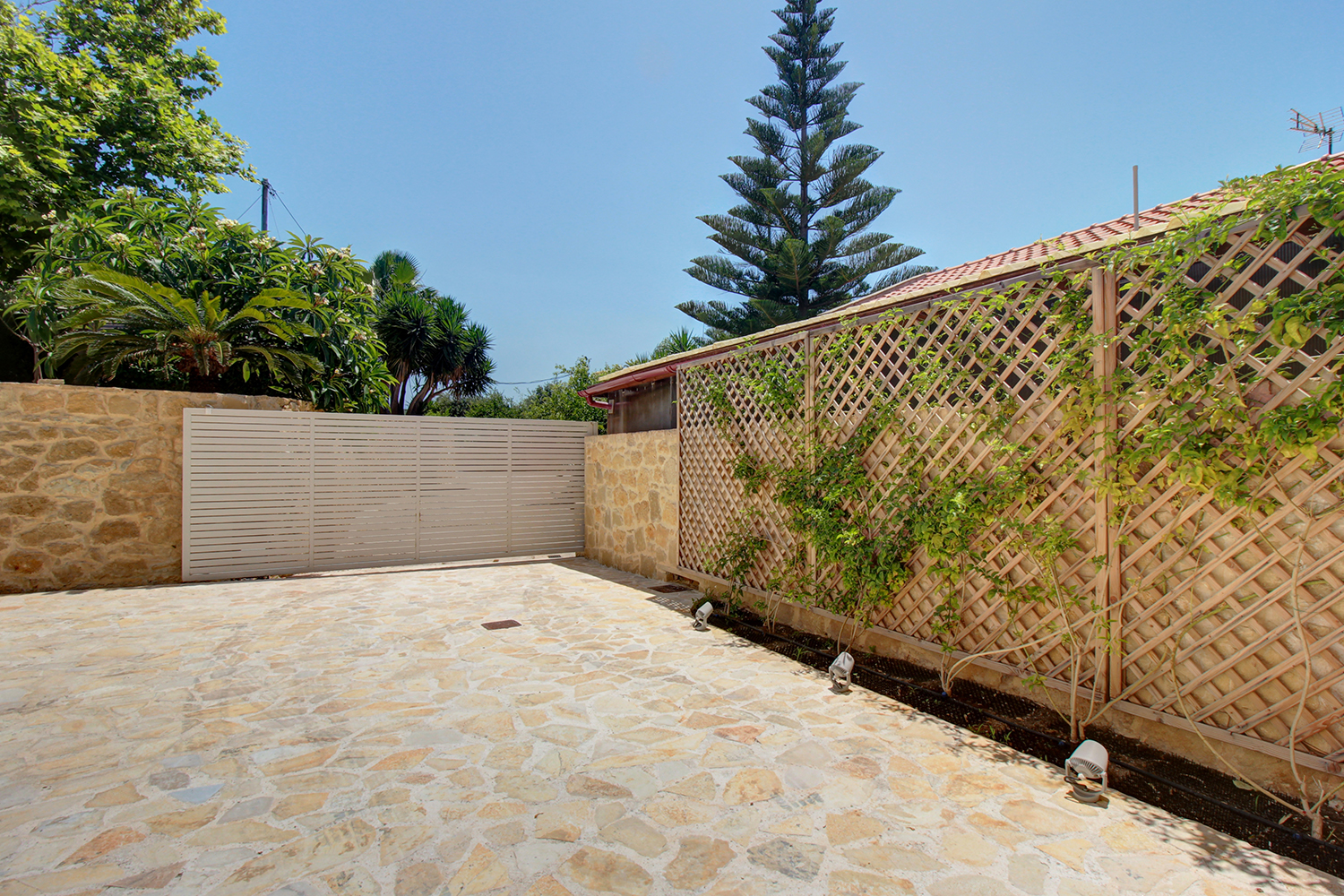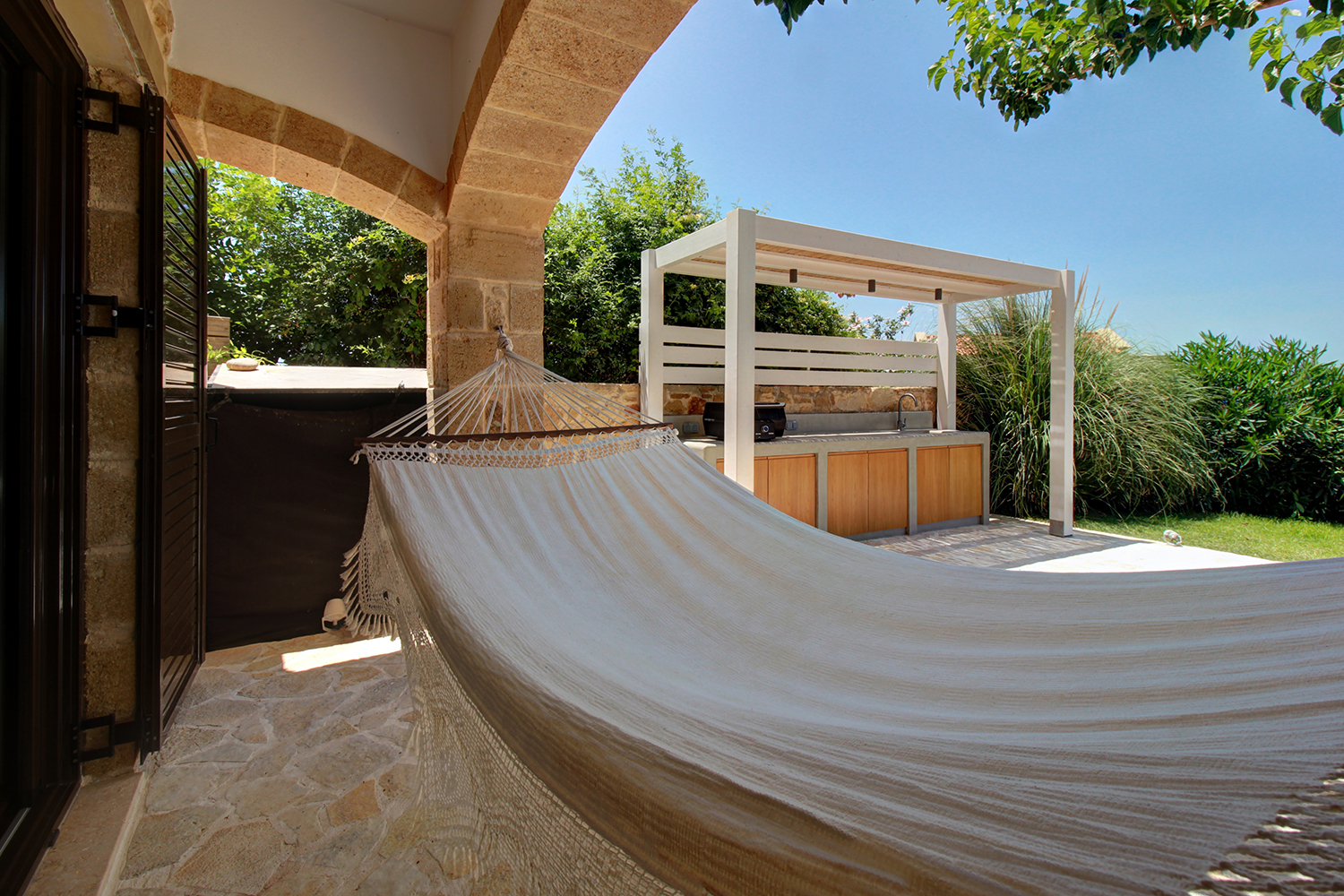 The plot is fully fenced, making it ideal for children to play safely or for containing your pets. At the front of the house, there is ample parking space, accessible through an electric metal gate. A small section of the garden has been separated by a wall and gate, making it suitable for use as a vegetable garden. All remaining outdoor areas around the residence are fully landscaped, featuring a lawn, trees that provide privacy, paved courtyards, and multiple spots where one can enjoy the beautiful view either in the shade or under the warm summer sun. At the rear of the house, there is a covered northern veranda, and right next to it, an outdoor kitchen has been constructed for barbecues, equipped with a sink, cupboards, and a pergola with reed covering. The private swimming pool of the house is a salt-water pool. It is equipped with a new filtration system, measures approximately 23 m², and is surrounded by a spacious sunbathing area.