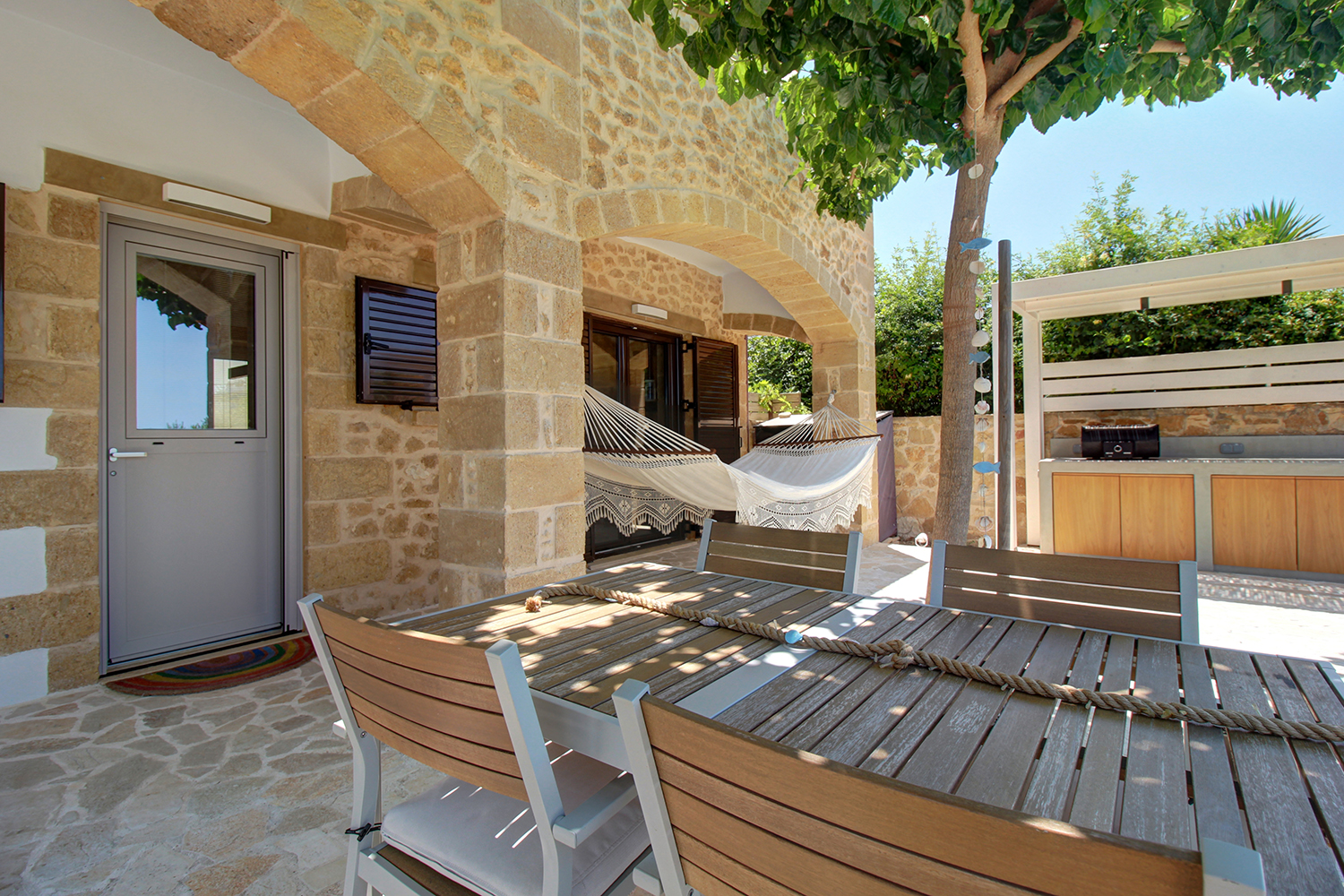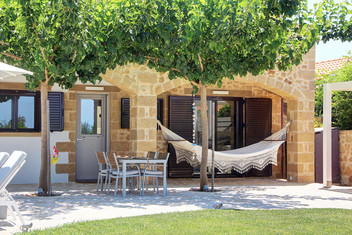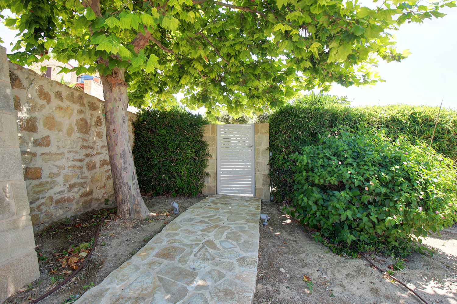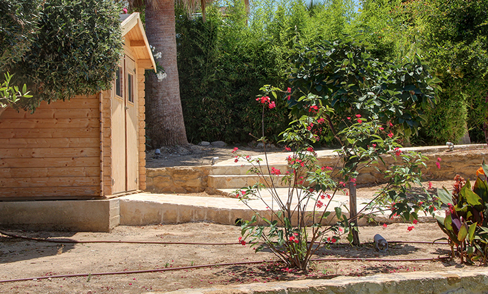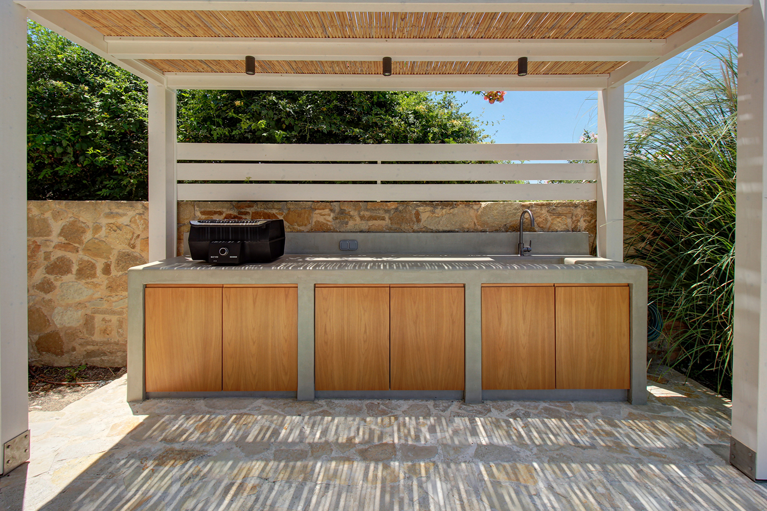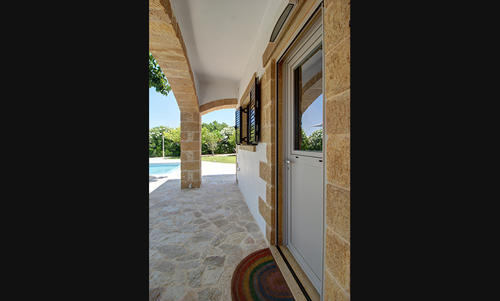 The plot is fully fenced, making it ideal for children to play safely or for containing your pets. At the front of the house, there is ample parking space, accessible through an electric metal gate. A small section of the garden has been separated by a wall and gate, making it suitable for use as a vegetable garden. All remaining outdoor areas around the residence are fully landscaped, featuring a lawn, trees that provide privacy, paved courtyards, and multiple spots where one can enjoy the beautiful view either in the shade or under the warm summer sun. At the rear of the house, there is a covered northern veranda, and right next to it, an outdoor kitchen has been constructed for barbecues, equipped with a sink, cupboards, and a pergola with reed covering. The private swimming pool of the house is a salt-water pool. It is equipped with a new filtration system, measures approximately 23 m², and is surrounded by a spacious sunbathing area.
