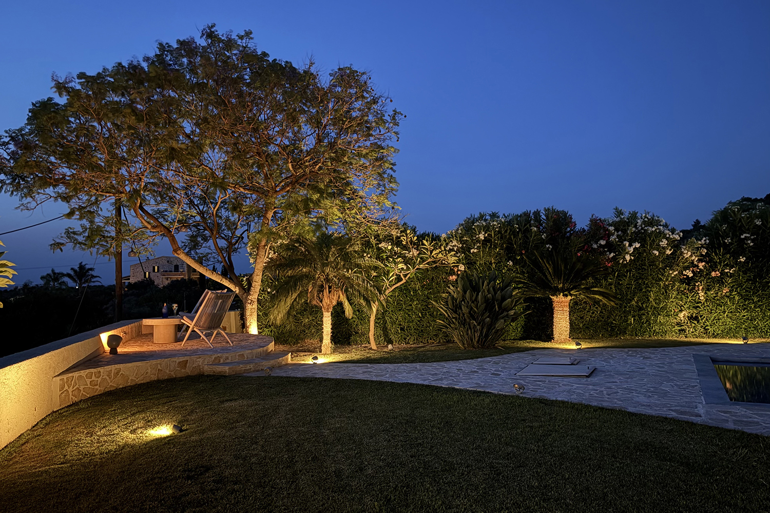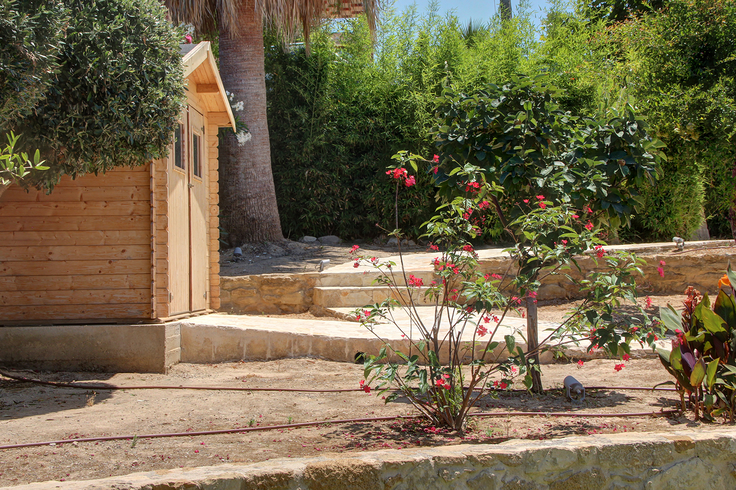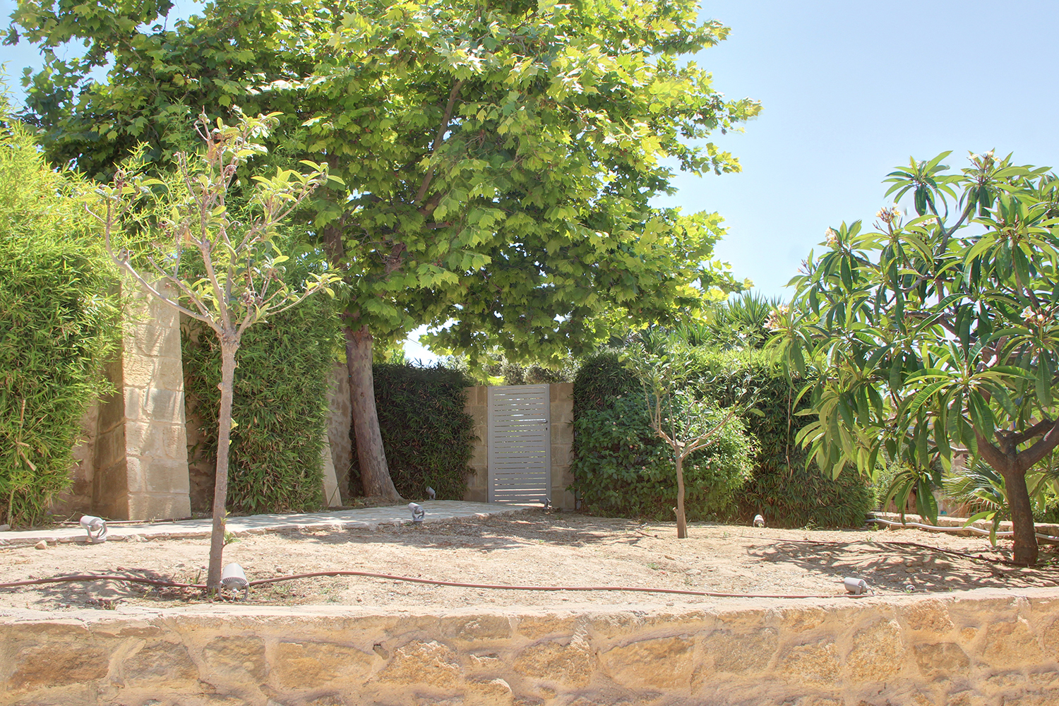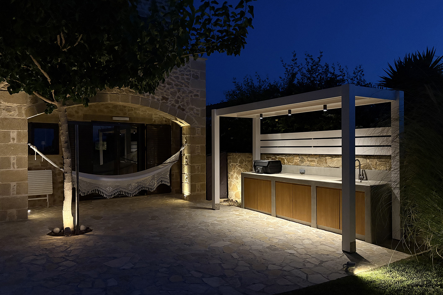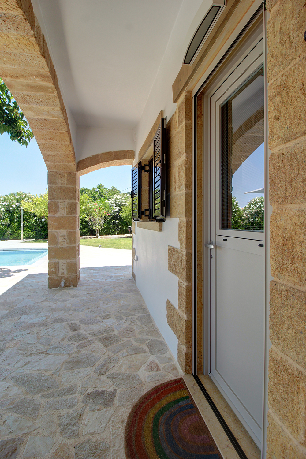 The plot is fully fenced, making it ideal for children to play safely or for containing your pets. At the front of the house, there is ample parking space, accessible through an electric metal gate. A small section of the garden has been separated by a wall and gate, making it suitable for use as a vegetable garden. All remaining outdoor areas around the residence are fully landscaped, featuring a lawn, trees that provide privacy, paved courtyards, and multiple spots where one can enjoy the beautiful view either in the shade or under the warm summer sun. At the rear of the house, there is a covered northern veranda, and right next to it, an outdoor kitchen has been constructed for barbecues, equipped with a sink, cupboards, and a pergola with reed covering. The private swimming pool of the house is a salt-water pool. It is equipped with a new filtration system, measures approximately 23 m², and is surrounded by a spacious sunbathing area.