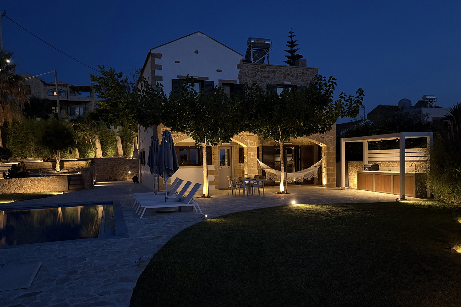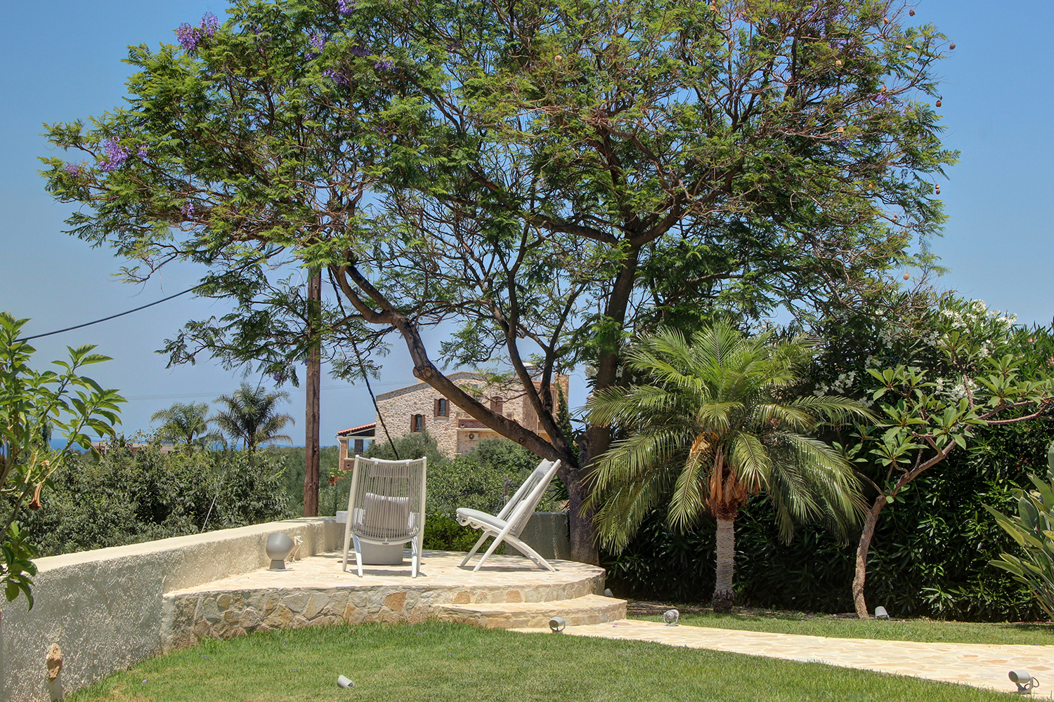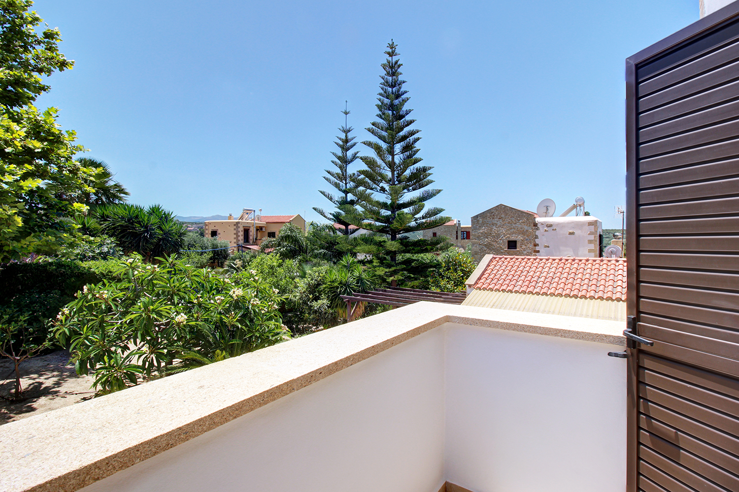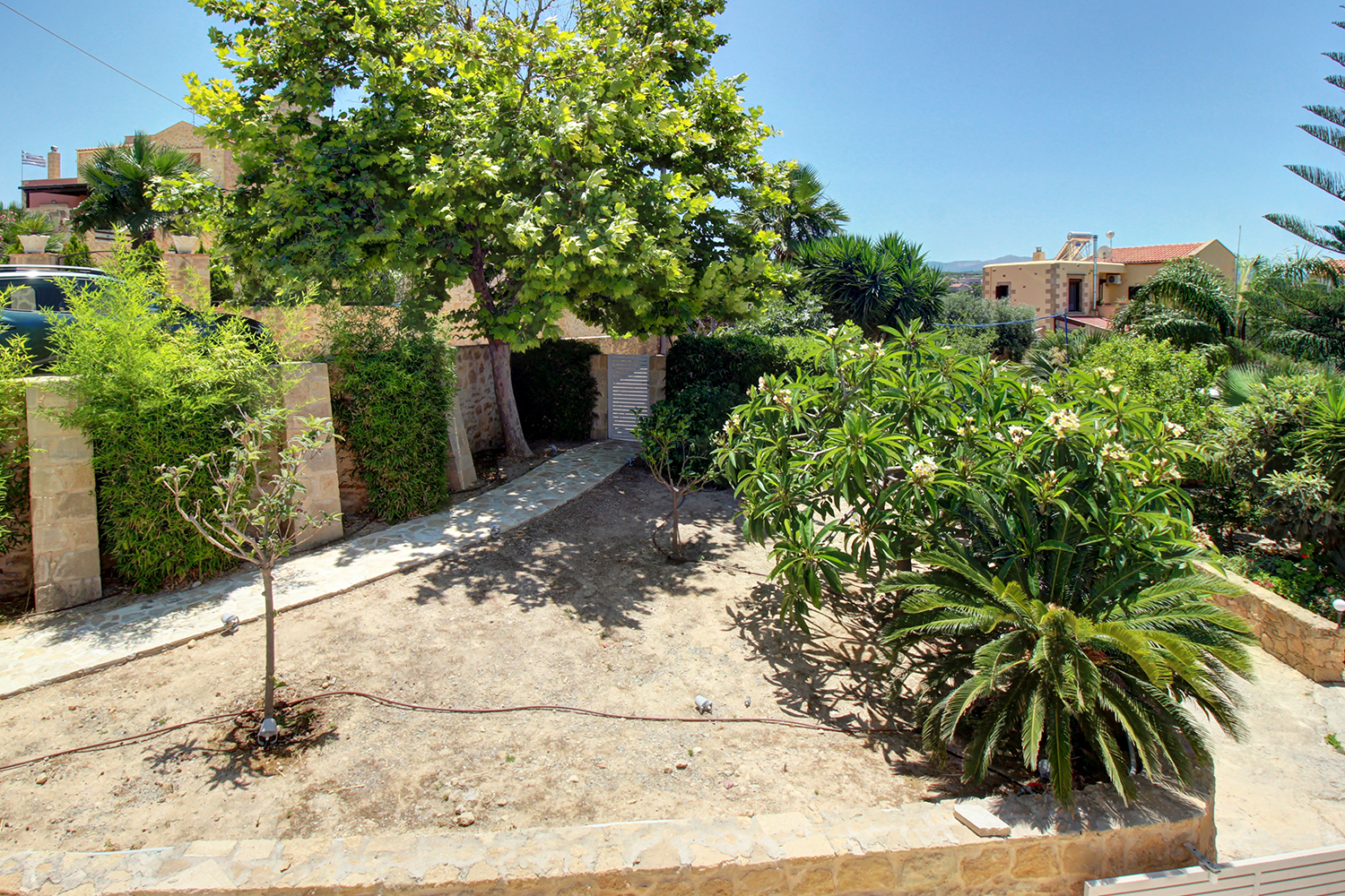 A short distance away lies the beach of Pirgos Psilonerou, which is expansive and remains relatively quiet even at the height of the tourist season. Approximately 2 km away is the village of Maleme, where one can find pharmacies, restaurants, supermarkets, and several shops operating year-round. The city and airport of Chania are approximately 25 and 35 minutes away by car, respectively.