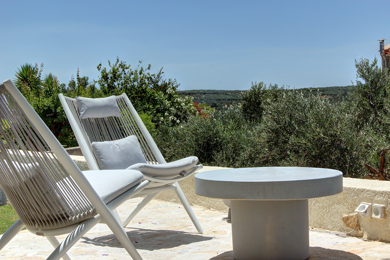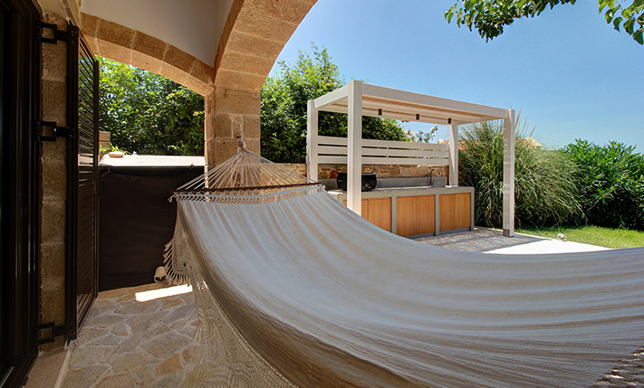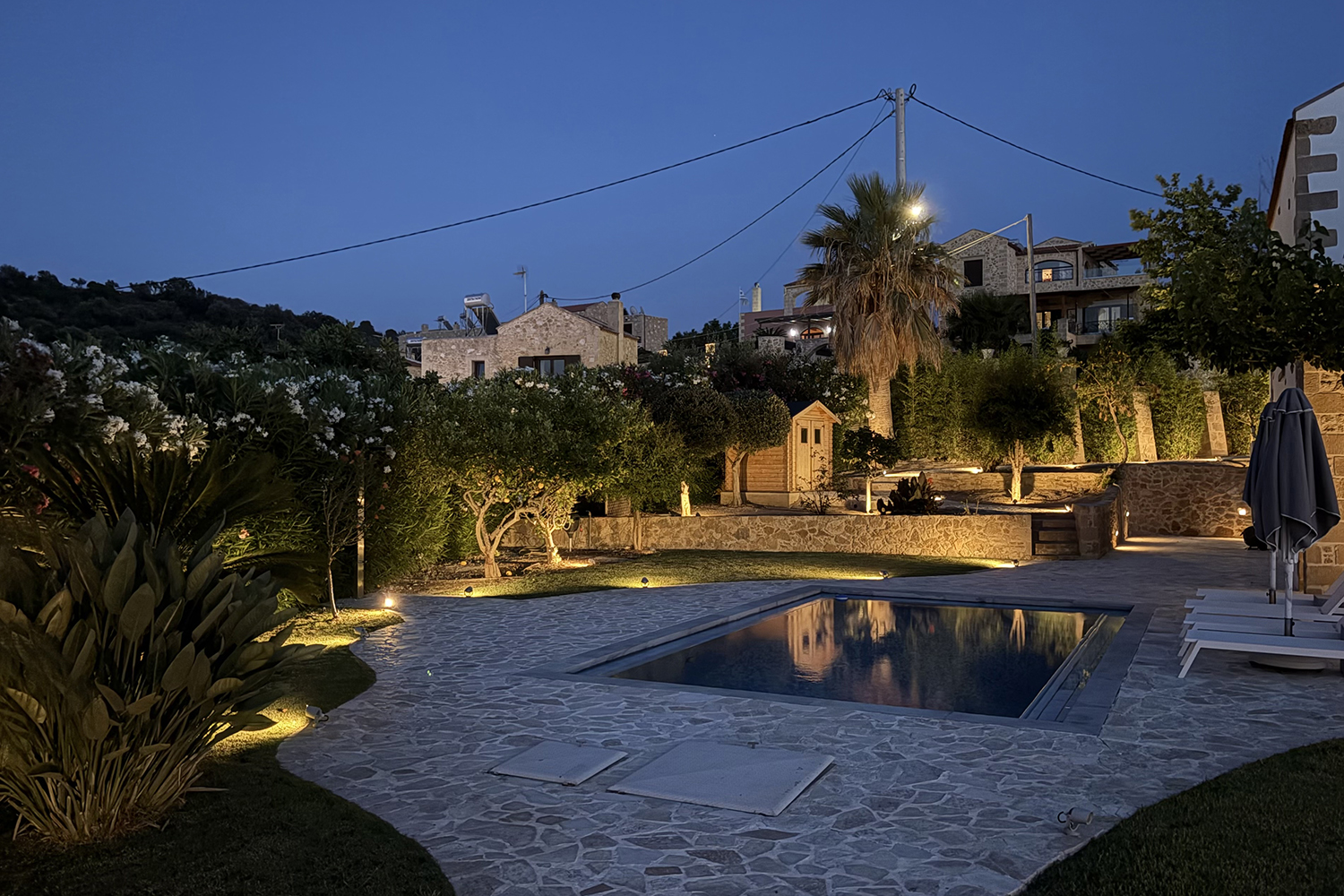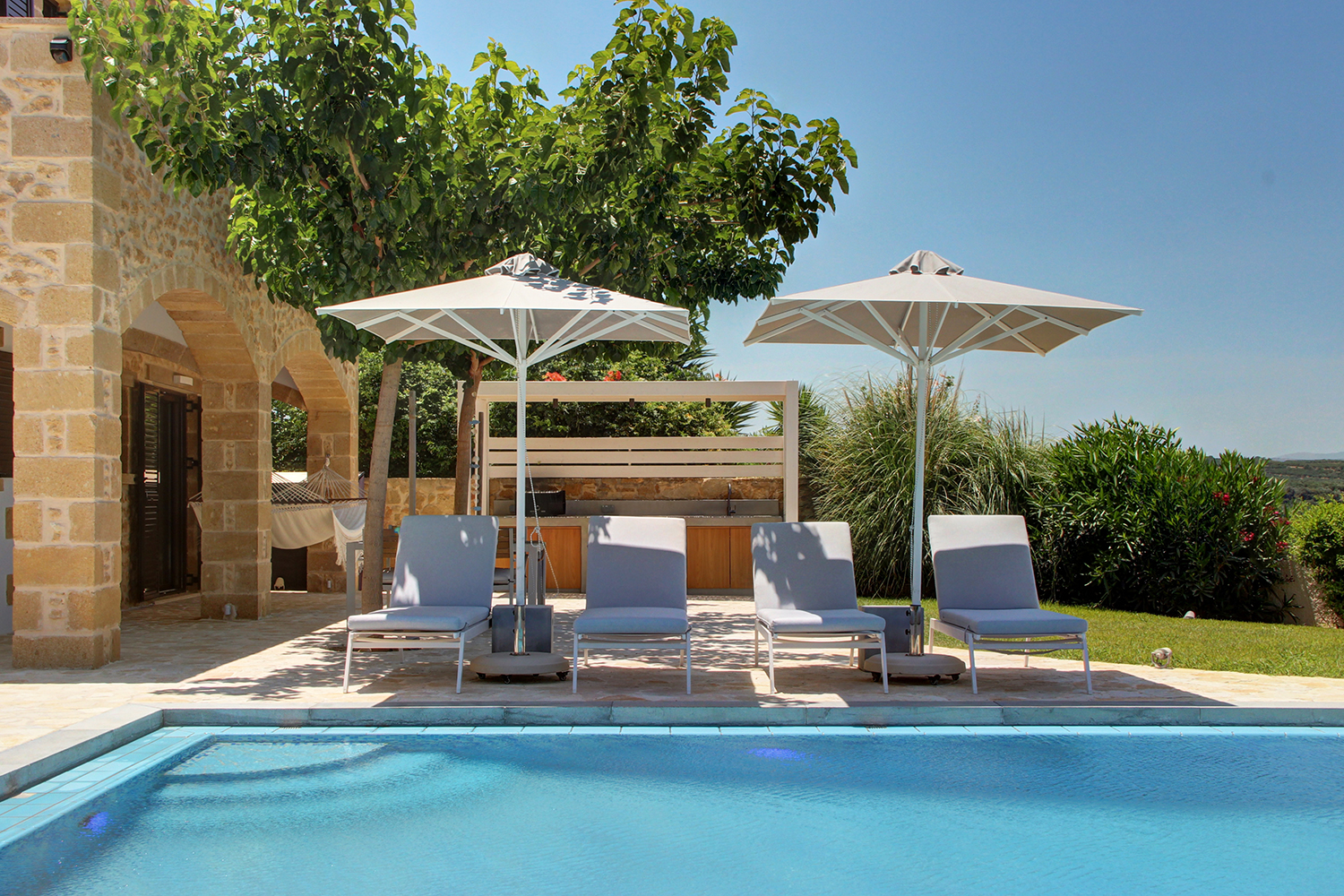 A short distance away lies the beach of Pirgos Psilonerou, which is expansive and remains relatively quiet even at the height of the tourist season. Approximately 2 km away is the village of Maleme, where one can find pharmacies, restaurants, supermarkets, and several shops operating year-round. The city and airport of Chania are approximately 25 and 35 minutes away by car, respectively.