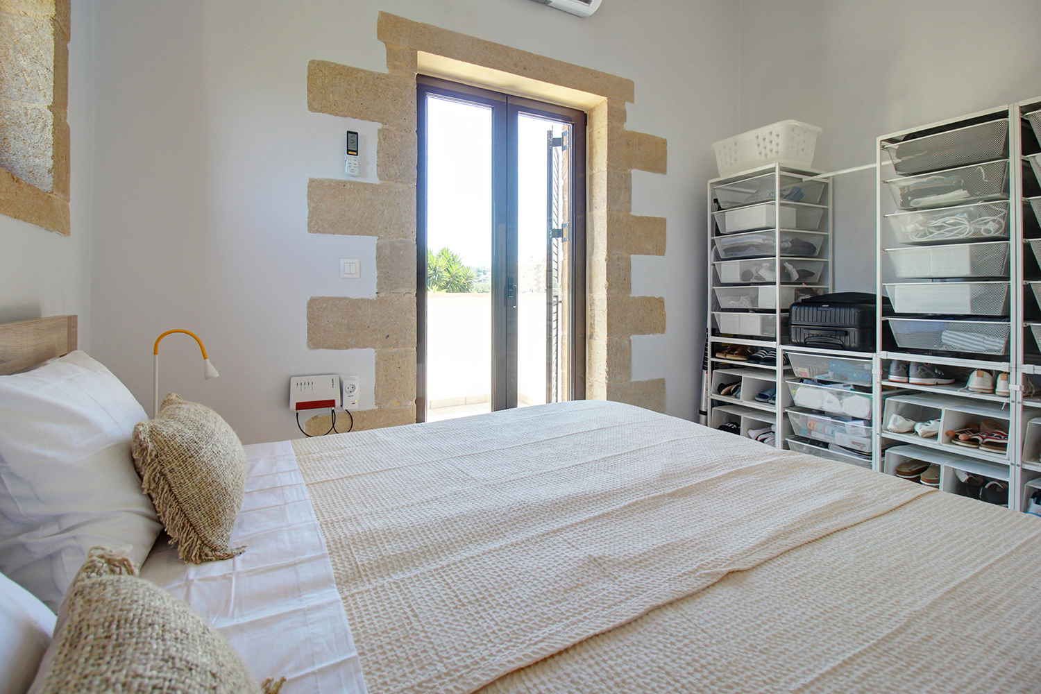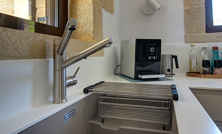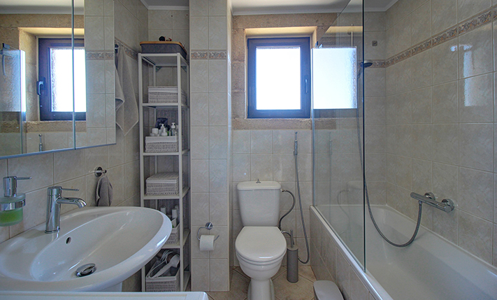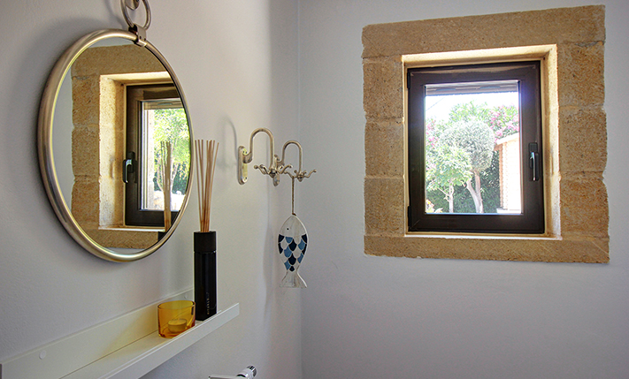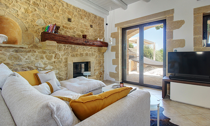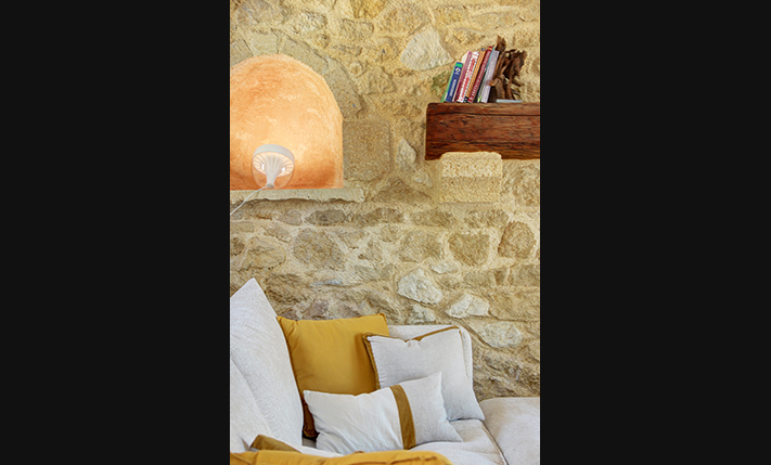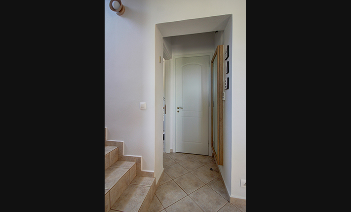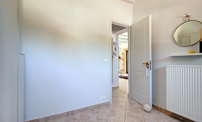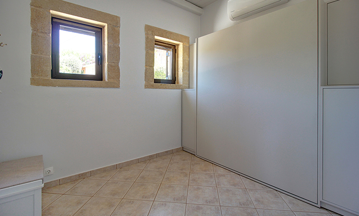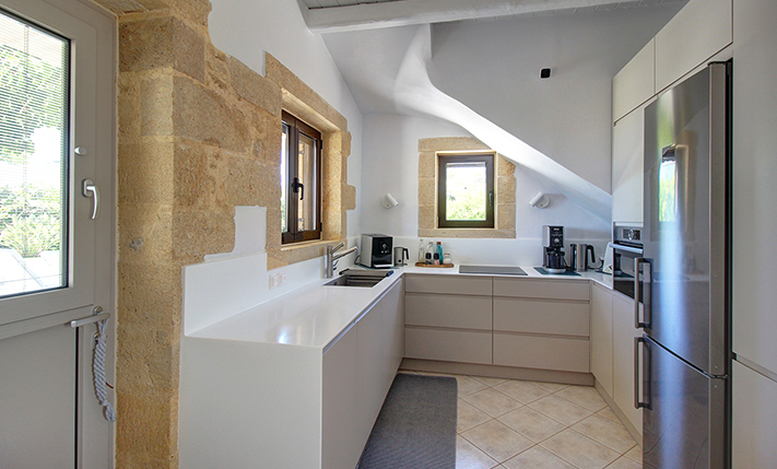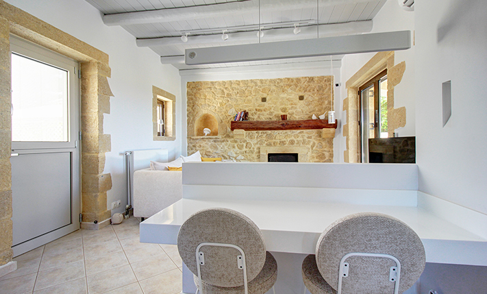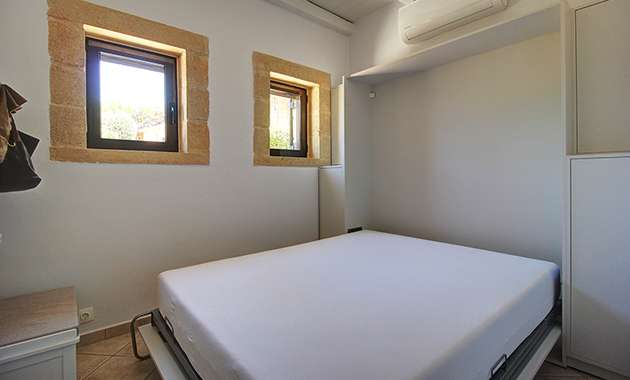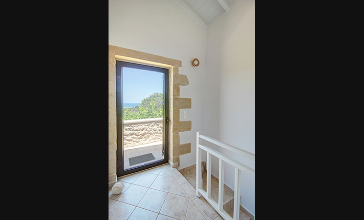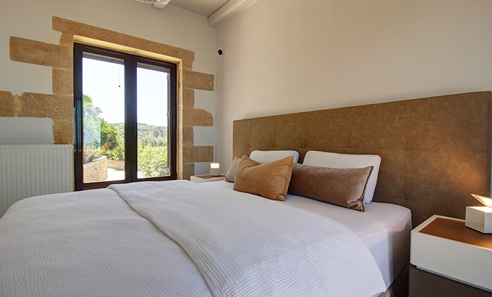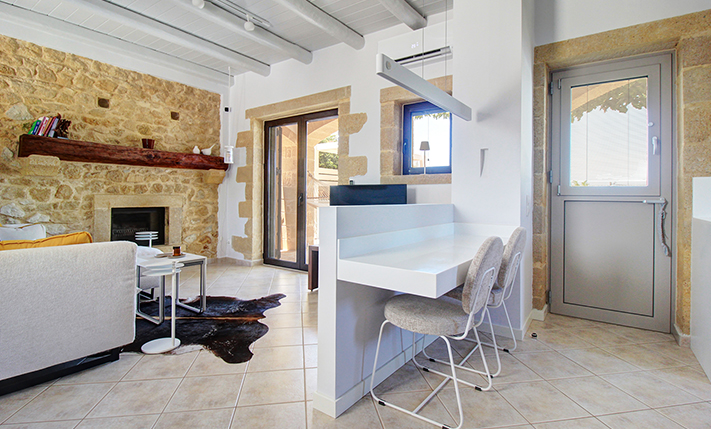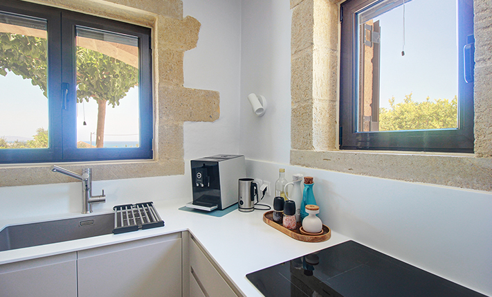 The residence is built from local stone and is arranged over two levels. The ground floor consists of an open-plan living room and kitchen area, subtly separated by a breakfast bar. The kitchen is new, handcrafted, and features a large Corian countertop with premium appliances and drinking water filtration. In the living room, there is a traditional stone fireplace which, apart from being functional, adds warmth to this already tasteful space. The ground floor also includes a guest bathroom with a shower cabin and a bedroom that can serve as a guest room, office, or storage area, equipped with a fold-away bed for flexibility. An internal staircase leads to the upper floor, where there are two bedrooms, each with access to its own private balcony. On this level, there is also a bathroom with a bathtub and a washing machine. A notable feature of the upper floor is the abundance of natural light and the high ceilings. A sea-facing balcony offers the perfect spot not only for enjoying breakfast but also for taking in a beautiful sunset at the end of each day.
