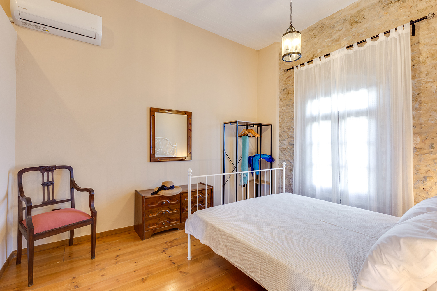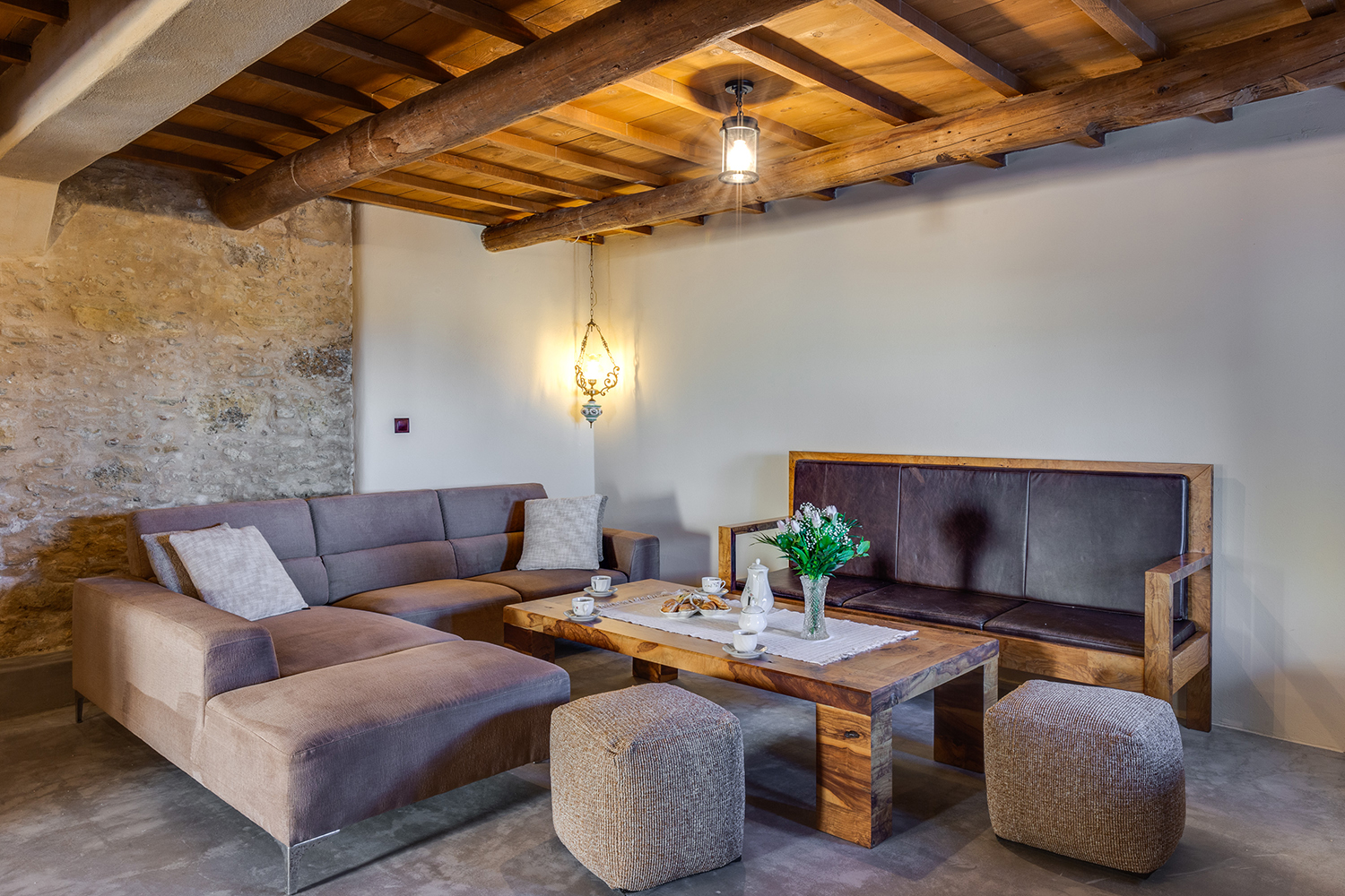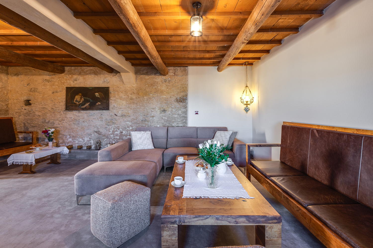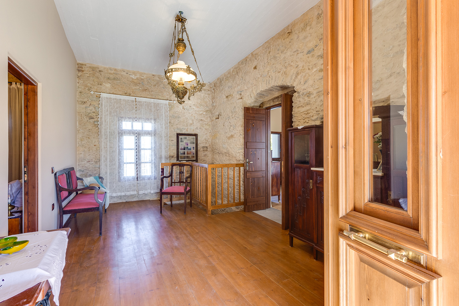 The residence is independent and has a large garden with grass, courtyards and parking spaces. It is arranged over two levels and includes a large dining area with kitchen, separate living space, three comfortable bedrooms and a total of 3 bathrooms. The kitchen has a marble sink and countertop as well as many olive wood cabinets. Many of the furniture have also been made from the same wood while many of the materials that existed before the repair have been reused, so that an impressive result with a strong traditional character has been achieved. The building has a timeless grandeur and large spaces with excellent functionality.