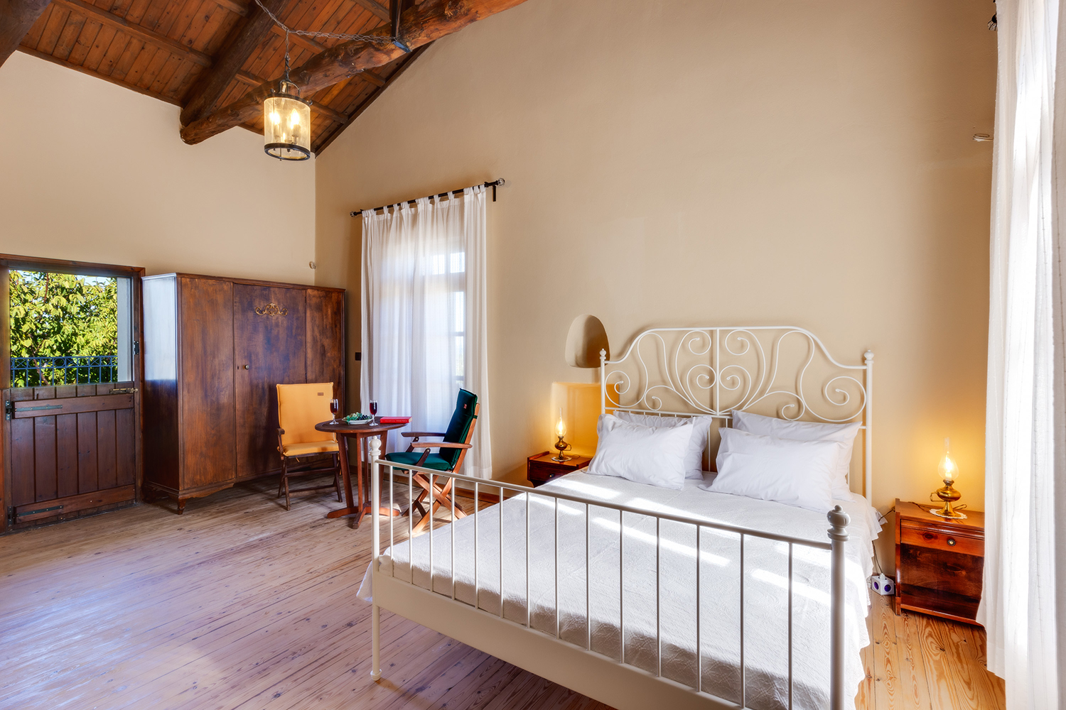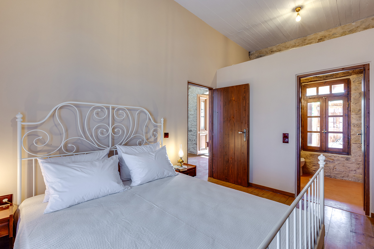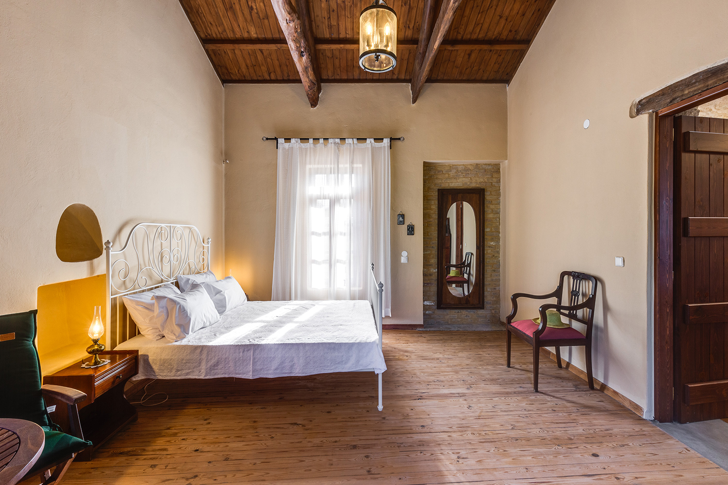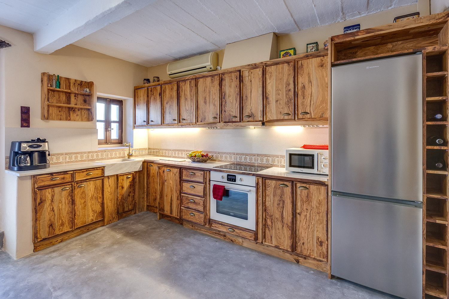 The residence is independent and has a large garden with grass, courtyards and parking spaces. It is arranged over two levels and includes a large dining area with kitchen, separate living space, three comfortable bedrooms and a total of 3 bathrooms. The kitchen has a marble sink and countertop as well as many olive wood cabinets. Many of the furniture have also been made from the same wood while many of the materials that existed before the repair have been reused, so that an impressive result with a strong traditional character has been achieved. The building has a timeless grandeur and large spaces with excellent functionality.