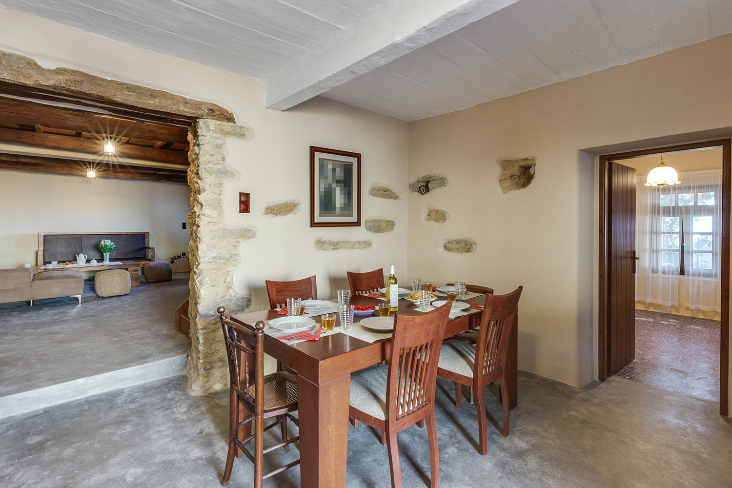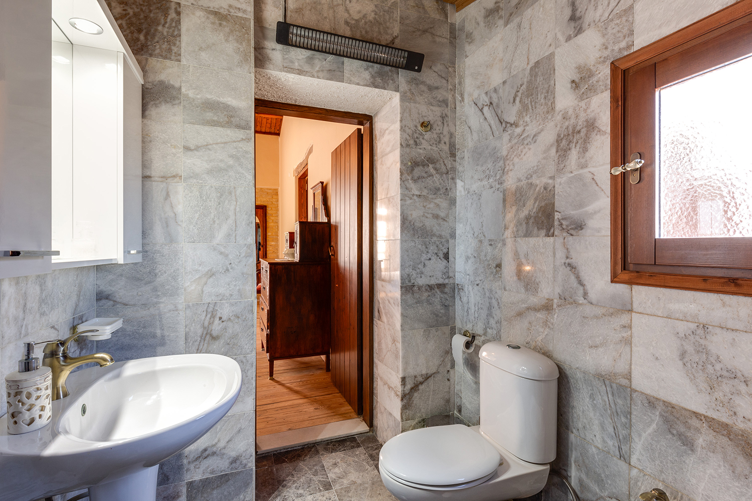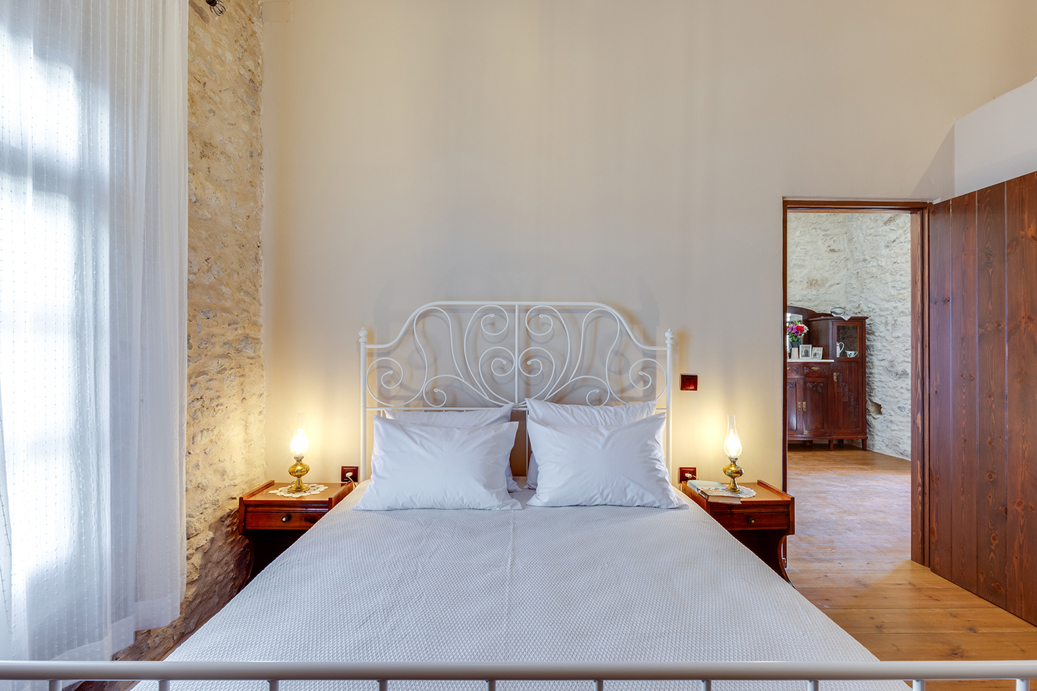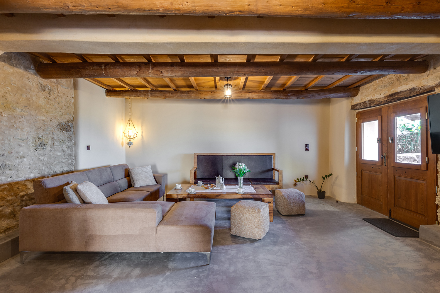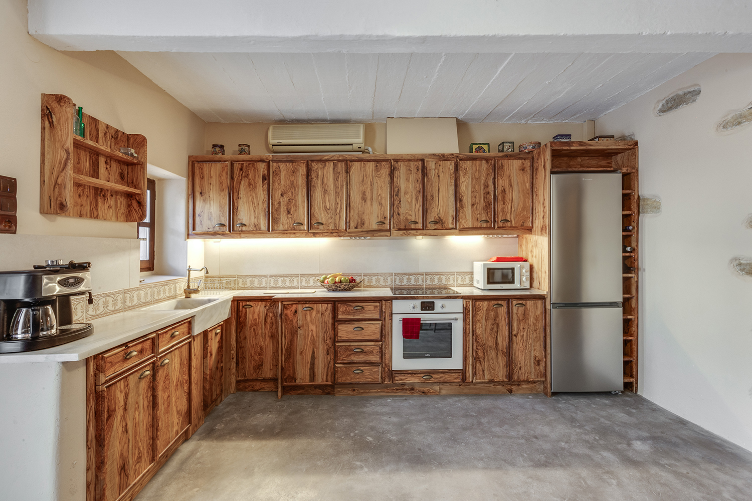 The residence is independent and has a large garden with grass, courtyards and parking spaces. It is arranged over two levels and includes a large dining area with kitchen, separate living space, three comfortable bedrooms and a total of 3 bathrooms. The kitchen has a marble sink and countertop as well as many olive wood cabinets. Many of the furniture have also been made from the same wood while many of the materials that existed before the repair have been reused, so that an impressive result with a strong traditional character has been achieved. The building has a timeless grandeur and large spaces with excellent functionality.