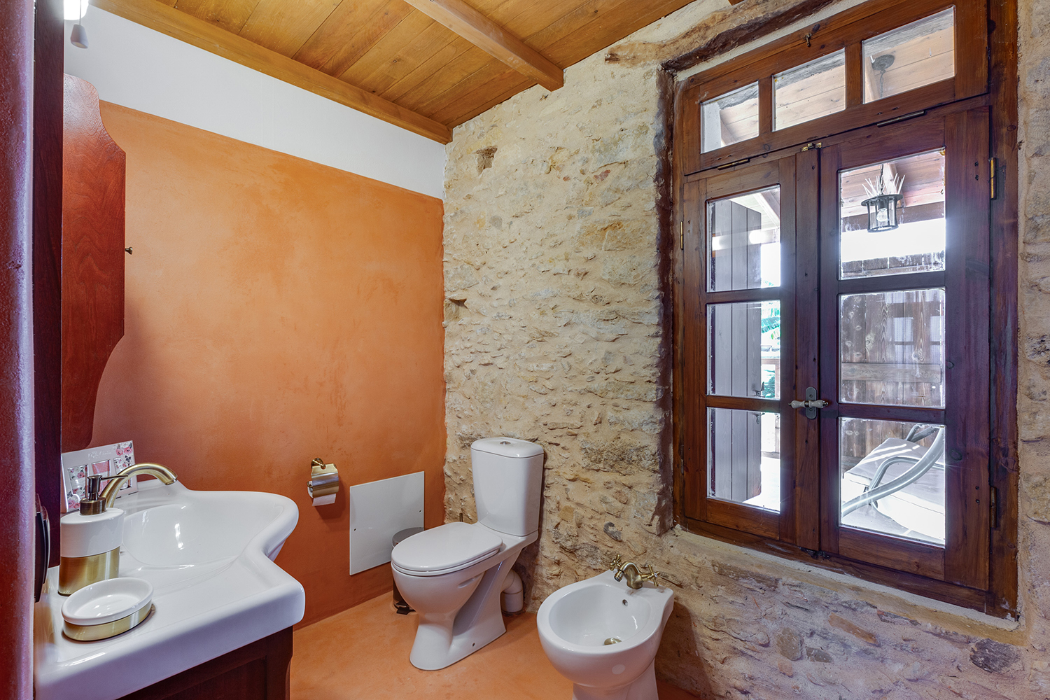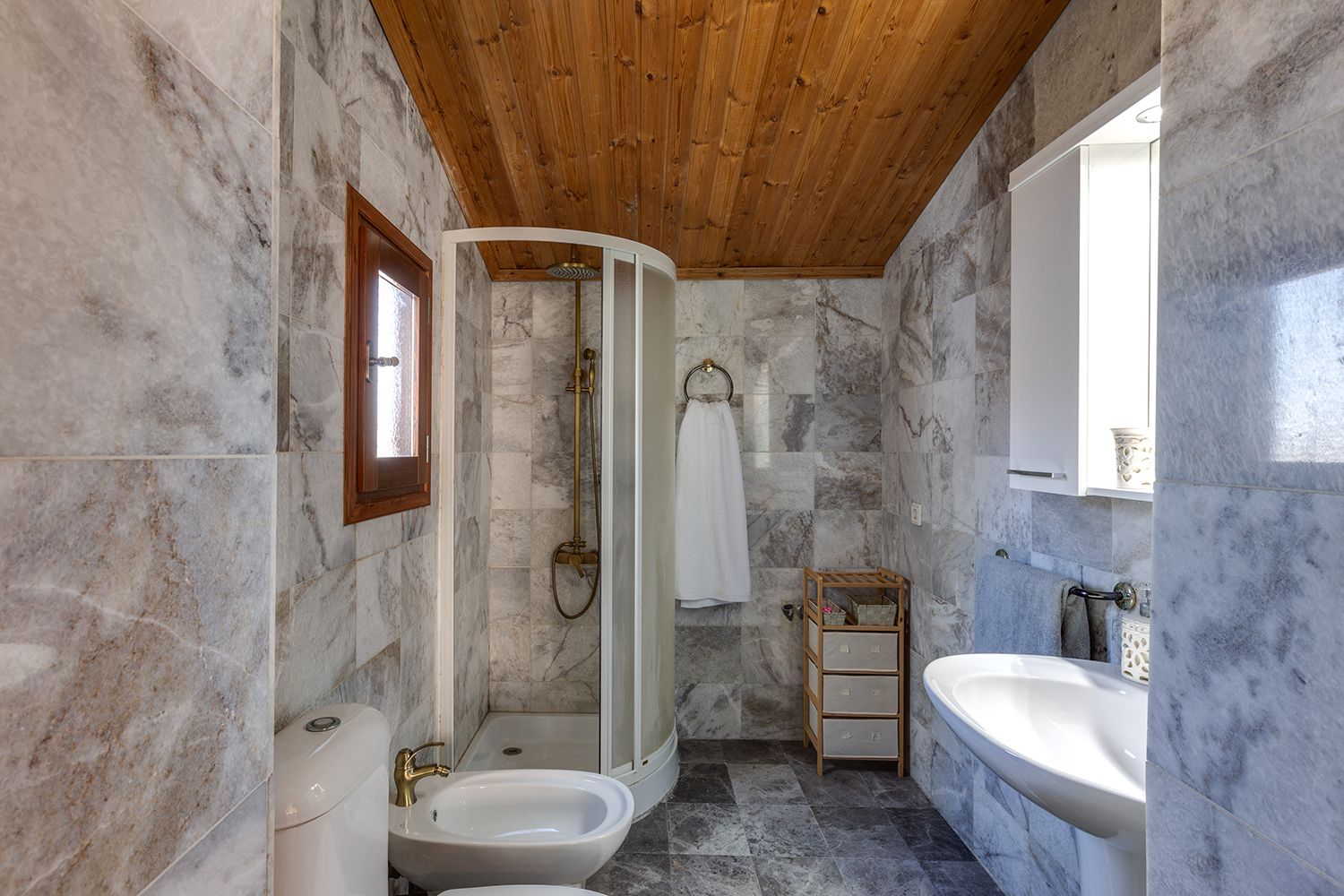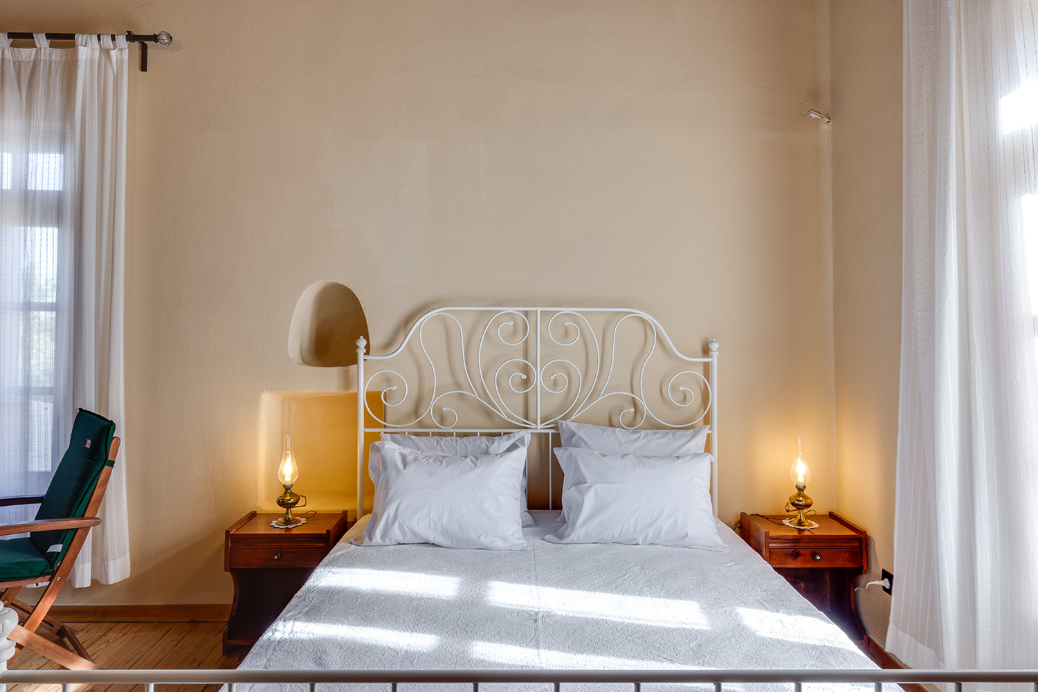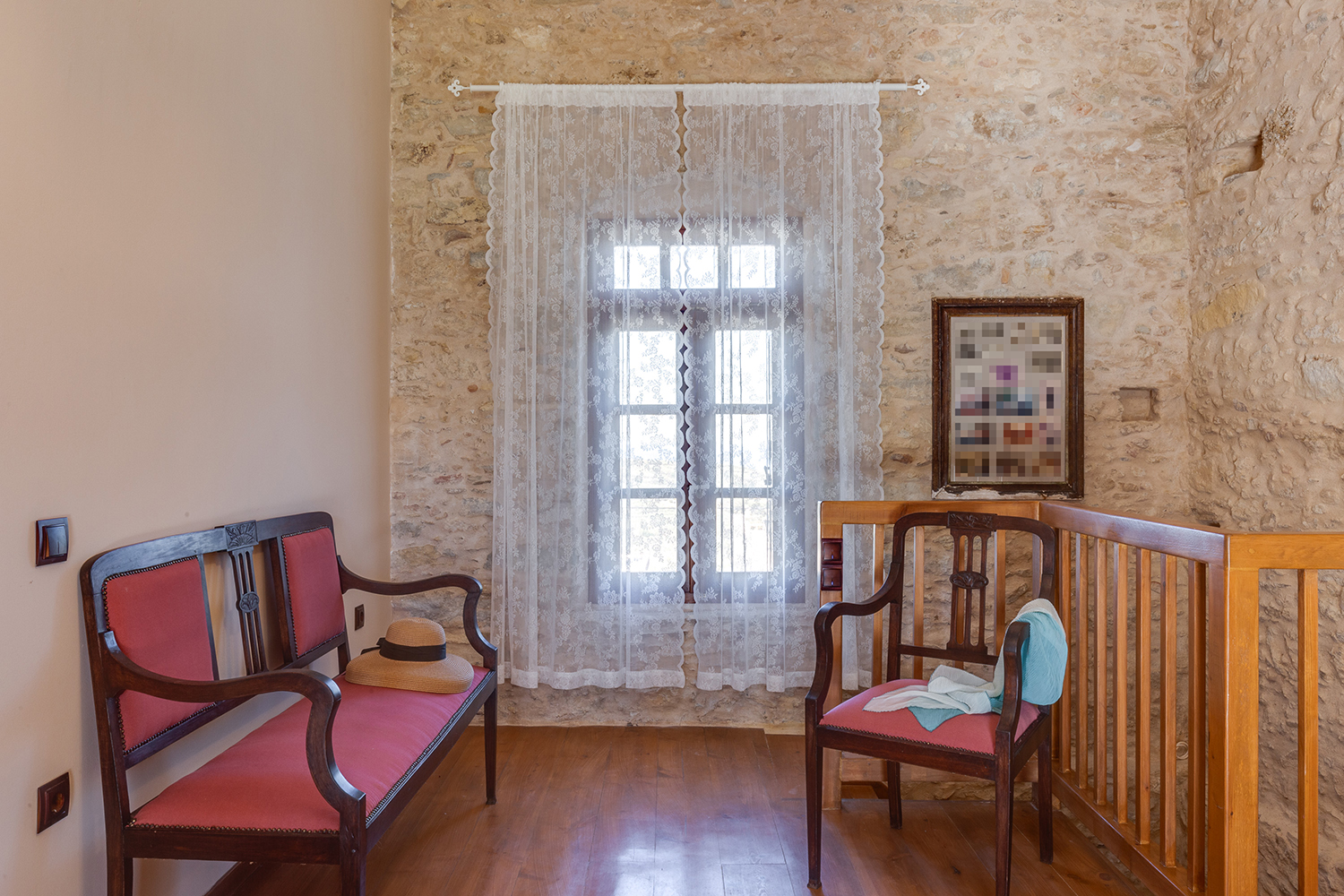 The residence is independent and has a large garden with grass, courtyards and parking spaces. It is arranged over two levels and includes a large dining area with kitchen, separate living space, three comfortable bedrooms and a total of 3 bathrooms. The kitchen has a marble sink and countertop as well as many olive wood cabinets. Many of the furniture have also been made from the same wood while many of the materials that existed before the repair have been reused, so that an impressive result with a strong traditional character has been achieved. The building has a timeless grandeur and large spaces with excellent functionality.