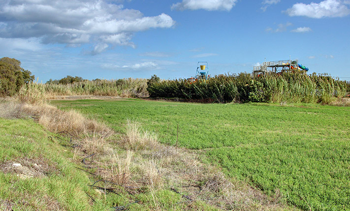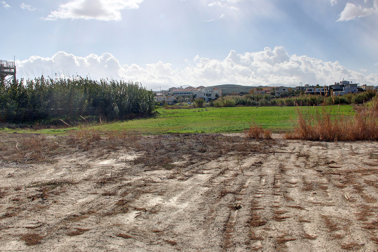 Η ιδιοκτησία είναι σε ένα εξαιρετικό σημείο, ελάχιστα βήματα από την εκτεταμένη παραλία της περιοχής. Πρόκειται για δύο τμήματα που σχηματίζουν μία ορθογώνια έκταση που χωρίζεται από παλιό αγροτικό δρόμο. Το μεγαλύτερο από τα δύο είναι ένα 4,432 m² οικόπεδο, το οποίο έχει καλό ορθογώνιο σχήμα και διαθέτει προσόψεις κατά μήκος της βόρειας και κατά μήκος της δυτικής όψης. Το οικόπεδο αυτή τη στιγμή χρησιμοποιείται για εποχικές καλλιέργειες. Το μικρότερο τμήμα είναι ένα μη οικοδομήσιμο αγροτεμάχιο 666 m² από την πλευρά της θάλασσας με σχεδόν τετράγωνο σχήμα. Το έδαφος είναι σχεδόν επίπεδο με μία ελαφρά υπερύψωση στο βάθος του και επομένως αν κατασκευαστεί επάνω όροφος θα έχετε εξαιρετική θέα μέχρι τη θάλασσα.