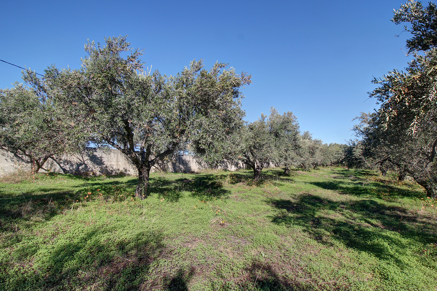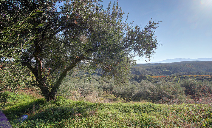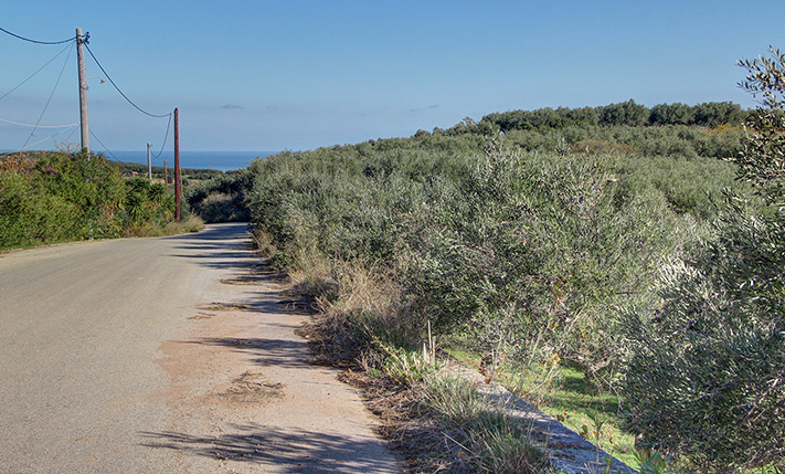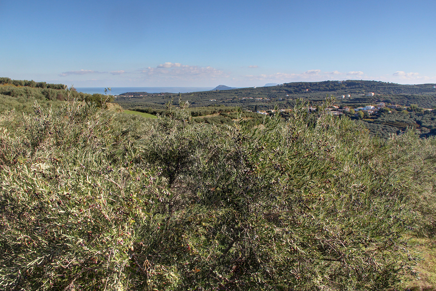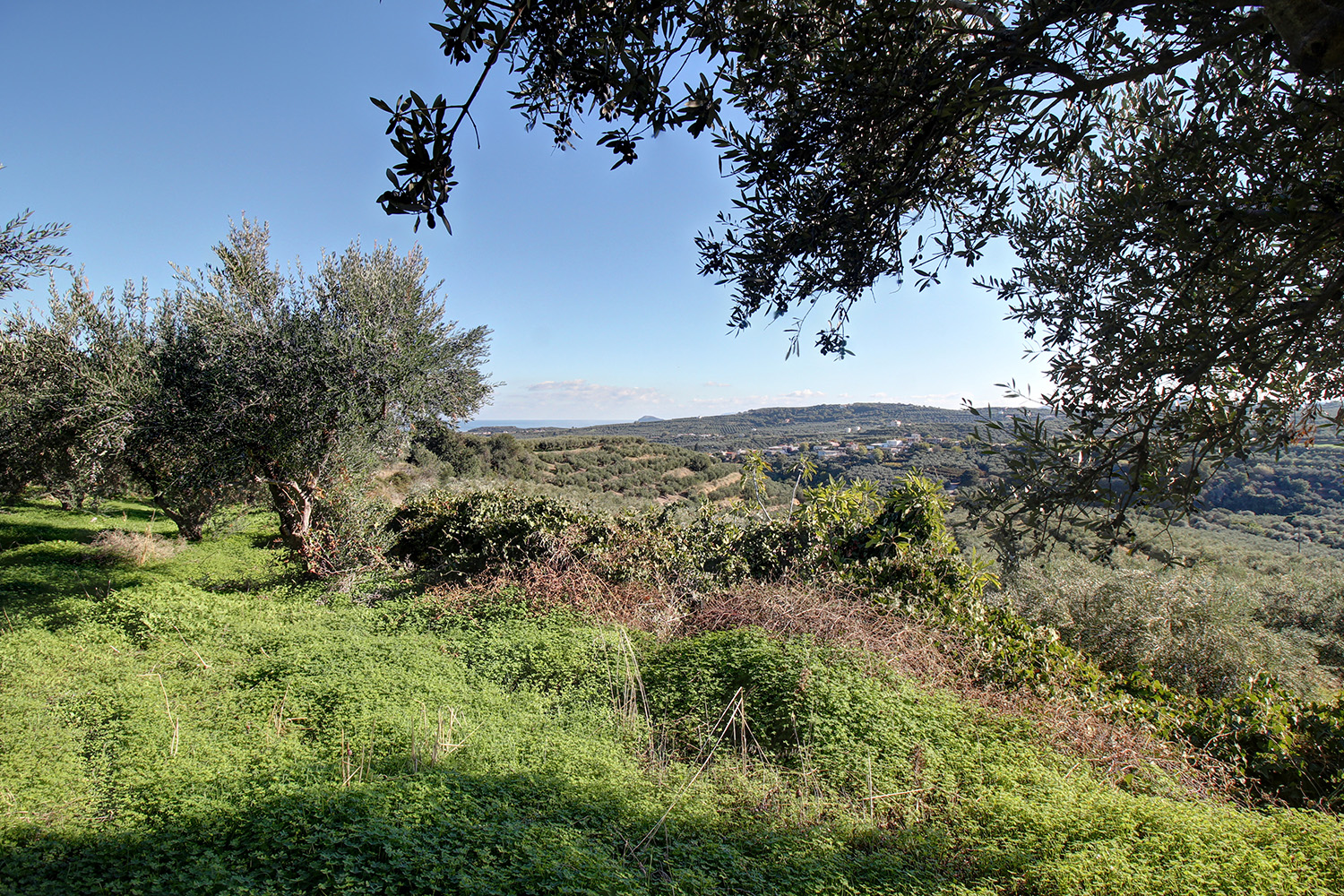 Το οικόπεδο έχει μεγάλη δυτική όψη σε έναν αναγνωρισμένο επαρχιακό δρόμο ενώ είναι γωνιακό με επιπλέον προσόψεις σε αγροτικούς δρόμους βόρεια και ανατολικά του. Το έδαφος έχει ήπια ανατολική κλίση. Ξεκινά από κορυφογραμμή στην υψηλότερη στάθμη του σε ένα σημείο, όπου αν οικοδομήσετε θα έχετε εντυπωσιακή θέα 270° μέχρι τη θάλασσα βόρεια, επάνω από τους αμέτρητους ελαιώνες της περιοχής και μέχρι τα Λευκά Όρη νοτιοανατολικά. Επάνω στο αγροτεμάχιο υπάρχουν 70 ώριμα και παραγωγικά ελαιόδεντρα, από τα οποία μπορείτε να αφαιρέσετε όσα επιθυμείτε προκειμένου να εξυπηρετηθεί οποιαδήποτε μελέτη.