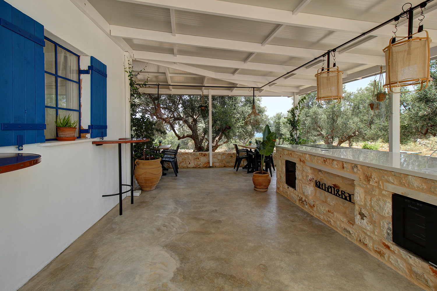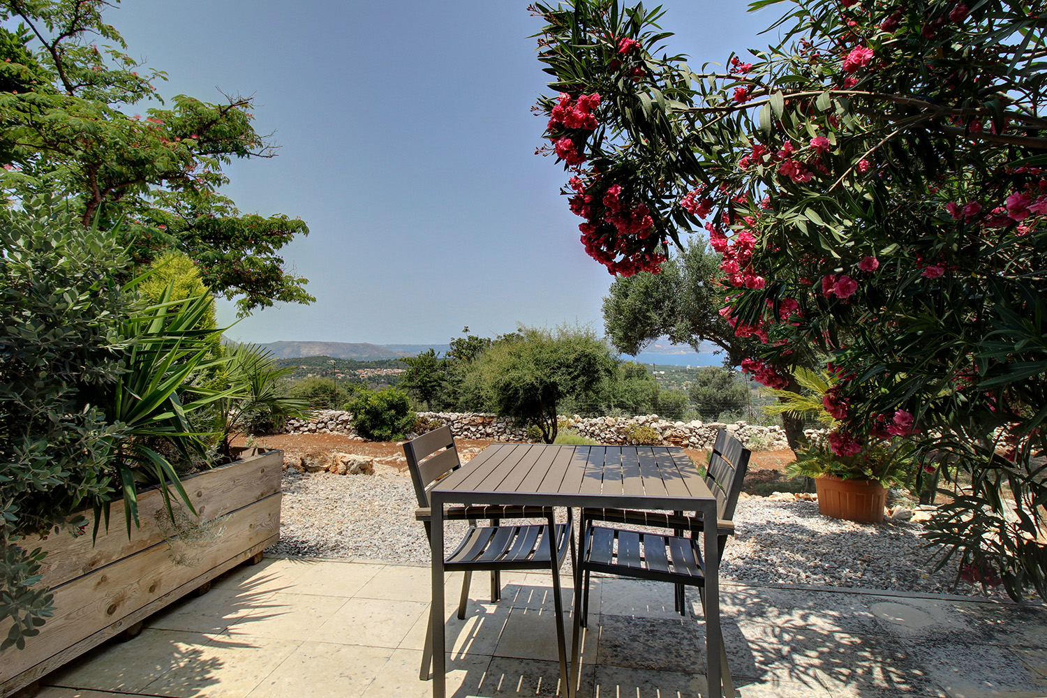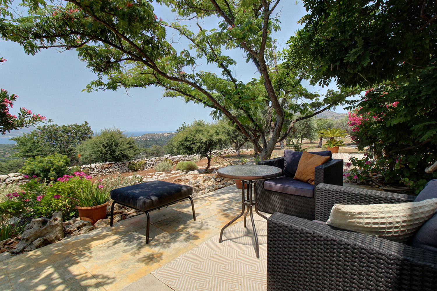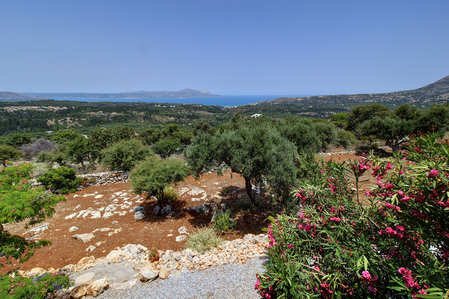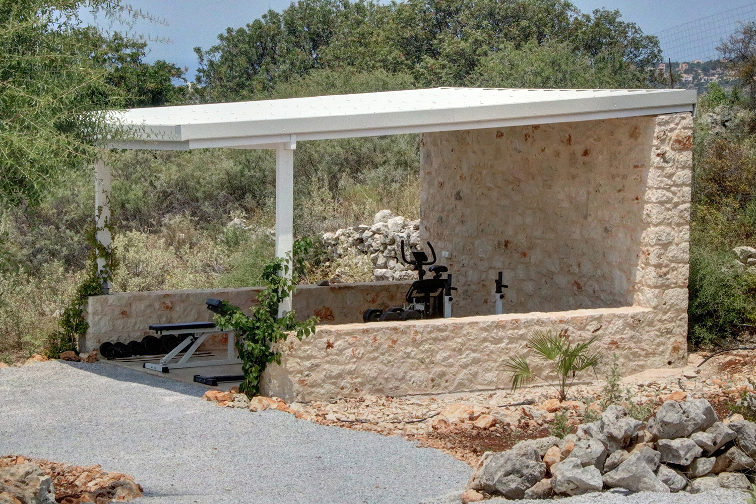 Το οικόπεδο είναι ελαφρώς επικλινές και έχει ανεμπόδιστη θέα στη θάλασσα από όλα τα σημεία του. Είναι επίσης οριοθετημένο στο σύνολό του και ιδανικό αν έχετε παιδιά ή κατοικίδια. Περιμετρικά του κτηρίου έχουν φτιαχτεί όμορφοι βραχόκηποι, ένας χώρος στάθμευσης, ένας εντυπωσιακός χώρος πρωινού με εξωτερικό μπαρ καθώς και ένας στεγασμένος χώρος γυμναστηρίου. Υπάρχουν, επίσης, πολλές επιλογές για να απολαύσετε τον καφέ ή το γεύμα σας υπό σκιά ή να χαλαρώσετε κάτω από τον ζεστό καλοκαιρινό ήλιο. Το μέγεθος του οικοπέδου σας δίνει τη δυνατότητα να προσθέσετε πισίνα, ένα γήπεδο τένις ή οτιδήποτε άλλο καλύπτει τις ανάγκες σας. Ο κήπος του ακινήτου περιλαμβάνει, μεταξύ άλλων, 15 παραγωγικά ελαιόδεντρα που αρκούν για να καλύψουν τις ανάγκες σε ελαιόλαδο μίας μέσης οικογένειας. Παρακείμενα του οικοπέδου υπάρχει ένα επιπλέον δασικό τμήμα 823 m² το οποίο δεν συμπεριλαμβάνεται στην πώληση, αλλά είναι εντός της περίφραξης του ακινήτου και θα το χρησιμοποιείτε κατά αποκλειστικότητα.