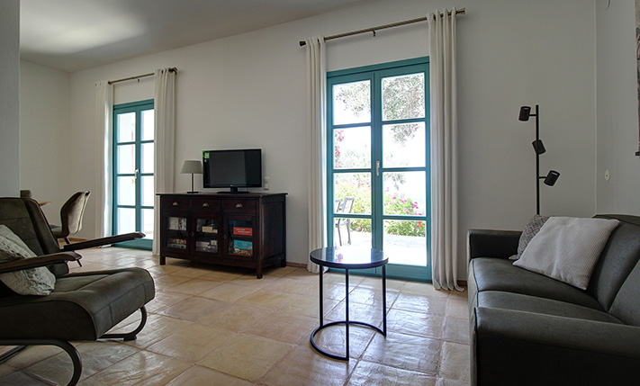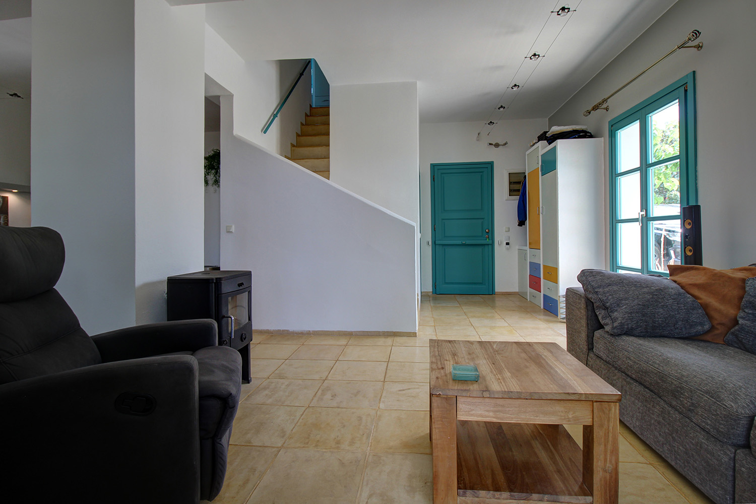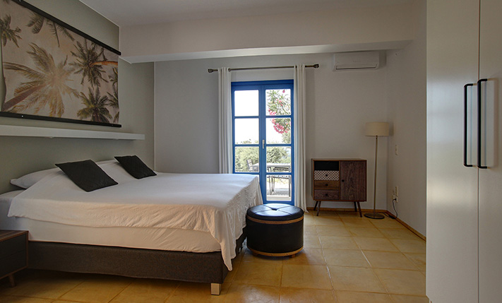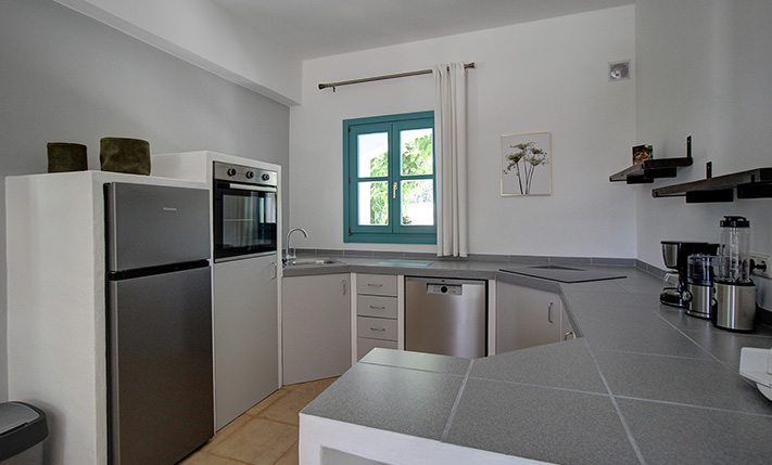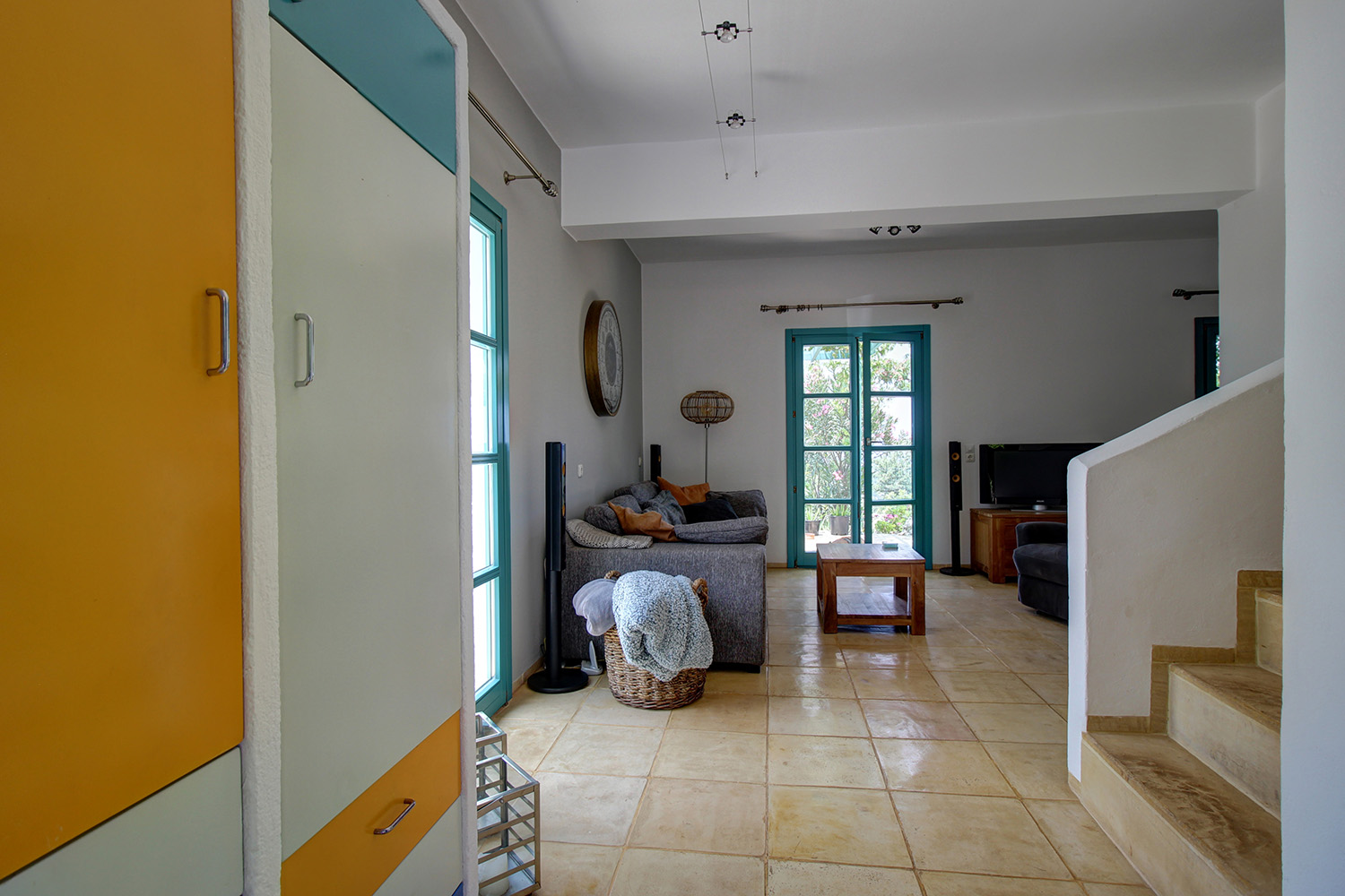 Όλοι οι εσωτερικοί χώροι είναι προσανατολισμένοι προς τη θάλασσα και έχουν εξαιρετική, ανεμπόδιστη θέα. Οι δύο μεζονέτες έχουν ίδια διαρρύθμιση. Κάθε μία στο ισόγειο έχει μπάνιο και μεγάλο ενιαίο χώρο σαλονιού, τραπεζαρίας και κουζίνας. Σε κάθε σαλόνι υπάρχει έξοδος στις βορειοδυτικές βεράντες. Επάνω υπάρχουν από ένα μπάνιο και από δύο υπνοδωμάτια, στην καθεμία. Κάθε γκαρσονιέρα είναι, επίσης, προσβάσιμη ανεξάρτητα και έχει δικό της μπάνιο με ντους. Από όλους τους χώρους του επάνω ορόφου υπάρχουν έξοδοι σε μεγάλα μπαλκόνια.
