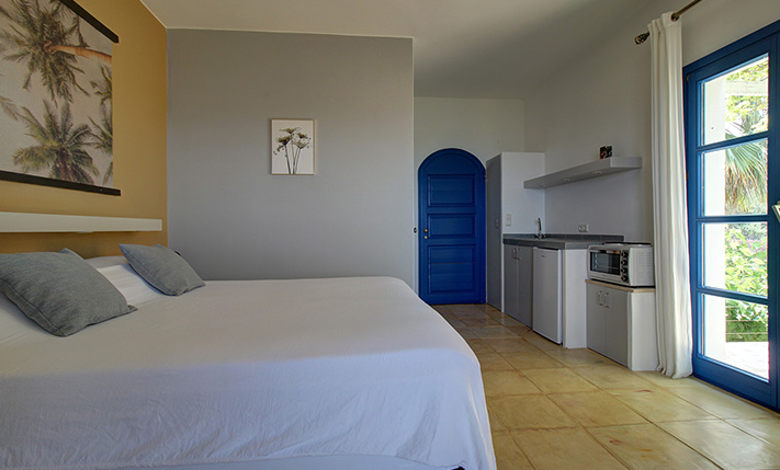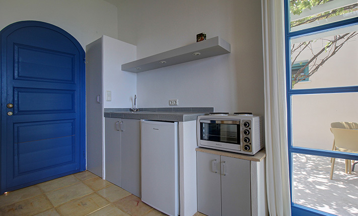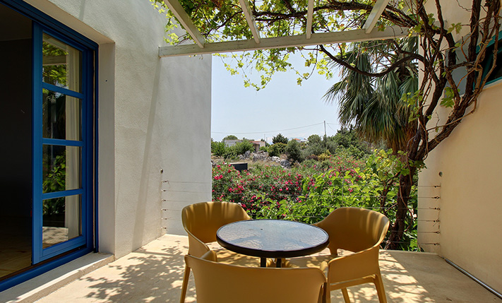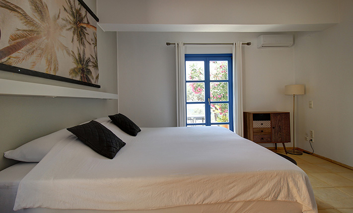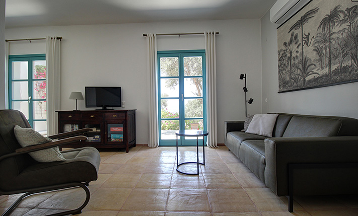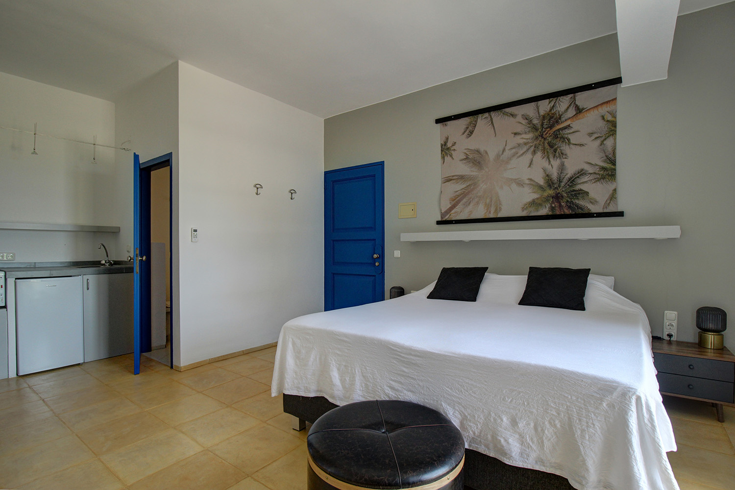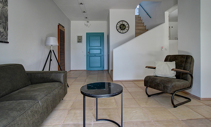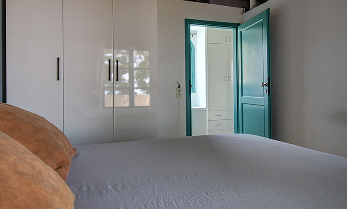 Όλοι οι εσωτερικοί χώροι είναι προσανατολισμένοι προς τη θάλασσα και έχουν εξαιρετική, ανεμπόδιστη θέα. Οι δύο μεζονέτες έχουν ίδια διαρρύθμιση. Κάθε μία στο ισόγειο έχει μπάνιο και μεγάλο ενιαίο χώρο σαλονιού, τραπεζαρίας και κουζίνας. Σε κάθε σαλόνι υπάρχει έξοδος στις βορειοδυτικές βεράντες. Επάνω υπάρχουν από ένα μπάνιο και από δύο υπνοδωμάτια, στην καθεμία. Κάθε γκαρσονιέρα είναι, επίσης, προσβάσιμη ανεξάρτητα και έχει δικό της μπάνιο με ντους. Από όλους τους χώρους του επάνω ορόφου υπάρχουν έξοδοι σε μεγάλα μπαλκόνια.