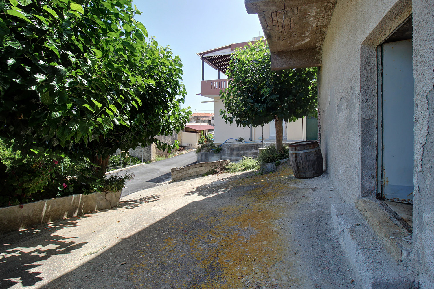 Η ιδιοκτησία είναι στο κάτω επίπεδο ενός διώροφου κτηρίου. Το κτήριο έχει δύο απέναντι προσόψεις σε δρόμους με άσφαλτο και έχει κατασκευαστεί σε οικόπεδο με κλίση, η οποία είναι αρκετή ώστε κάθε επίπεδο να είναι ισόγειο με δική του πρόσβαση. Ο εν λόγω χώρος έχει βόρειο προσανατολισμό και στην πρόσοψή του υπάρχει άνετη αυλή, η οποία προσφέρει εντυπωσιακή θέα επάνω από τους αμέτρητους ελαιώνες της περιοχής και μέχρι τη θάλασσα στο βάθος.