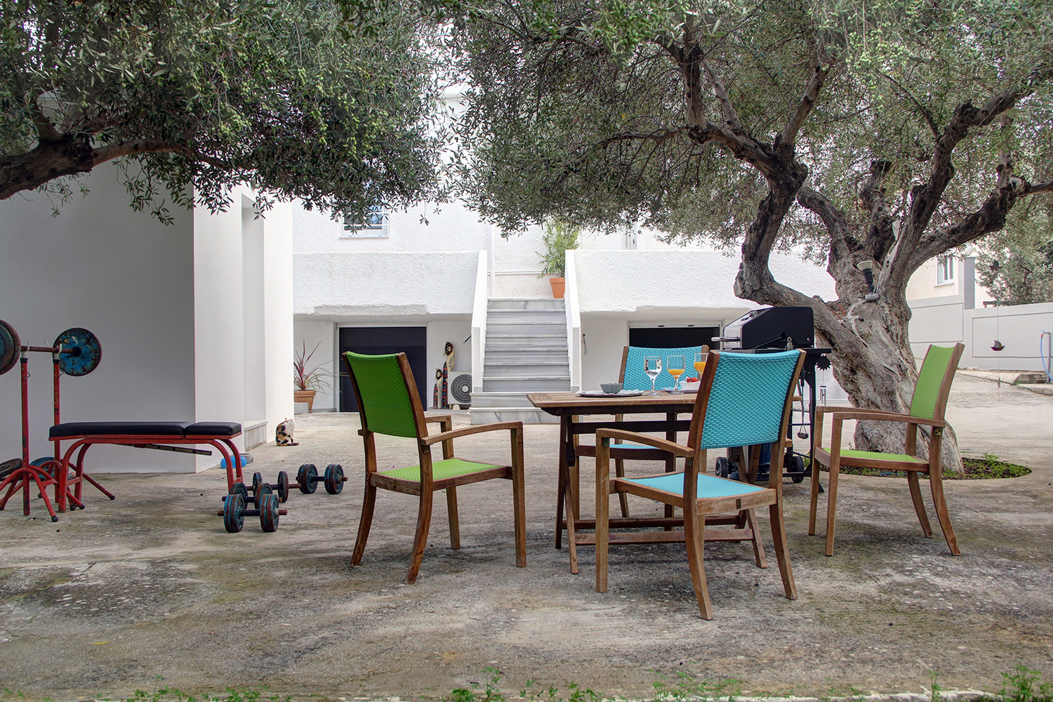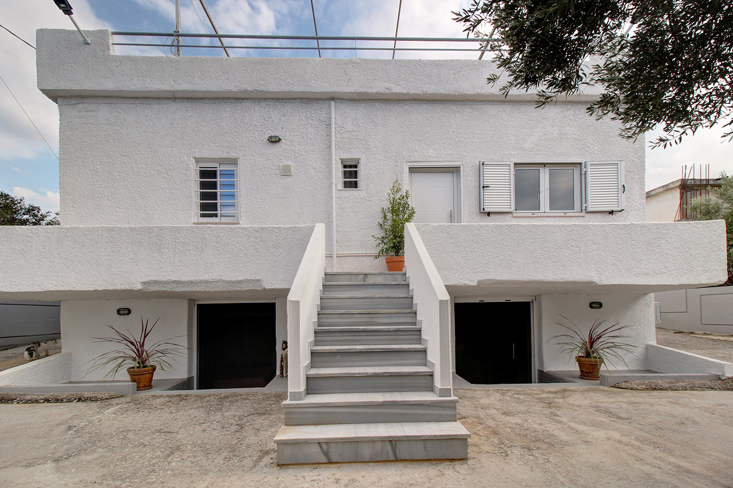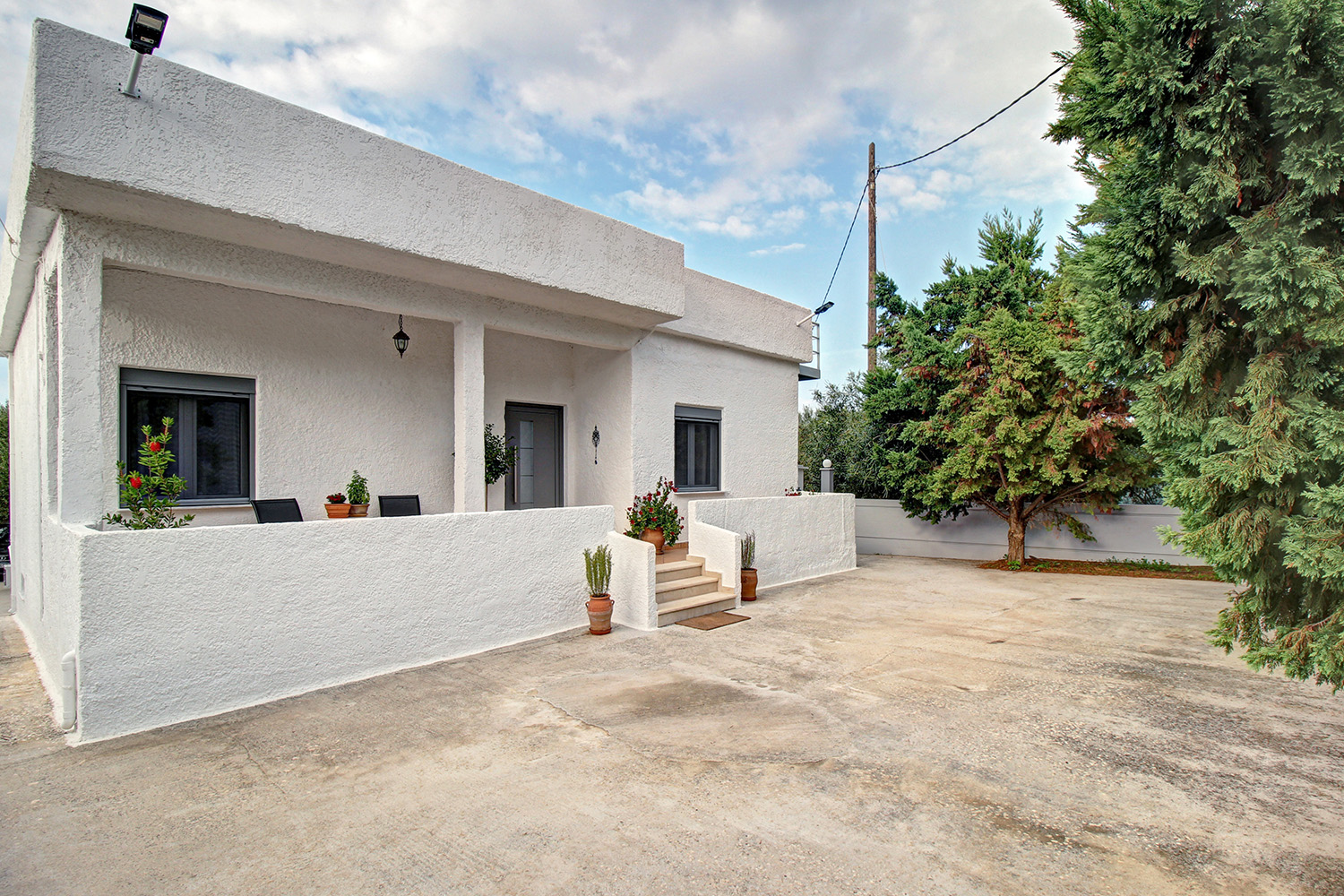 Το σπίτι είναι αυτόνομο και διαμπερές. Το οικόπεδο είναι οριοθετημένο με ένα τσιμεντένιο τοιχίο ύψους 1,5 μέτρου και έχει φωτισμό περιμετρικά του. Έχει προβλεφθεί επίσης η δυνατότητα ανάπτυξης της περίφραξης σε ύψος. Υπάρχει πρόσβαση μέσω μίας σιδερένιας ηλεκτρικής πόρτας. Η κατοικία είναι κτισμένη στο μέσον του οικοπέδου, το οποίο προσφέρει ηρεμία και ιδιωτικότητα. Τόσο στην πρόσοψη όσο και στο πίσω μέρος του οικοπέδου υπάρχει χώρος για στάθμευση αυτοκινήτων. Στη μπροστινή αυλή υπάρχουν κυπαρίσσια Leyland περίφραξης με αυτόματο πότισμα κατά μήκος της. Το οικόπεδο έχει δύο προσόψεις σε απέναντι δρόμους και στην πίσω όψη υπάρχουν περίπου 30 μεγάλα και παραγωγικά ελαιόδεντρα, τα οποία αρκούν για να υπερκαλύψουν τις ανάγκες μίας μέσης οικογένειας σε ελαιόλαδο. Επί του οικοπέδου υπάρχει, επίσης, υψηλός συντελεστής δόμησης, ο οποίος σας επιτρέπει να έχετε ως και 640 m² για οικιστική χρήση ώστε να μπορείτε να προσθέσετε περισσότερα δωμάτια οριζόντια ή σε επάνω όροφο, ή ακόμα και να κατασκευάσετε ένα μικρό συγκρότημα αυτόνομων κατοικιών.