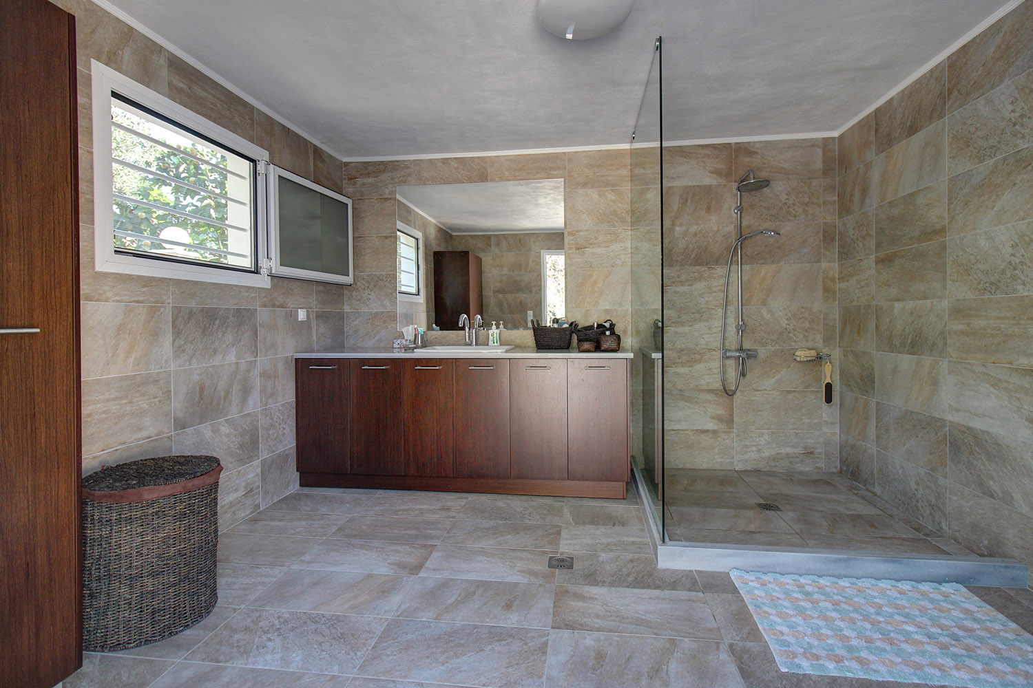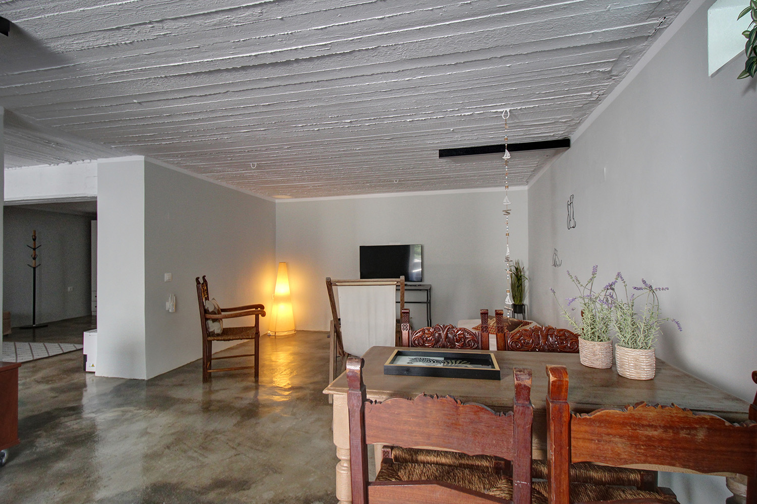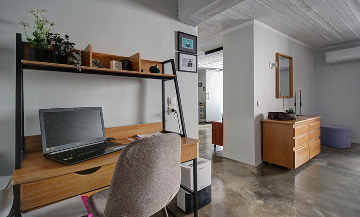 Το σπίτι είναι υπερυψωμένο και πριν την κύρια είσοδο υπάρχουν μερικά σκαλοπάτια που οδηγούν σε μία σκεπαστή βεράντα. Στο εσωτερικό συναντάμε έναν κεντρικό διάδρομο που επικοινωνεί με όλους τους χώρους. Υπάρχουν συνολικά τέσσερα μεγάλα δωμάτια, ένα μπάνιο καθώς και ένα ακόμη ανεξάρτητο πολυτελές εξωτερικό μπάνιο 17 m² με πολλά ντουλάπια και ένα εντοιχισμένο μεγάλο πλυντήριο ρούχων, το οποίο κατασκευάστηκε πρόσφατα στο πίσω μέρος της κατοικίας. Στο ένα δωμάτιο βρίσκεται μία πλήρως εξοπλισμένη κουζίνα με πολλά ντουλάπια και όλες τις ηλεκτρικές συσκευές (ψυγειοκαταψύκτη, ηλεκτρική κουζίνα, απορροφητήρα, μεγάλο πλυντήριο πιάτων, φούρνο μικροκυμάτων), η τραπεζαρία και το καθιστικό. Ο χώρος αυτός έχει πρόσβαση στο πίσω κήπο και στην ταράτσα. Τα άλλα τρία δωμάτια χρησιμοποιούνται τώρα σαν κρεβατοκάμαρες και διατίθενται επιπλωμένα. Τα δυο εξ αυτών είναι ιδιαίτερα ευρύχωρα. Τα δωμάτια έχουν πρόσβαση σε μία ευρύχωρη βεράντα με πρόσβαση στη πίσω αυλή και την ταράτσα του σπιτιού.