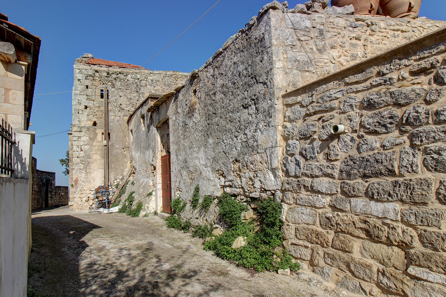 Ως το σημείο φτάνει ένας τσιμεντόδρομος και στην πρόσοψη του ακινήτου υπάρχει ένας ψηλός πετρότοιχος που προσφέρει άριστη ιδιωτικότητα. Μετά την όποια αναπαλαίωση έχετε τη δυνατότητα να φτιάξετε μία ή δύο στεγασμένες ιδιωτικές θέσεις στάθμευσης στο τμήμα του κτηρίου που εφάπτεται στο δρόμο ή σε ένα κομμάτι της αυλής. Το κτήριο ακολουθεί την παραδοσιακή κρητική διαρρύθμιση, στην οποία όλα τα δωμάτια περιβάλλουν την κεντρική αυλή και επικοινωνούν ανεξάρτητα με αυτήν. Το μεγαλύτερο μέρος του κτηρίου είναι ισόγειο ενώ υπάρχει και διώροφο τμήμα, από όπου μπορείτε να έχετε πρόσβαση σε μπαλκόνια με όμορφη θέα προς το χωριό και την κορυφογραμμή των Λευκών Ορέων. Το μέγεθος και η διαρρύθμιση της κατοικίας εξυπηρετούν ώστε να φτιάξετε δύο άνετες κρεβατοκάμαρες με ενιαίο χώρο σαλονιού-κουζίνας και ένα ή δύο μπάνια. Το ακίνητο ενδείκνυται για τουριστική εκμετάλλευση ενώ μπορεί να γίνει και μία πολύ λειτουργική μόνιμη ή εξοχική κατοικία για δική σας χρήση.