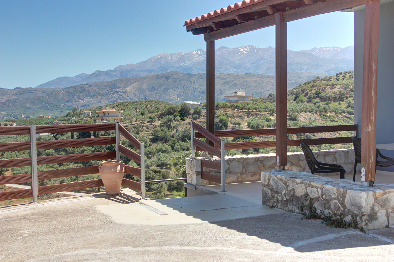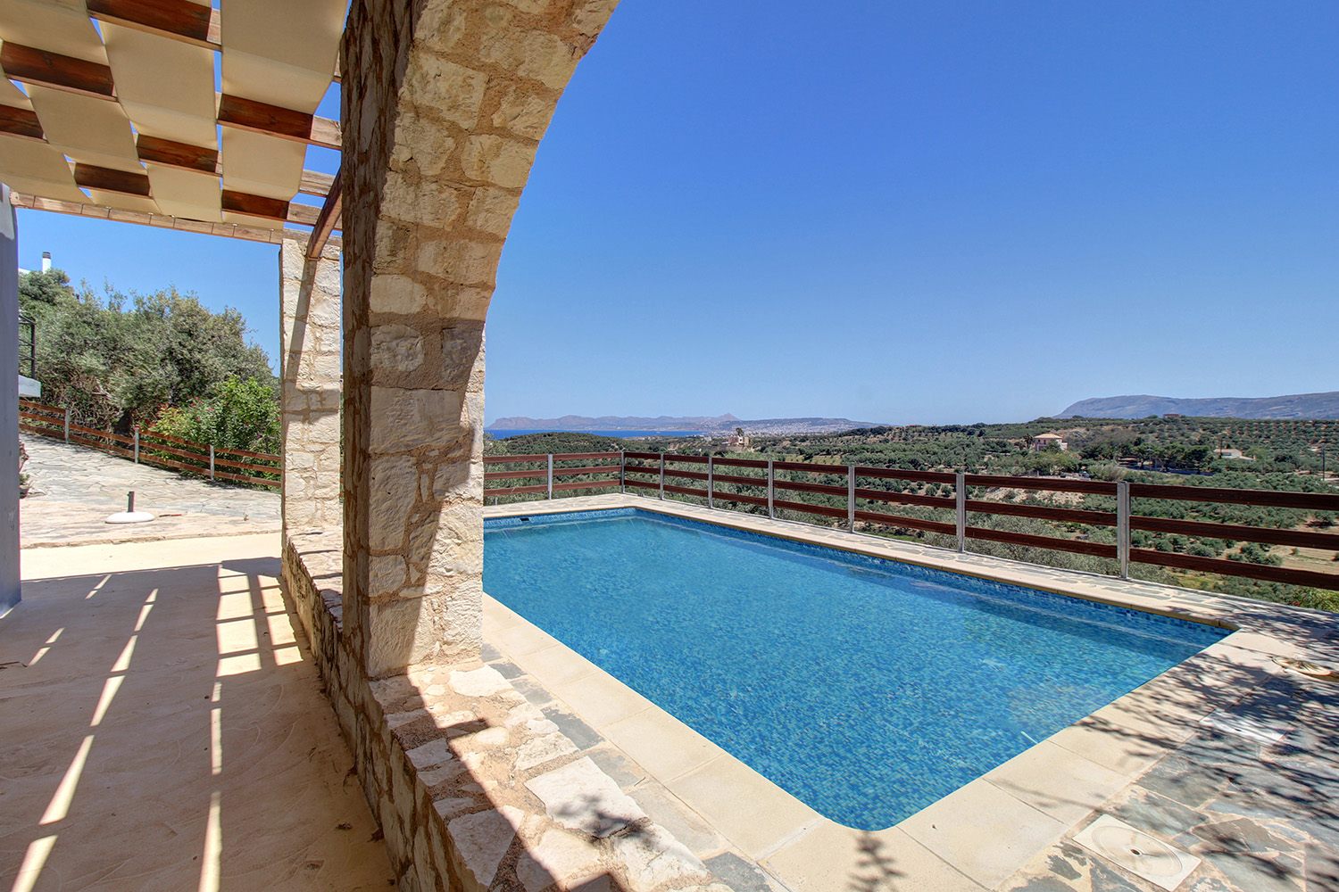 Η βίλα έχει κατασκευαστεί σε μία πλαγιά με νοτιοανατολικό προσανατολισμό από όπου προσφέρει μοναδική θέα στη θάλασσα αλλά και προς τα Λευκά Όρη στη νότια πλευρά. Το οικόπεδο του σπιτιού έχει δύο απέναντι προσόψεις στη χαμηλότερη και στην υψηλότερη στάθμη του. Η κατοικία έχει τοποθετηθεί στο ψηλότερο σημείο ενώ στην υπόλοιπη επιφάνεια συναντάμε 20 ώριμα και παραγωγικά ελαιόδεντρα, τα οποία αρκούν για να καλύψουν τις ανάγκες σε ελαιόλαδο μίας μέσης οικογένειας. Στην πρόσοψη του σπιτιού υπάρχουν ένας κήπος με γρασίδι και ένας άνετος χώρος στάθμευσης ενώ στην πίσω όψη βρίσκεται η 30 m² πισίνα, η οποία έχει καλή ιδιωτικότητα.
