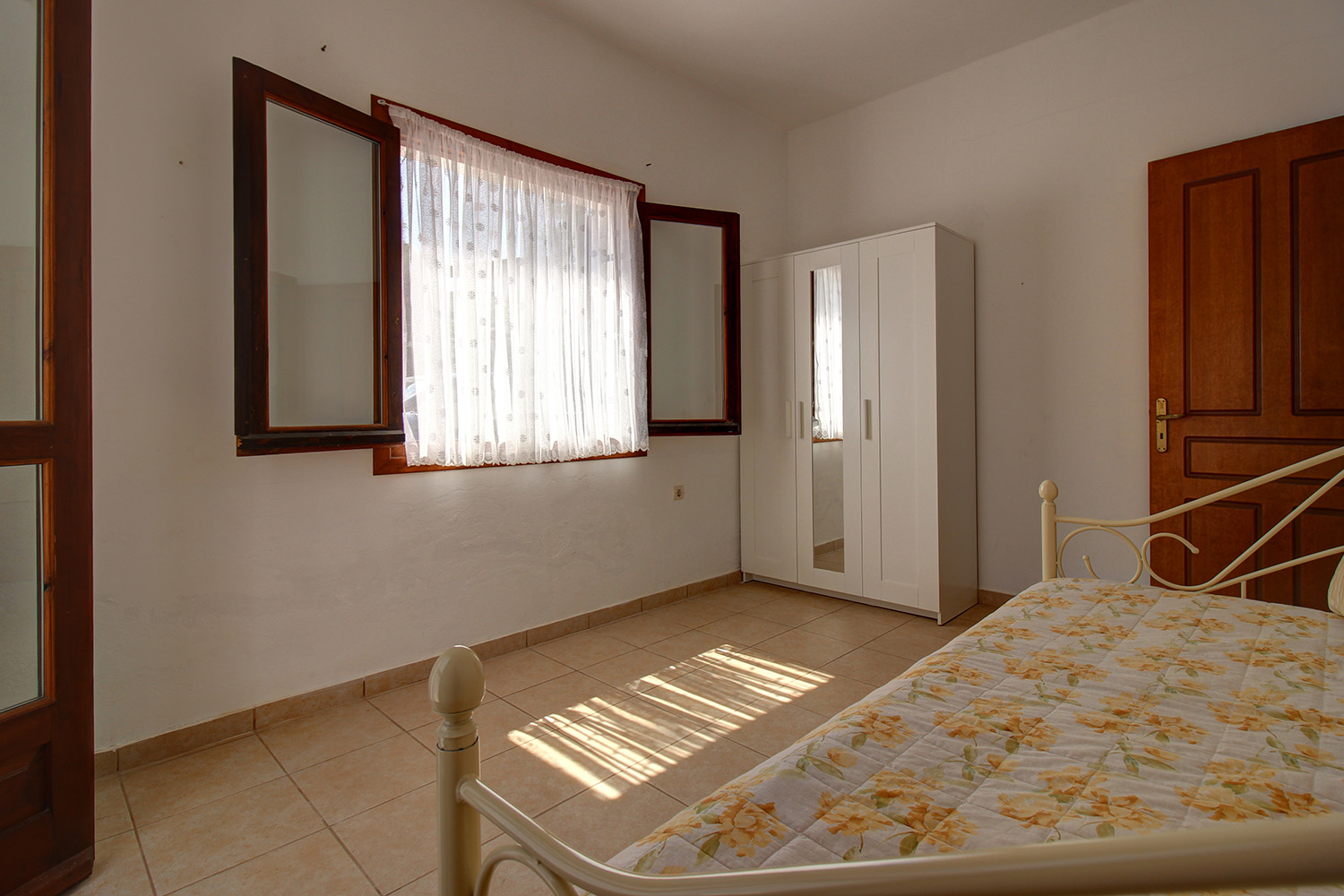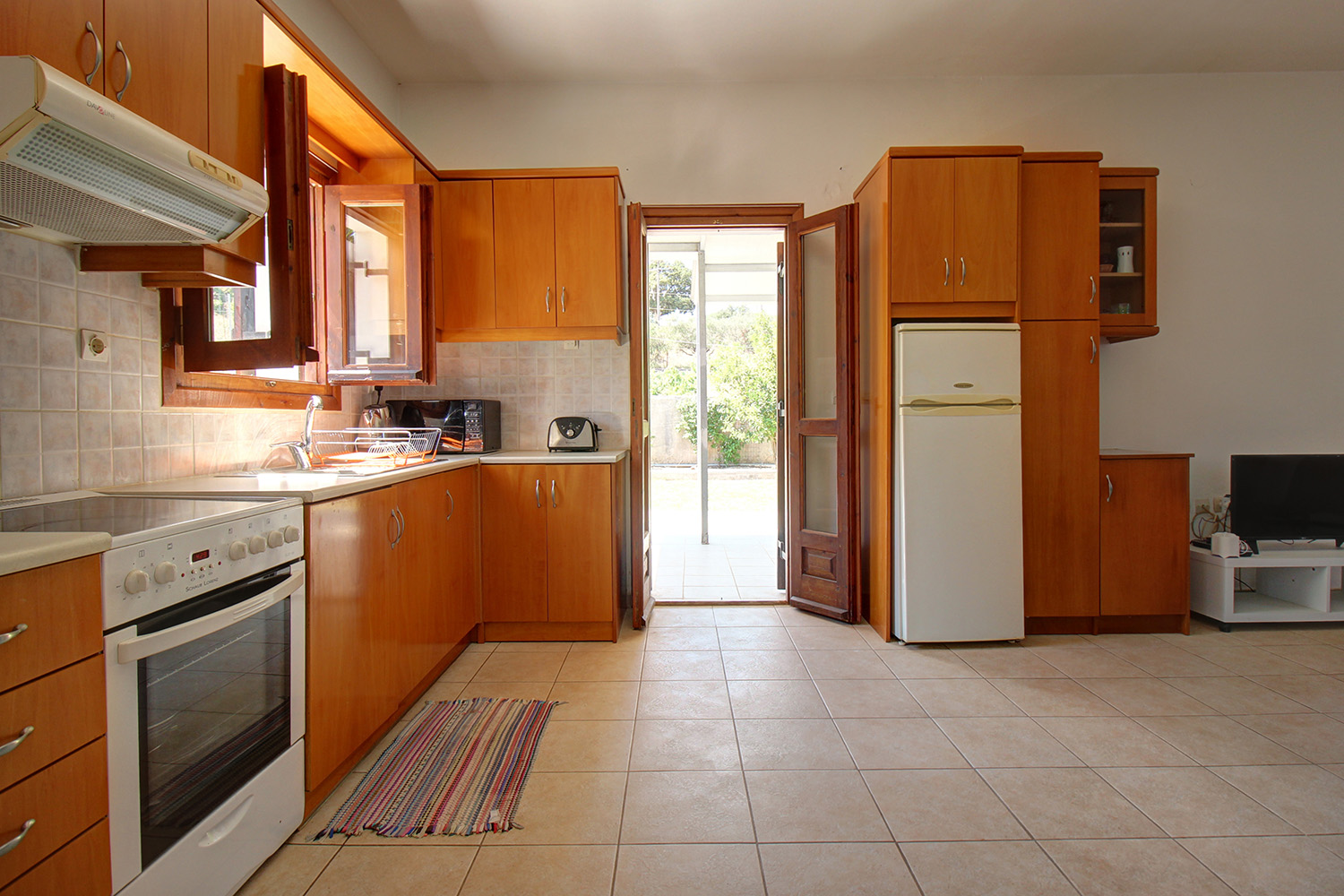Το κτήριο είναι σε ένα επίπεδο και σε συνδυασμό με το επίσης επίπεδο οικόπεδο αποτελεί εξαιρετική επιλογή για άτομα με κινητικές δυσκολίες. Με μικρές προσαρμογές στα μπάνια μπορεί, επίσης, να καταστεί πλήρως προσβάσιμο για χρήση από άτομα σε αμαξίδιο. Η κύρια είσοδος ανοίγει σε έναν μεγάλο και φωτεινό ενιαίο χώρο σαλονιού, κουζίνας και τραπεζαρίας. Στο σαλόνι υπάρχει, επίσης, ένα γωνιακό τζάκι παραδοσιακού τύπου. Ένα μικρό χολ οδηγεί σε δύο υπνοδωμάτια με εξόδους σε βεραντούλες καθώς και σε δύο μπάνια, ένα με μπανιέρα και ένα με ντους. Το ακίνητο έχει κλιματιστικά σε όλους τους χώρους, ηλιακό θερμοσίφωνα καθώς και έτοιμες σωληνώσεις σε περίπτωση που επιθυμείτε να προσθέσετε κεντρική θέρμανση με καλοριφέρ και λέβητα πετρελαίου. Στην τιμή πώλησης συμπεριλαμβάνονται όλη η υφιστάμενη επίπλωση και οι ηλεκτρικές συσκευές.