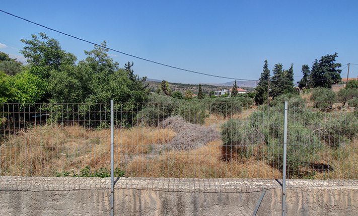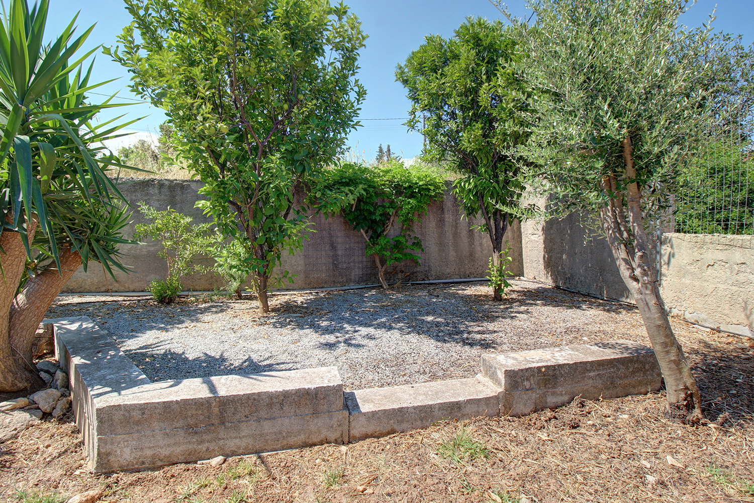 Ο κοινόχρηστος δρομάκος του συγκροτήματος καταλήγει σε μία ηλεκτρική μεταλλική πύλη στην πρόσοψη του οικοπέδου του σπιτιού. Ακριβώς πίσω υπάρχει ένας χώρος για να σταθμεύσετε δύο ή ως και τρία οχήματα. Το σπίτι καταλαμβάνει τη βορειοδυτική πλευρά του οικοπέδου ενώ όλο το υπόλοιπο είναι ελεύθερο και μπορεί να χρησιμοποιηθεί σαν κήπος. Ένα τμήμα της αυλής ανάμεσα στο σπίτι και στον κήπο είναι στεγασμένο με μεταλλική πέργκολα, έχει καλή ιδιωτικότητα και αποτελεί έναν υπέροχο χώρο χαλάρωσης, όλες τις ώρες της ημέρας. Η πισίνα του συγκροτήματος είναι ένα επίπεδο ψηλότερα και παρακείμενα της κατοικίας. Είναι περίπου 40 m² και έχει άνετο και όμορφο περιβάλλοντα χώρο.