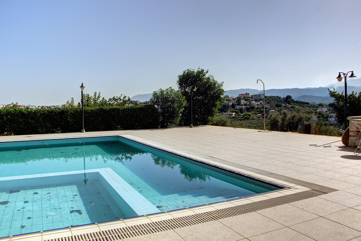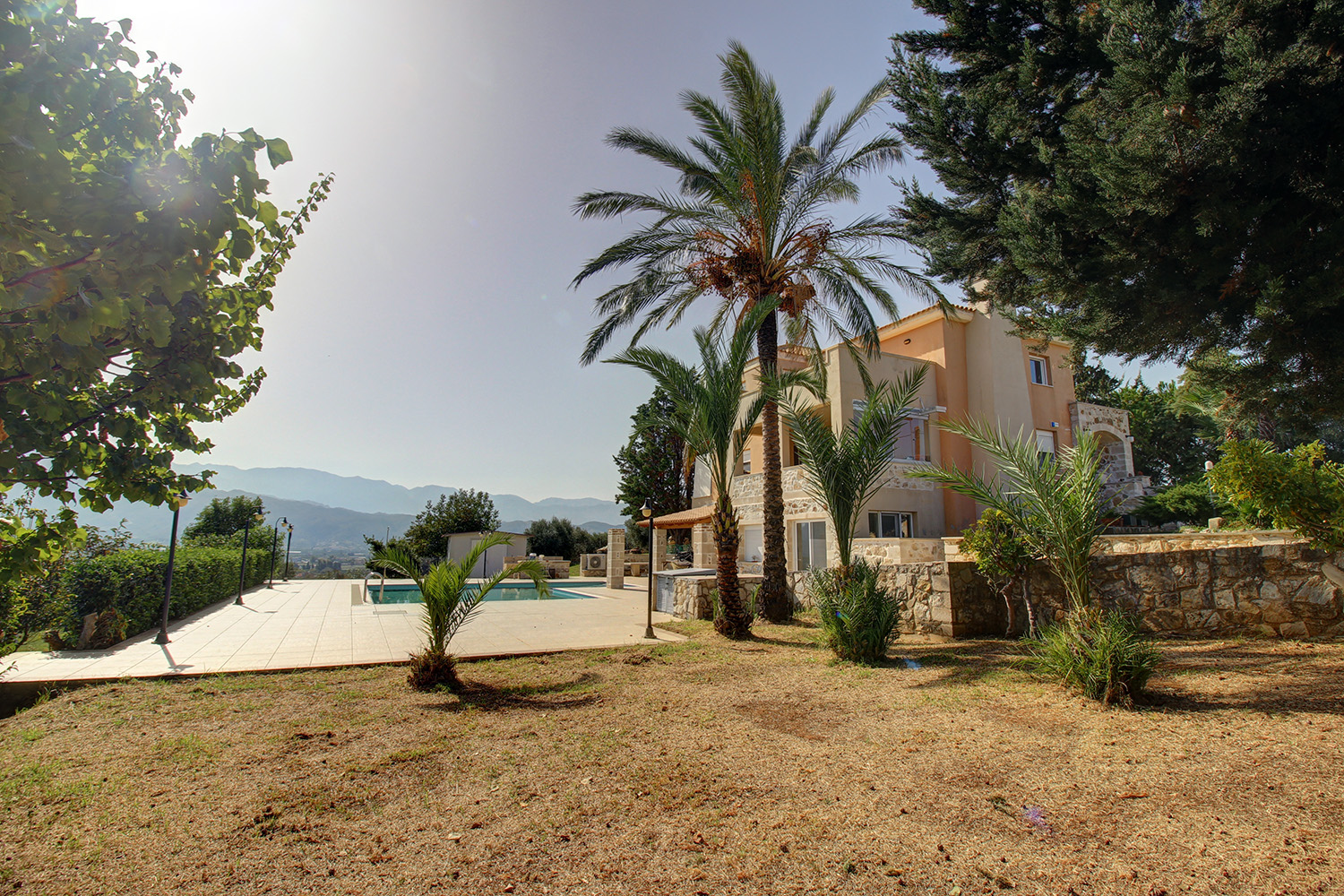 Το οικόπεδο είναι οριοθετημένο. Μία κεντρική πύλη ανοίγει σε έναν δρομάκο-driveway που φτάνει μέχρι την είσοδο του ισογείου, όπου μπορείτε να σταθμεύσετε αρκετά οχήματα. Γύρω από το κτήριο έχουν φτιαχτεί μεγάλες αυλές ενώ εξίσου μεγάλος είναι και ο περιβάλλοντας χώρος της πισίνας. Η 65 m² πισίνα επικοινωνεί απευθείας με το κάτω διαμέρισμα και διαθέτει τζακούζι. Τον περιβάλλοντα χώρο του σπιτιού συμπληρώνουν παρτέρια, κήποι με γρασίδι, ένας όμορφος κυπαρισσώνας και χώρος μπάρμπεκιου. Ένα τμήμα του οικοπέδου δεν έχει διαμορφωθεί και εκεί έχουν φυτευτεί πολλά καρποφόρα δέντρα όπως λεμονιές, πορτοκαλιές, λωτοί, φιστικιές και αχλαδιές. Υπάρχει επίσης ένας ελαιώνας με περίπου 50 παραγωγικά δέντρα, τα οποία υπερκαλύπτουν κατά πολύ τις ετήσιες ανάγκες σε ελαιόλαδο μίας μέσης οικογένειας.