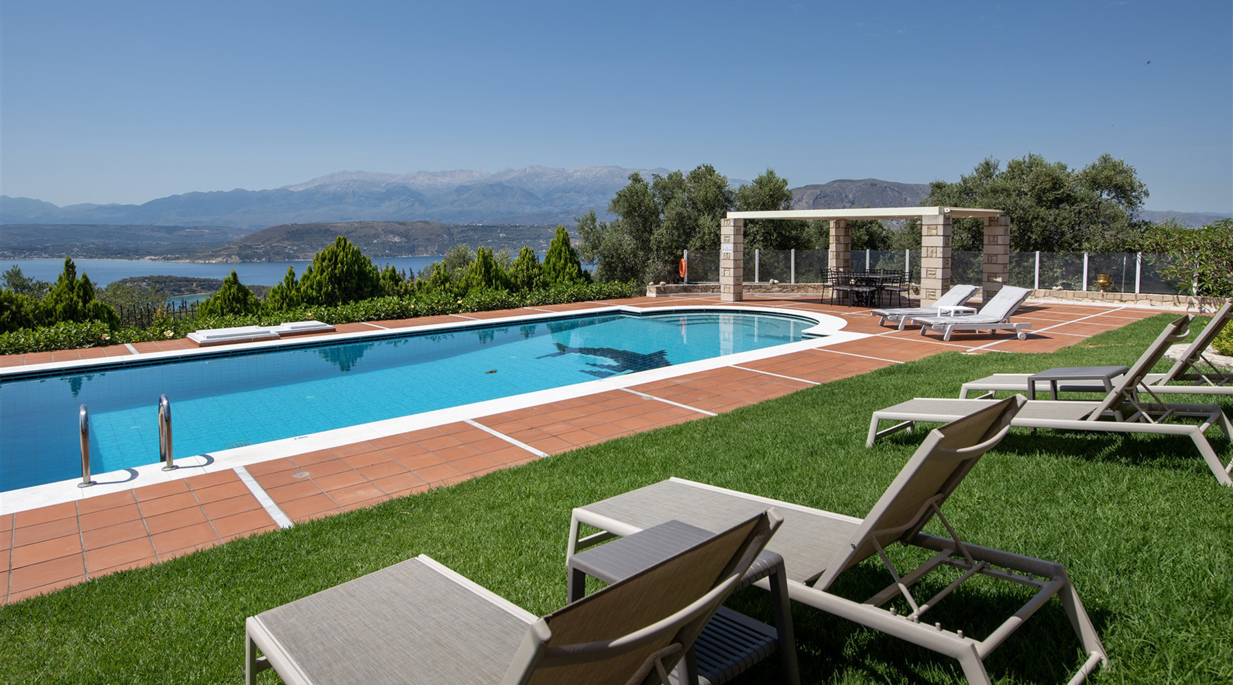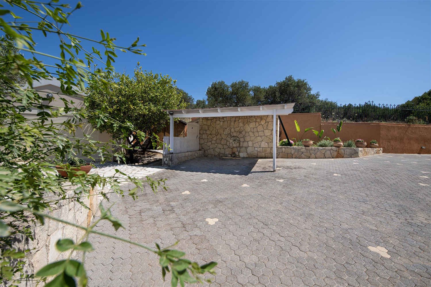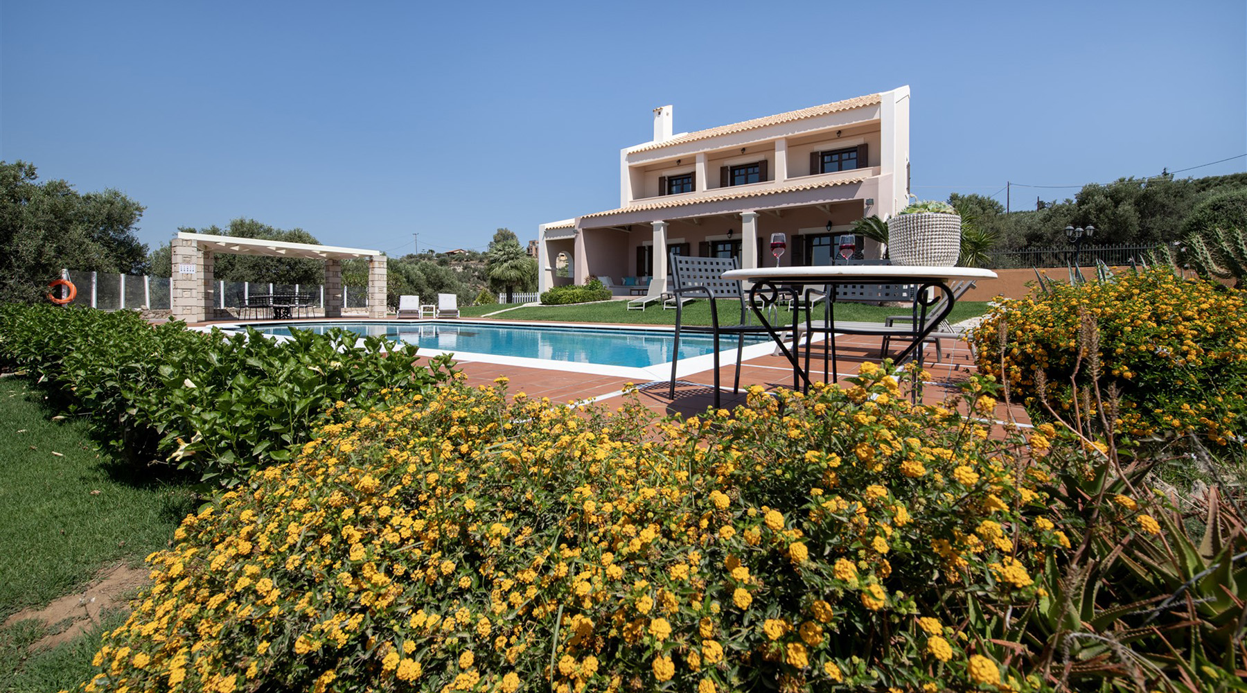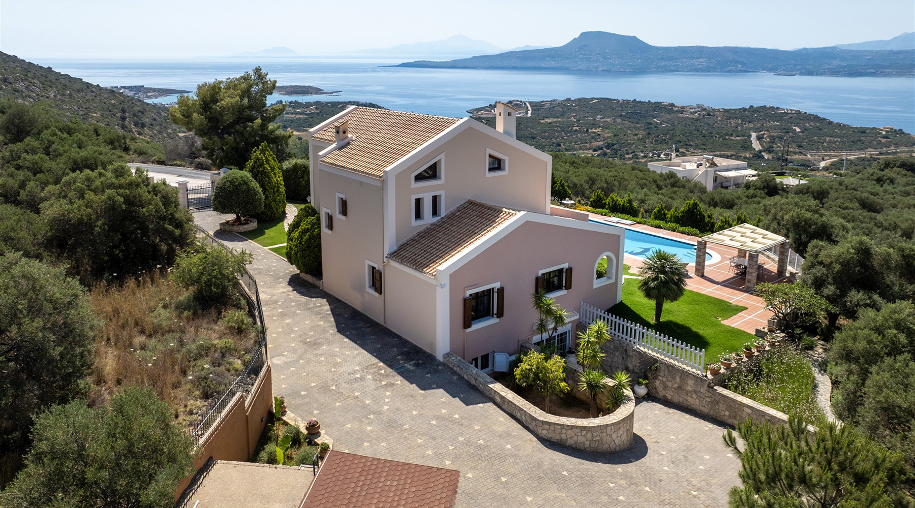 Το κτήριο έχει ιδανικό νοτιοανατολικό προσανατολισμό και η θέα του είναι ανεμπόδιστη ενώ για τη διασφάλισή της έχει αγοραστεί και παρακείμενο αγροτεμάχιο υψομετρικά χαμηλότερα. Έτσι, το κτήριο περιβάλλεται από έναν όμορφα διαμορφωμένο κήπο, ενώ συνοδεύεται από περίπου 40 ελαιόδεντρα ώριμης ηλικίας, τα οποία αρκούν με το παραπάνω για να καλύψουν τις ανάγκες σε ελαιόλαδο μίας μεγάλης οικογένειας. Ο περίβολος του σπιτιού είναι προσβάσιμος από μία μεταλλική ηλεκτρική πύλη ενώ υπάρχει και είσοδος επισκεπτών. Στην πρόσοψη του κτηρίου υπάρχει driveway που καταλήγει σε γκαράζ 25 m² και σε έναν μεγάλο χώρο στάθμευσης. Ο απομένων περίβολος του κτηρίου είναι όμορφα διαμορφωμένος με ανθόκηπους και γρασίδι που ποτίζεται αυτόματα. Η 66 m² πισίνα είναι τοποθετημένη από την πλευρά της θάλασσας και έχει μεγάλο χώρο για ηλιοθεραπεία καθώς και πέργκολα όπου μπορείτε να χαλαρώσετε υπό σκιά.