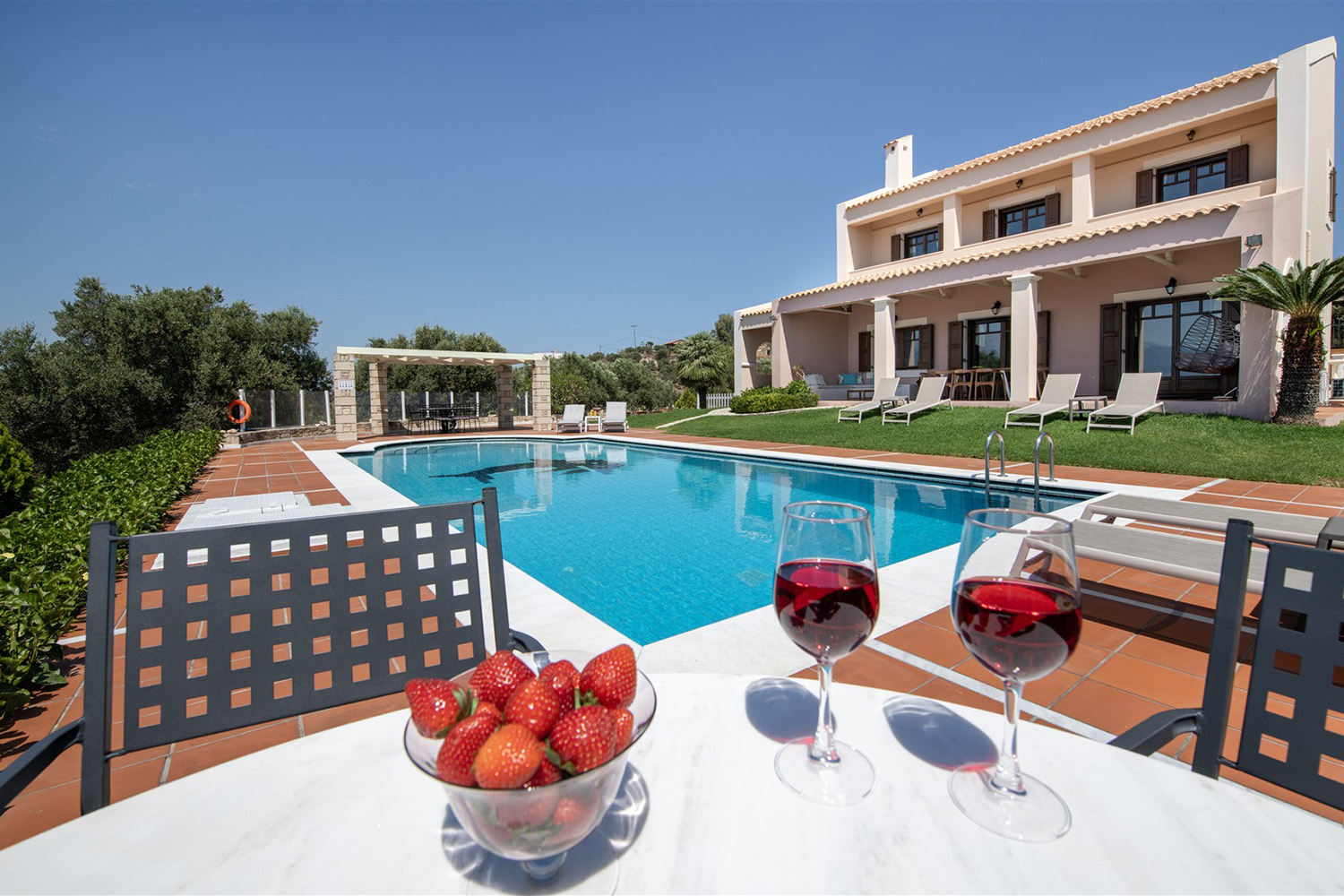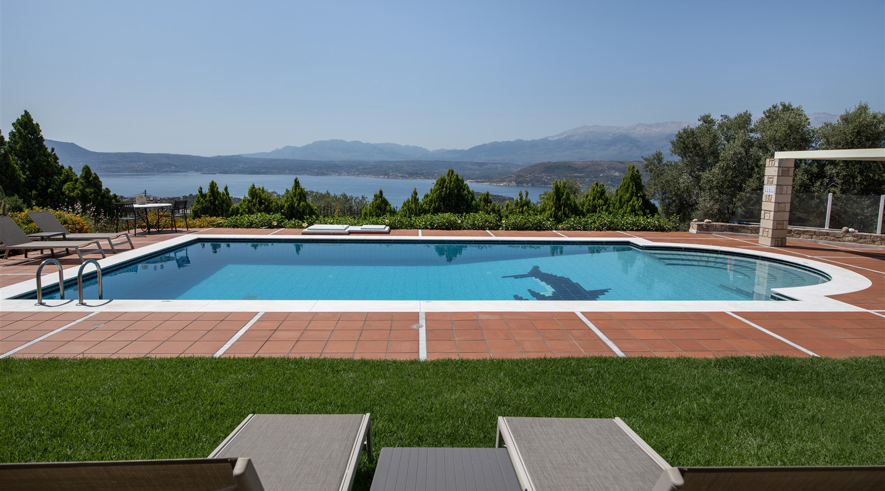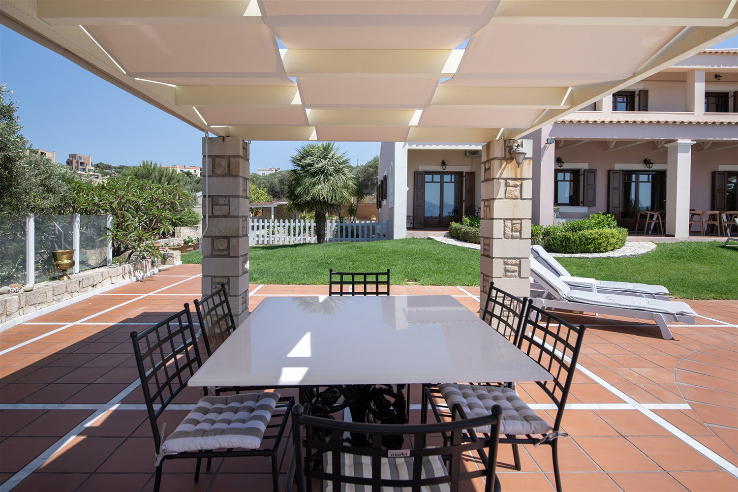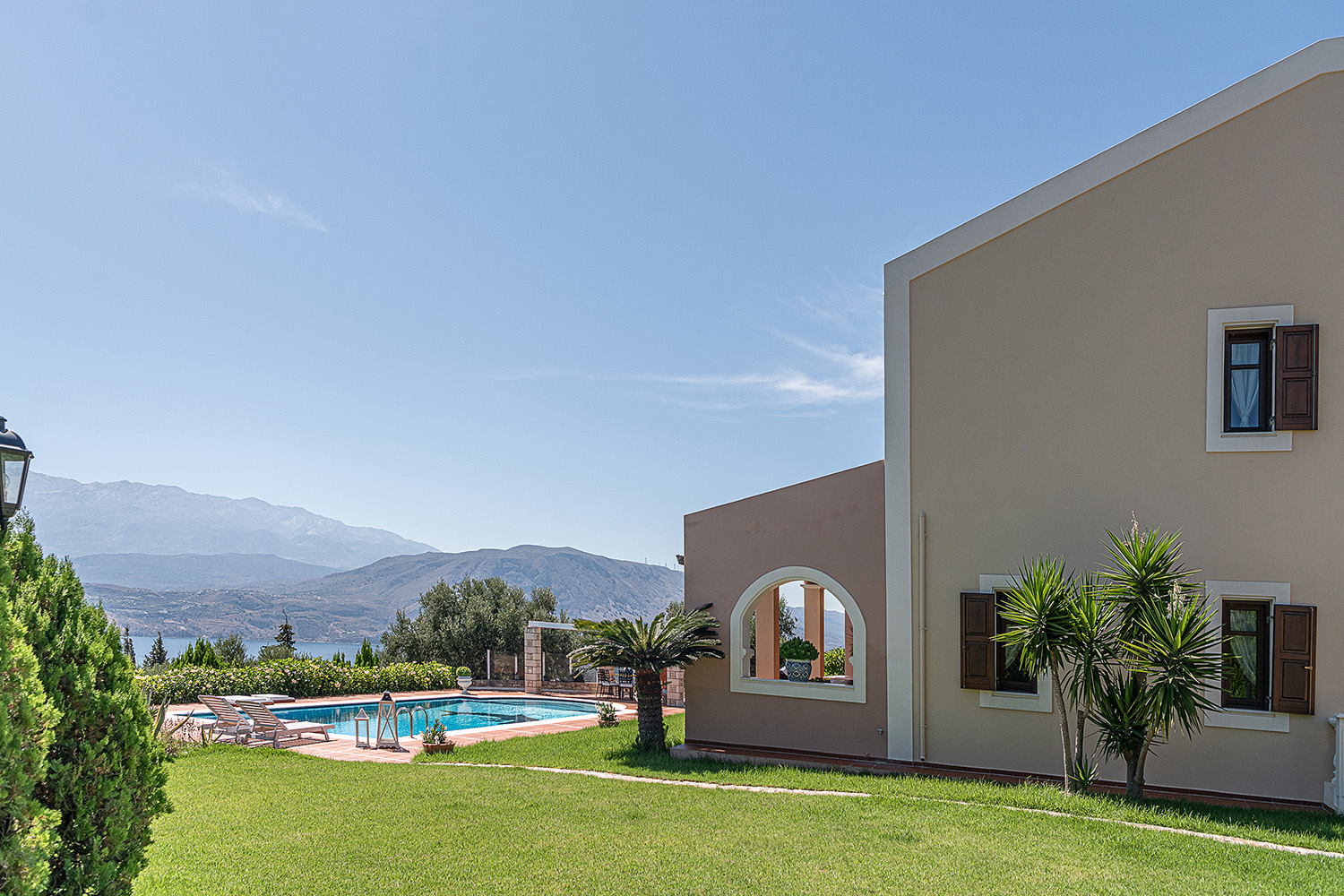 Το κτήριο έχει ιδανικό νοτιοανατολικό προσανατολισμό και η θέα του είναι ανεμπόδιστη ενώ για τη διασφάλισή της έχει αγοραστεί και παρακείμενο αγροτεμάχιο υψομετρικά χαμηλότερα. Έτσι, το κτήριο περιβάλλεται από έναν όμορφα διαμορφωμένο κήπο, ενώ συνοδεύεται από περίπου 40 ελαιόδεντρα ώριμης ηλικίας, τα οποία αρκούν με το παραπάνω για να καλύψουν τις ανάγκες σε ελαιόλαδο μίας μεγάλης οικογένειας. Ο περίβολος του σπιτιού είναι προσβάσιμος από μία μεταλλική ηλεκτρική πύλη ενώ υπάρχει και είσοδος επισκεπτών. Στην πρόσοψη του κτηρίου υπάρχει driveway που καταλήγει σε γκαράζ 25 m² και σε έναν μεγάλο χώρο στάθμευσης. Ο απομένων περίβολος του κτηρίου είναι όμορφα διαμορφωμένος με ανθόκηπους και γρασίδι που ποτίζεται αυτόματα. Η 66 m² πισίνα είναι τοποθετημένη από την πλευρά της θάλασσας και έχει μεγάλο χώρο για ηλιοθεραπεία καθώς και πέργκολα όπου μπορείτε να χαλαρώσετε υπό σκιά.