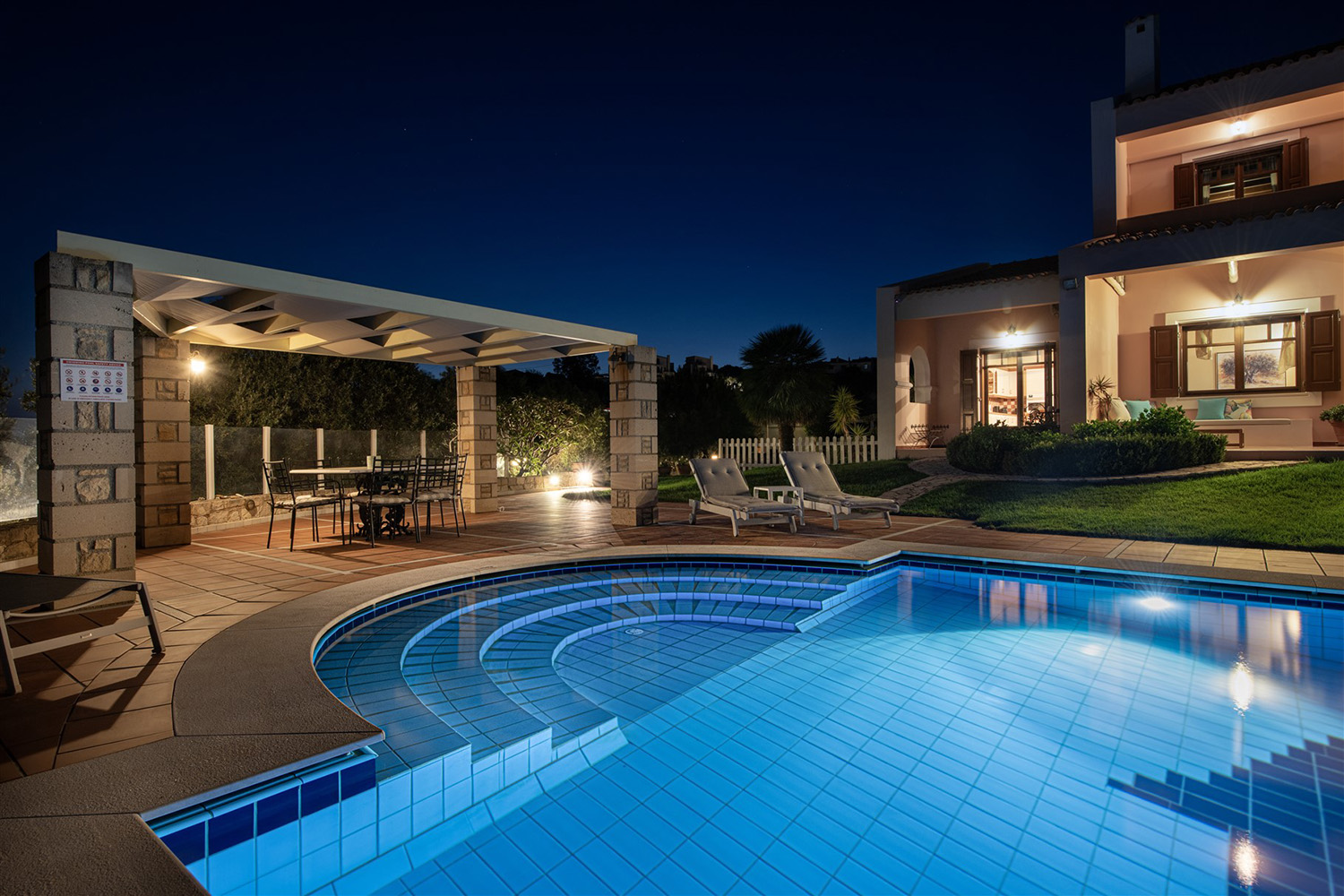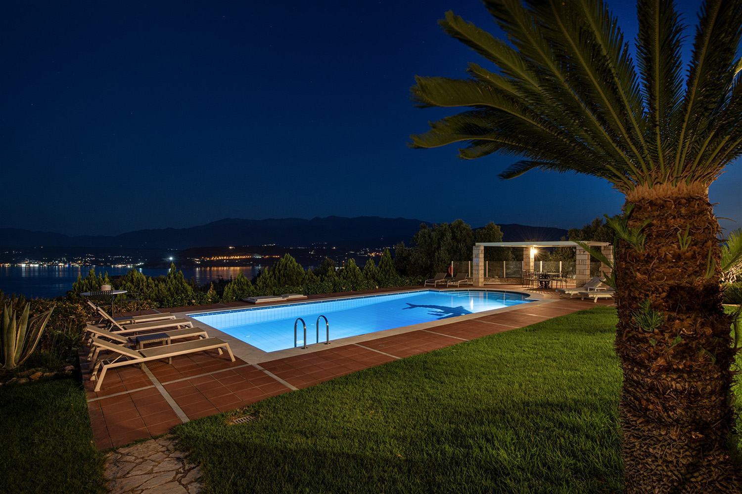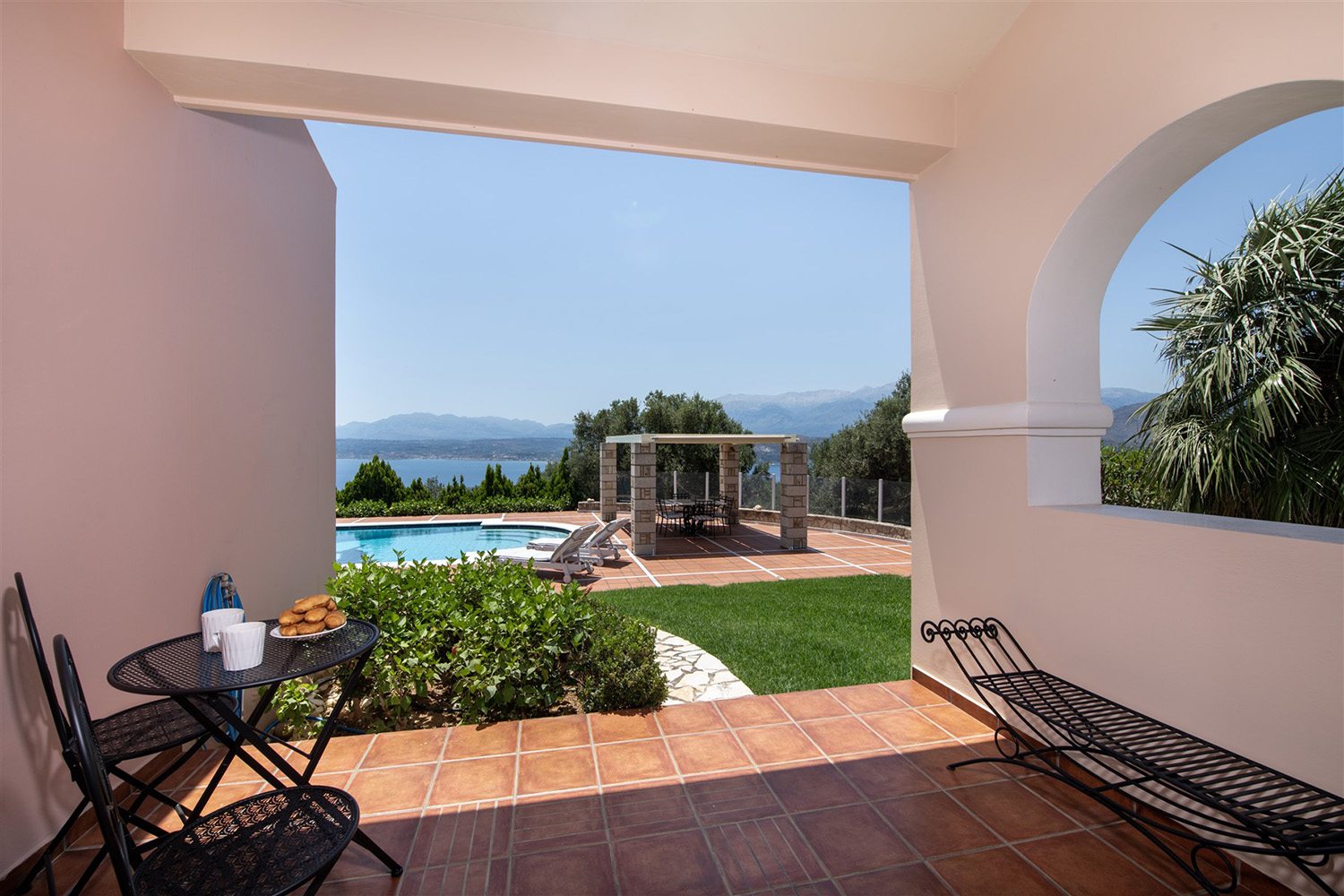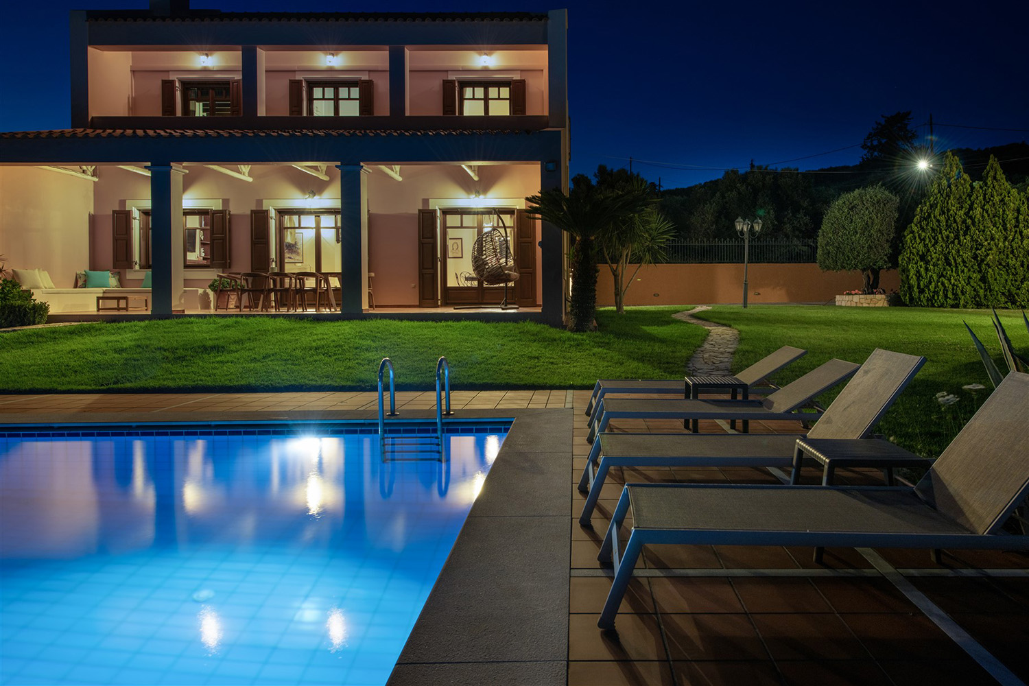 Το κτήριο έχει ιδανικό νοτιοανατολικό προσανατολισμό και η θέα του είναι ανεμπόδιστη ενώ για τη διασφάλισή της έχει αγοραστεί και παρακείμενο αγροτεμάχιο υψομετρικά χαμηλότερα. Έτσι, το κτήριο περιβάλλεται από έναν όμορφα διαμορφωμένο κήπο, ενώ συνοδεύεται από περίπου 40 ελαιόδεντρα ώριμης ηλικίας, τα οποία αρκούν με το παραπάνω για να καλύψουν τις ανάγκες σε ελαιόλαδο μίας μεγάλης οικογένειας. Ο περίβολος του σπιτιού είναι προσβάσιμος από μία μεταλλική ηλεκτρική πύλη ενώ υπάρχει και είσοδος επισκεπτών. Στην πρόσοψη του κτηρίου υπάρχει driveway που καταλήγει σε γκαράζ 25 m² και σε έναν μεγάλο χώρο στάθμευσης. Ο απομένων περίβολος του κτηρίου είναι όμορφα διαμορφωμένος με ανθόκηπους και γρασίδι που ποτίζεται αυτόματα. Η 66 m² πισίνα είναι τοποθετημένη από την πλευρά της θάλασσας και έχει μεγάλο χώρο για ηλιοθεραπεία καθώς και πέργκολα όπου μπορείτε να χαλαρώσετε υπό σκιά.
