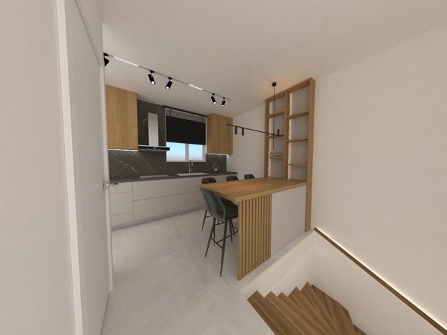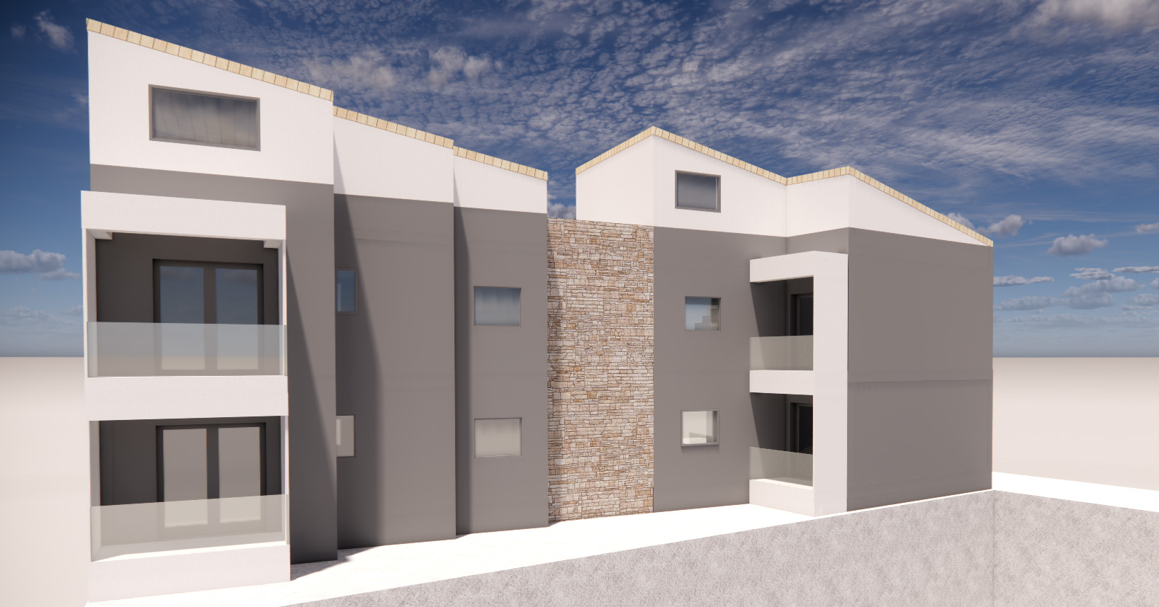 Το διαμέρισμα θα κατασκευαστεί σε ένα κτήριο τεσσάρων ιδιοκτησιών, όπου θα υπάρχουν δύο διαμερίσματα στο ισόγειο, δύο μεζονέτες σε όροφο και πατάρι επάνω καθώς και υπόγειο πάρκινγκ πιλοτής με αποθήκη για κάθε ιδιοκτήτη. Το οικόπεδο έχει βορειοδυτική κλίση ώστε το κατώτατο επίπεδο του κτηρίου να είναι προσβάσιμο απευθείας από τον δρόμο που περνά μπροστά του.