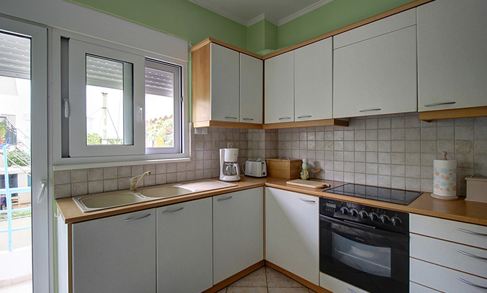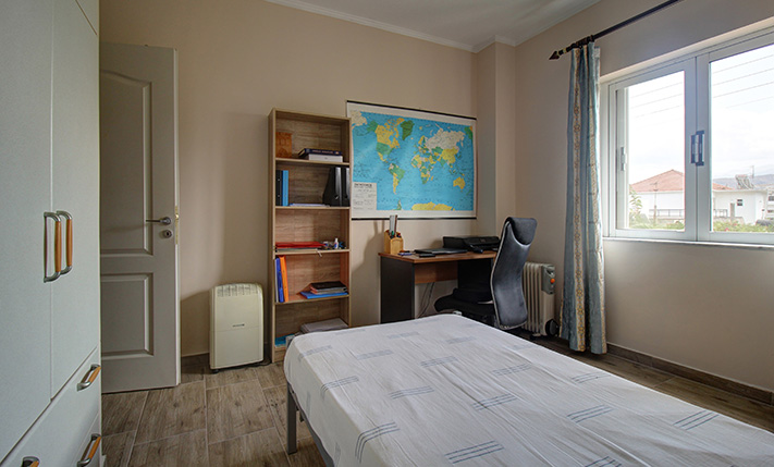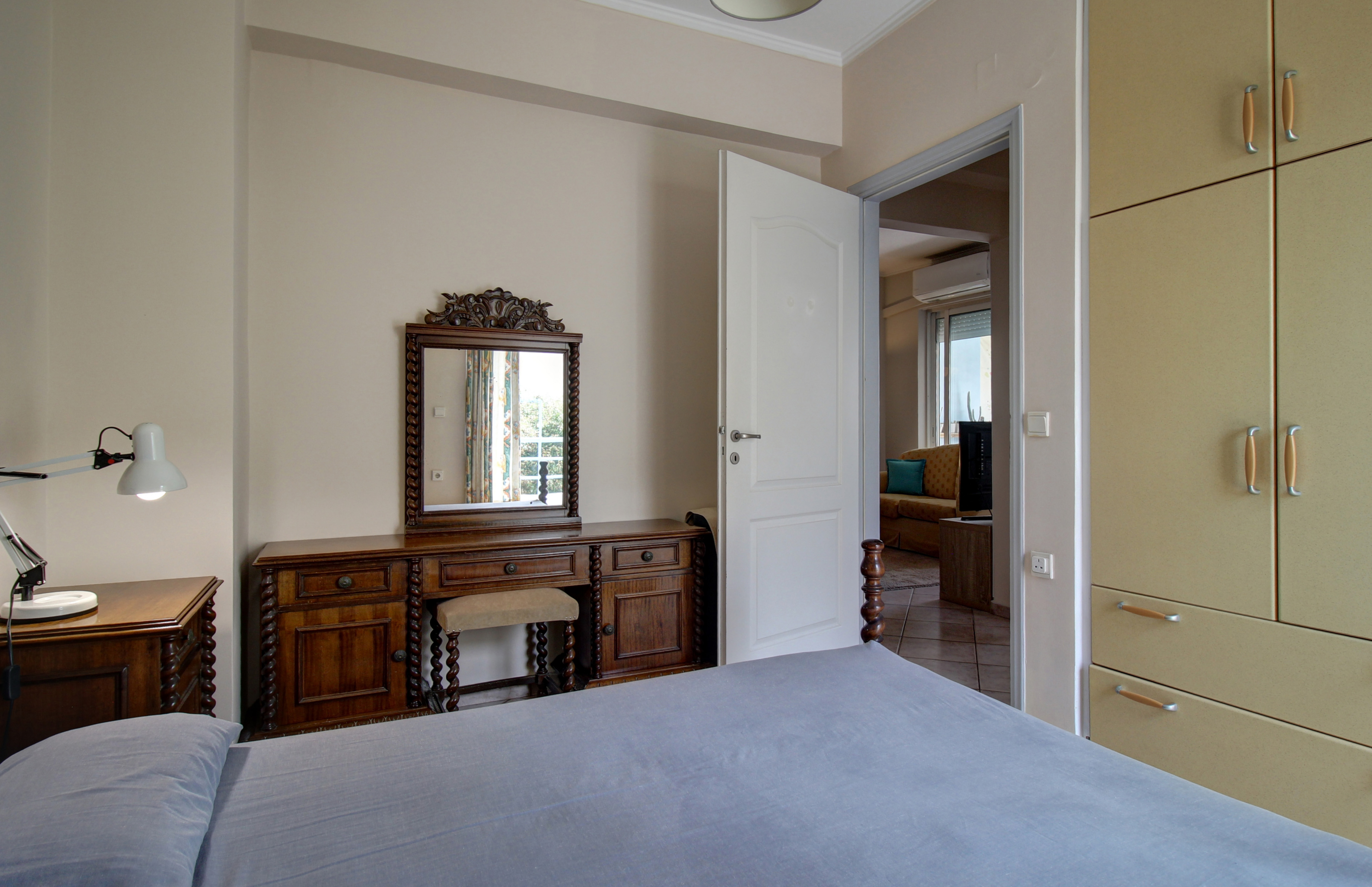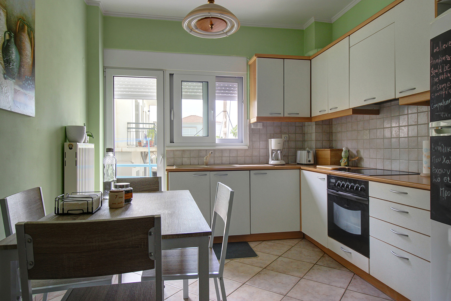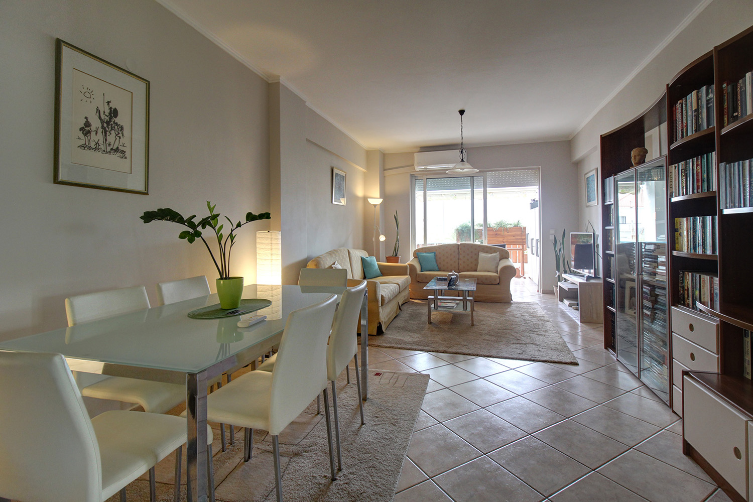 Μέχρι τον όροφο φτάνει ανελκυστήρας και το διαμέρισμα μπορεί πολύ εύκολα να καταστεί πλήρως προσβάσιμο σε ΑμεΑ. Στο εσωτερικό του συναντάμε έναν μεγάλο ενιαίο χώρο σαλονιού-τραπεζαρίας και κουζίνας σε σχήμα "Γ". Η κουζίνα έχει πολλά ντουλάπια, άνετο πάγκο καθώς και έξοδο στο δυτικό μπαλκόνι, το οποίο μοιράζεται με το ένα από τα υπνοδωμάτια. Το σαλόνι είναι επίσης άνετο και έχει μία μεγάλη μπαλκονόπορτα από όπου μπαίνει άπλετο φως και οδηγεί στη βεράντα. Ένας σύντομος διάδρομος οδηγεί στα δύο υπνοδωμάτια, τα οποία έχουν εντοιχισμένες ντουλάπες. Το διαμέρισμα διαθέτει, επίσης, ένα κεντρικό μπάνιο με μπανιέρα.