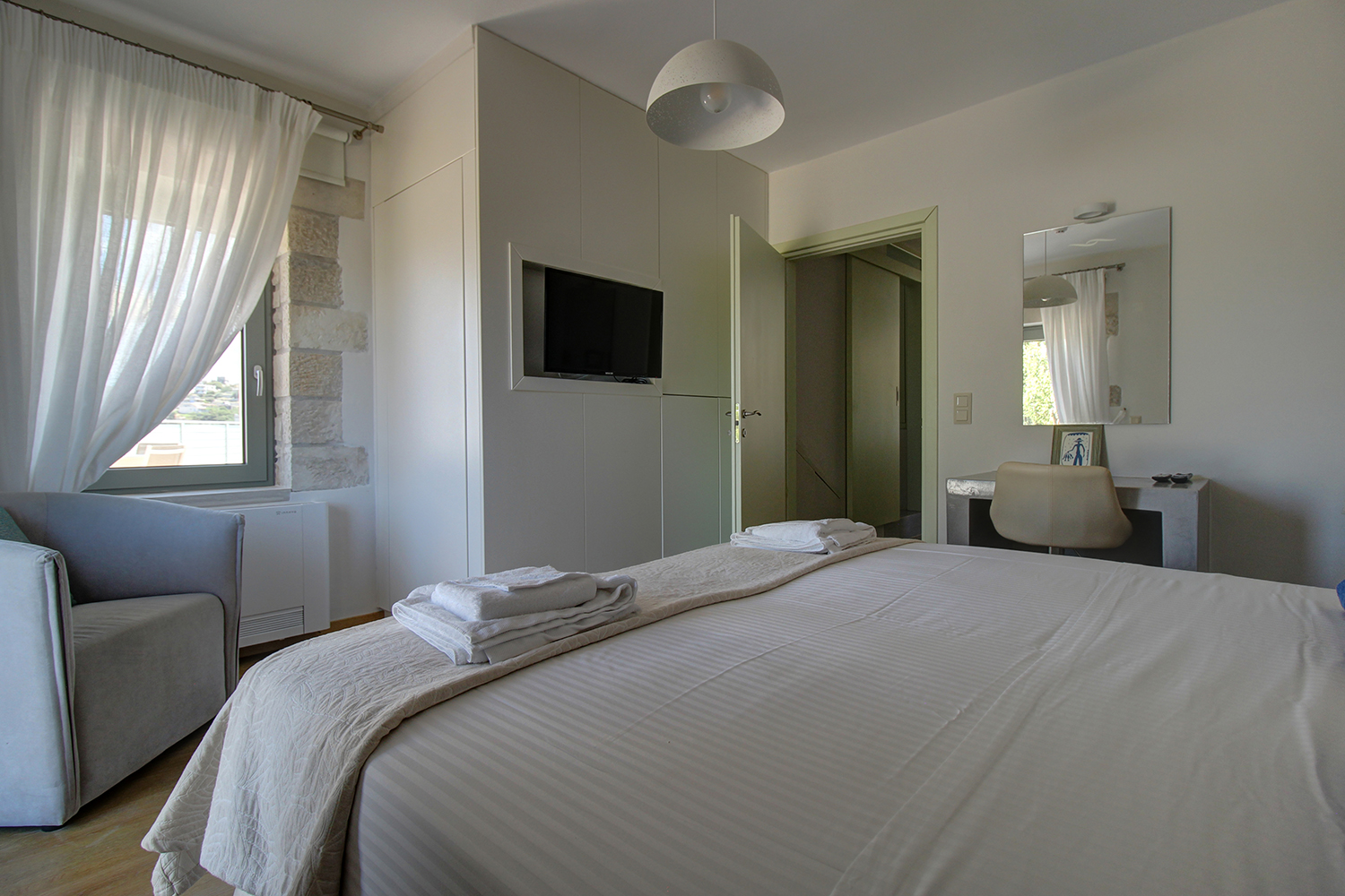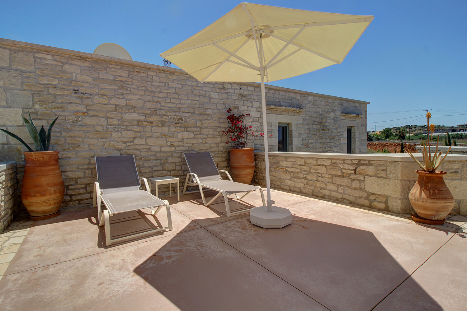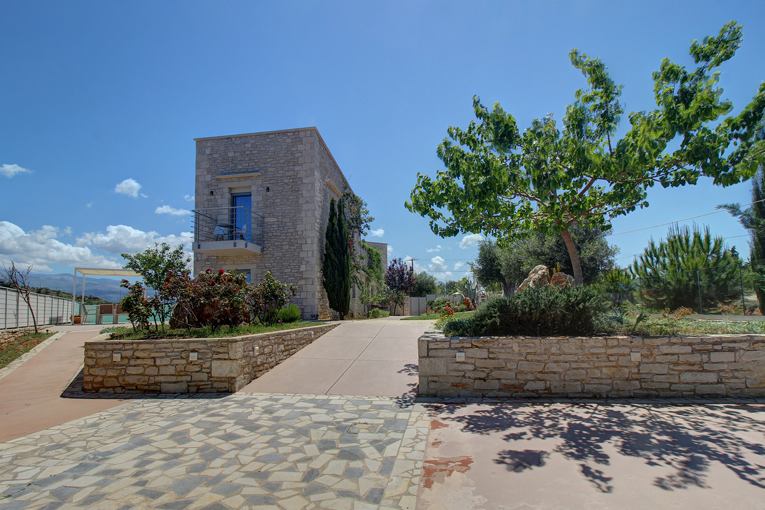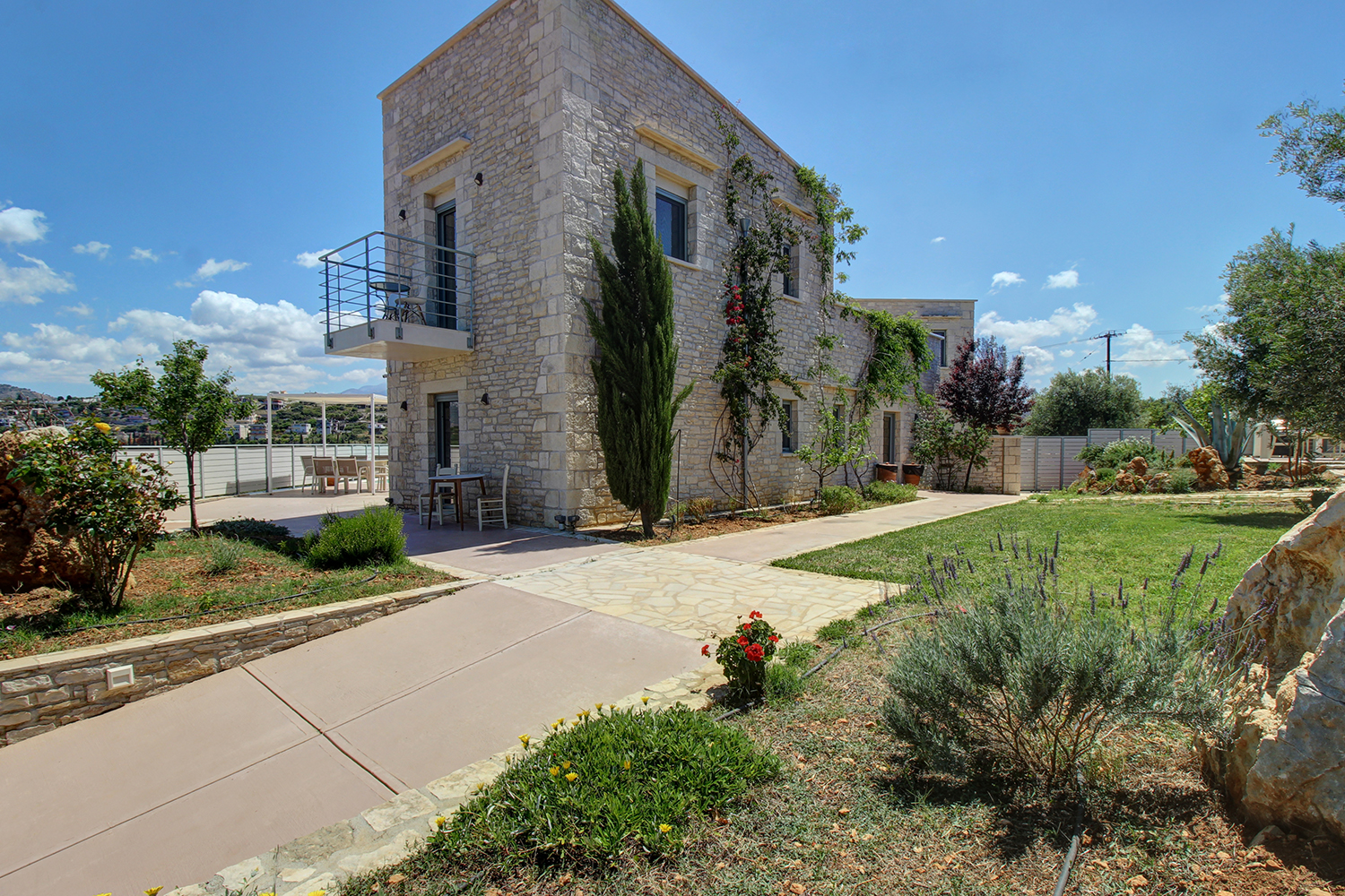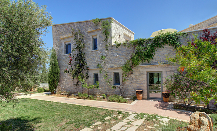 Η ιδιοκτησία είναι σε ένα πολυτελές συγκρότημα δύο όμορων κατοικιών, κάθε μία από τις οποίες έχει εξωτερικό χώρο, ιδιωτική πισίνα, αυλές και κήπο στην αποκλειστική της χρήση. Οι δύο έχουν, επίσης, αντίθετο μεταξύ τους προσανατολισμό ώστε να υπάρχει καλή ιδιωτικότητα. Το συγκρότημα είναι σε πλήρη αρμονία με τον περιβάλλοντα χώρο του καθώς οι κατοικίες είναι καλυμμένες με τοπική πέτρα ενώ και στους κήπους έχουν τοποθετηθεί τοπικά φυτά, τα οποία εναρμονίζονται με τους αμέτρητους ελαιώνες της γύρω περιοχής. Η κατοικία έχει κατά βάση βόρειο προσανατολισμό. Είναι σε τρία επίπεδα, με 120 m² κύριων χώρων στα δύο επάνω καθώς και έναν ενιαίο βοηθητικό χώρο 73 m² στο υπόγειο. Τα κτήρια ξεκίνησαν να κατασκευάζονται το 2014 ενώ ολοκληρώθηκαν το 2019 και έως σήμερα έχουν χρησιμοποιηθεί ελάχιστα.