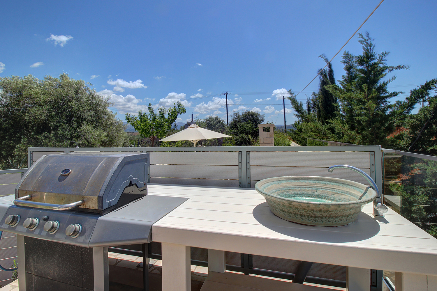 Μία μεταλλική πύλη οδηγεί στον περιβάλλοντα χώρο και στη συνέχεια περνάμε σε έναν άνετο χώρο στάθμευσης. Πριν την είσοδο του σπιτιού συναντάμε έναν όμορφο κήπο με γρασίδι και παρτέρια. Στο βάθος υπάρχει ένας χώρος δείπνου, ο οποίος σκεπάζεται με μεταλλική πέργκολα και έχει μπάρμπεκιου και πάγκο με έναν εντυπωσιακό χειροποίητο κεραμικό νεροχύτη. Η 24 m² ιδιωτική πισίνα του σπιτιού, η οποία βρίσκεται κοντά στην πρόσοψη του ακινήτου, είναι θερμαινόμενη, έχει jacuzzi και περιβάλλεται από μεγάλο χώρο ηλιοθεραπείας.