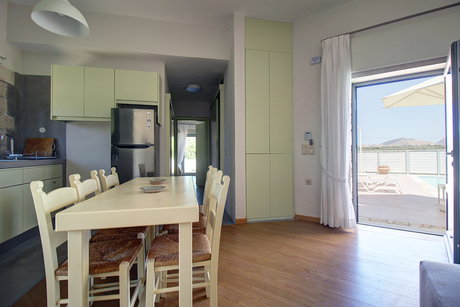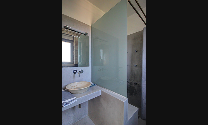 Το ισόγειο είναι προσβάσιμο από άτομα με κινητικές δυσκολίες ενώ και στον εξωτερικό χώρο μέχρι της είσοδό του έχουν κατασκευαστεί οι απαραίτητες ράμπες. Από την κύρια είσοδο περνάμε σε έναν ενιαίο χώρο σαλονιού, τραπεζαρίας και κουζίνας. Το σαλόνι είναι φωτεινό και έχει μεγάλες τζαμαρίες που επικοινωνούν απευθείας με τον χώρο της πισίνας. Η κουζίνα έχει χτιστά ντουλάπια που παραπέμπουν στην αρχιτεκτονική των παραδοσιακών αγροικιών ενώ διαθέτει άνετο πάγκο και όλες τις απαραίτητες ηλεκτρικές συσκευές. Ένας σύντομος διάδρομος μας οδηγεί στο μπάνιο του ισογείου, το οποίο έχει προδιαγραφές ΑμεΑ ενώ στο βάθος βρίσκεται το ένα από τα υπνοδωμάτια, το οποίο είναι άνετο και έχει μεγάλη εντοιχισμένη ντουλάπα. Μία εσωτερική σκάλα οδηγεί στον όροφο, τον οποίο καταλαμβάνει το κύριο υπνοδωμάτιο. Έχει ενσωματωμένο μπάνιο με ντους, σαλονάκι που μπορεί να γίνει γραφείο, εντοιχισμένη ντουλάπα, ένα μπαλκονάκι καθώς και έξοδο σε ένα μεγάλο μπαλκόνι, το οποίο επικοινωνεί με τον κήπο.