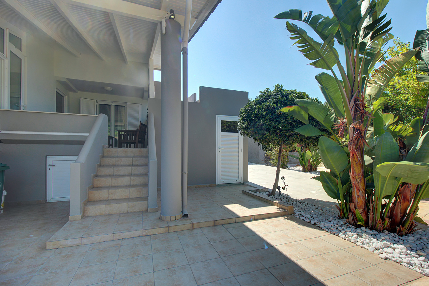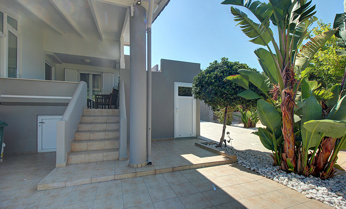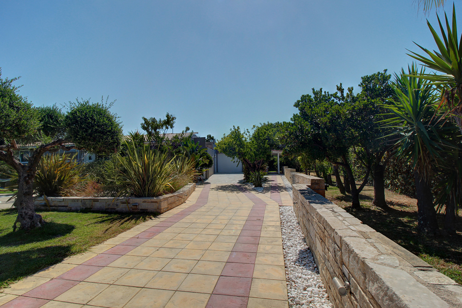 Το τμήμα που περιβάλλει την κατοικία είναι προσβάσιμο από μία συρόμενη καγκελόπορτα. Στη συνέχεια μας υποδέχεται το πάρκινγκ, όπου χωράνε ως και 3 αυτοκίνητα. Αυτό συνεχίζει ως driveway που καταλήγει στο γκαράζ του σπιτιού. Το γκαράζ είναι σε επαφή με την κατοικία και είναι εύκολο να δημιουργηθεί απευθείας πρόσβαση στο εσωτερικό της, αν και είναι ανεξάρτητο. Γύρω από το κτήριο έχει φτιαχτεί ένας ειδυλλιακός κήπος με γρασίδι, ο οποίος ποτίζεται και κουρεύεται αυτόματα. Η πρόσοψη είναι ηλιόλουστη και ενδείκνυται για ηλιοθεραπεία ενώ στην πίσω όψη θα βρείτε πολλά διαφορετικά φρουτόδεντρα, τα οποία είναι ώριμα και παραγωγικά. Η 60 m² ιδιωτική πισίνα του σπιτιού έχει κατασκευαστεί πρόσφατα και έχει επενδυθεί με πολυτελές μάρμαρο. Συνοδεύεται, επίσης, από έναν μεγάλο χώρο δείπνου με χειροποίητη τραπεζαρία 14ων ατόμων, ο οποίος στεγάζεται με πέργκολα. Η ιδιωτικότητα είναι άριστη και γύρω από την κατοικία θα βρείτε, επιπρόσθετα, αποθήκες, εξωτερικό WC, ένα χτιστό μπάρμπεκιου καθώς και πολλές επιλογές για να χαλαρώστε υπό σκιά ή στον ήλιο.