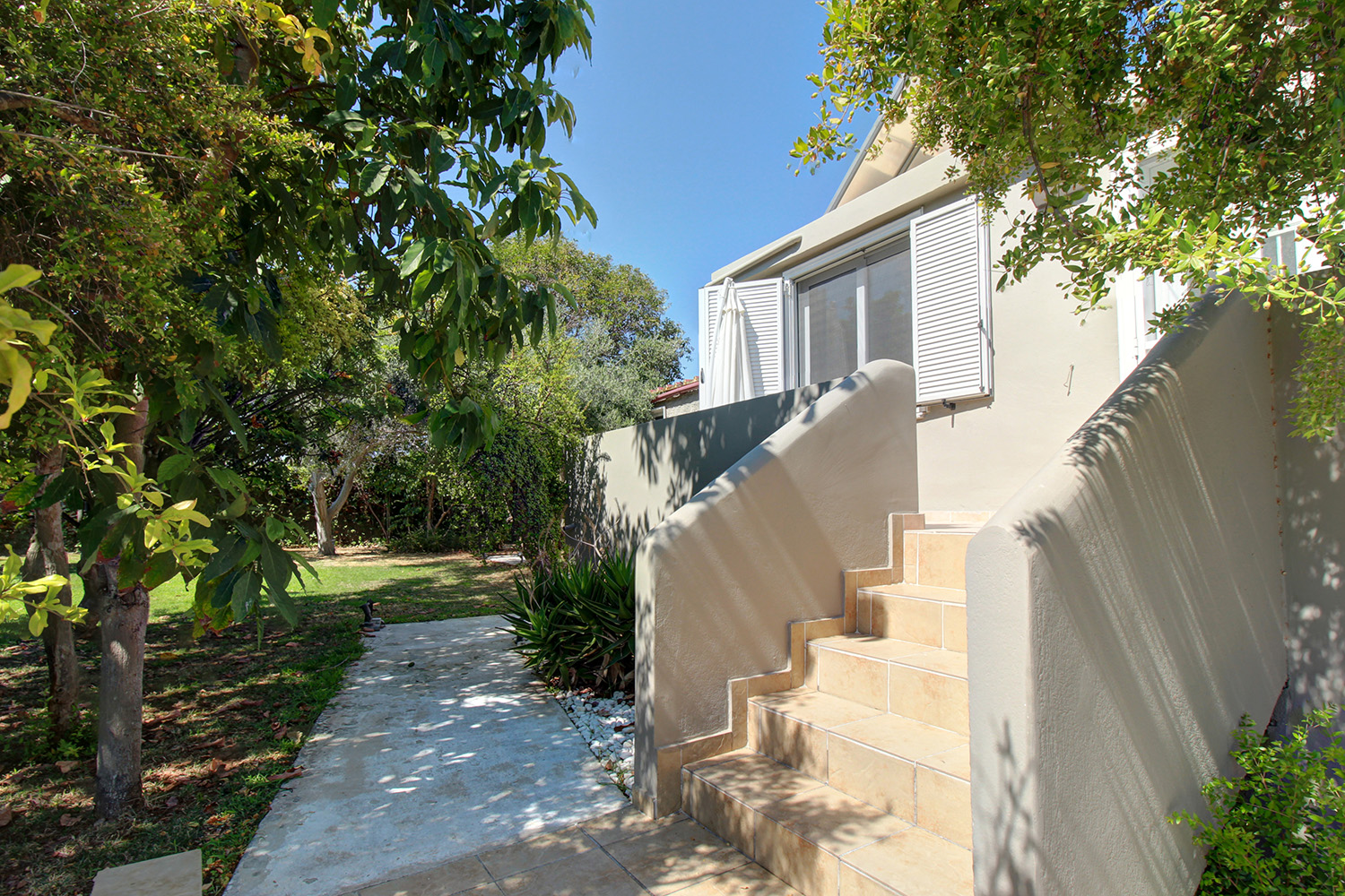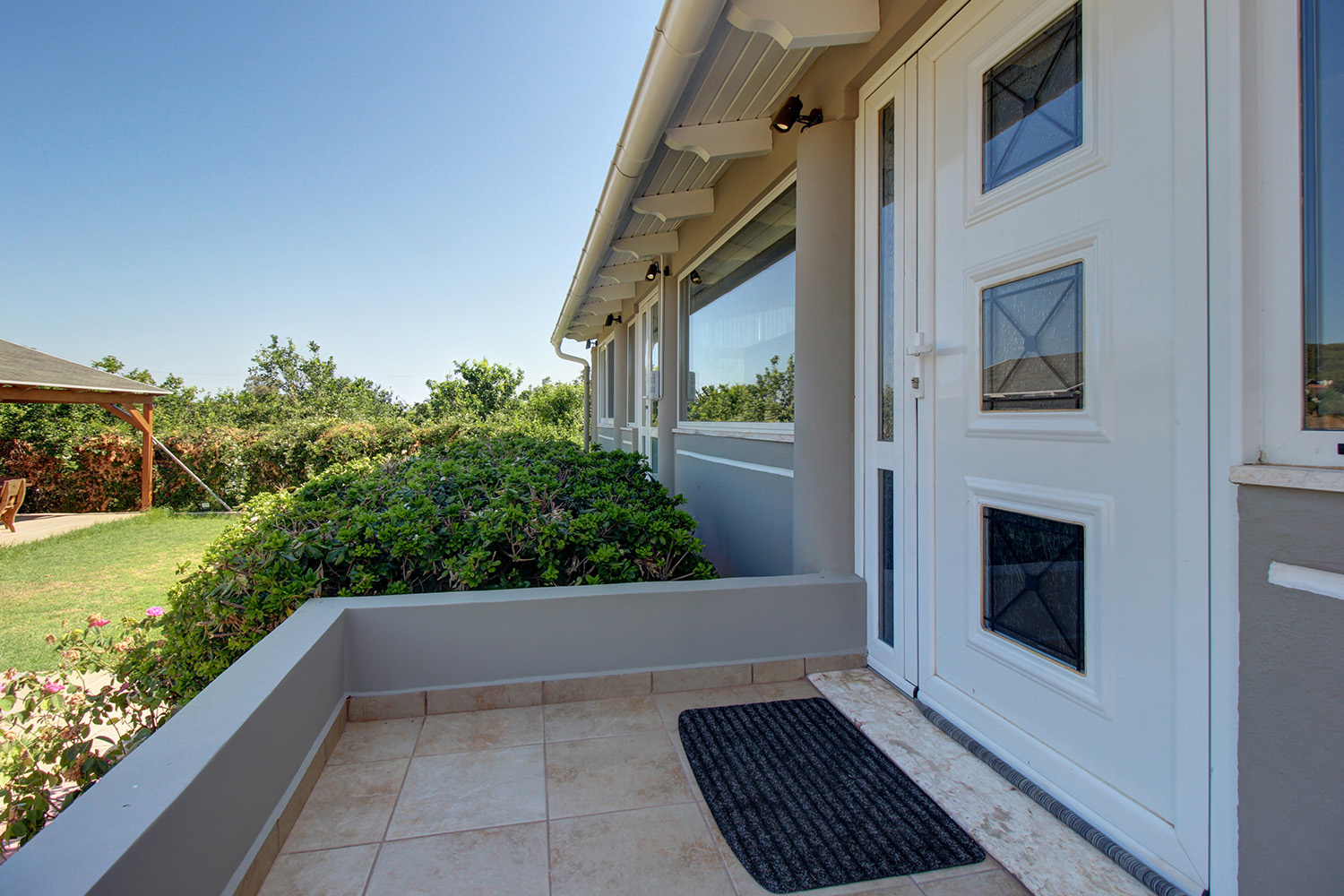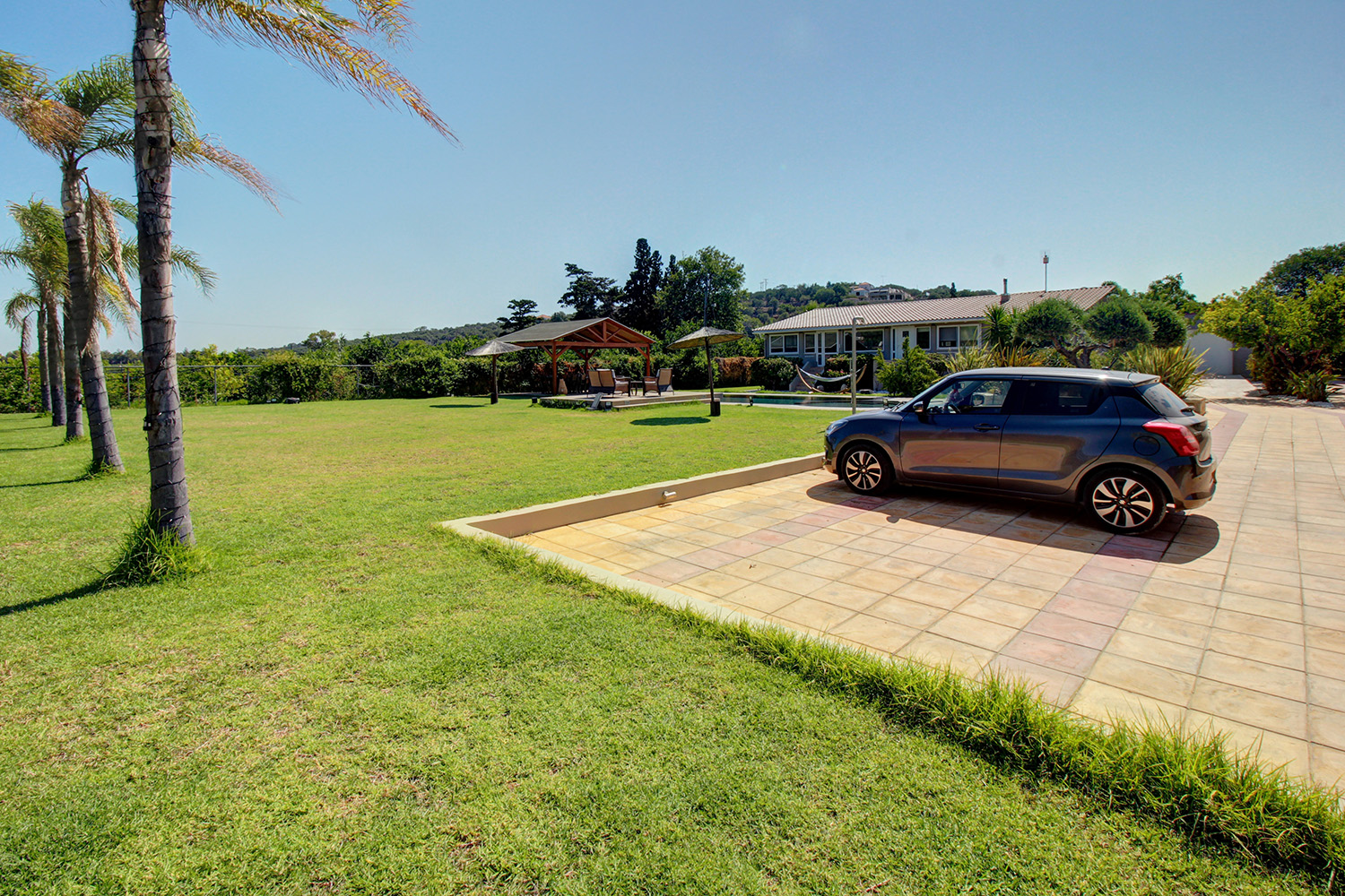 Το τμήμα που περιβάλλει την κατοικία είναι προσβάσιμο από μία συρόμενη καγκελόπορτα. Στη συνέχεια μας υποδέχεται το πάρκινγκ, όπου χωράνε ως και 3 αυτοκίνητα. Αυτό συνεχίζει ως driveway που καταλήγει στο γκαράζ του σπιτιού. Το γκαράζ είναι σε επαφή με την κατοικία και είναι εύκολο να δημιουργηθεί απευθείας πρόσβαση στο εσωτερικό της, αν και είναι ανεξάρτητο. Γύρω από το κτήριο έχει φτιαχτεί ένας ειδυλλιακός κήπος με γρασίδι, ο οποίος ποτίζεται και κουρεύεται αυτόματα. Η πρόσοψη είναι ηλιόλουστη και ενδείκνυται για ηλιοθεραπεία ενώ στην πίσω όψη θα βρείτε πολλά διαφορετικά φρουτόδεντρα, τα οποία είναι ώριμα και παραγωγικά. Η 60 m² ιδιωτική πισίνα του σπιτιού έχει κατασκευαστεί πρόσφατα και έχει επενδυθεί με πολυτελές μάρμαρο. Συνοδεύεται, επίσης, από έναν μεγάλο χώρο δείπνου με χειροποίητη τραπεζαρία 14ων ατόμων, ο οποίος στεγάζεται με πέργκολα. Η ιδιωτικότητα είναι άριστη και γύρω από την κατοικία θα βρείτε, επιπρόσθετα, αποθήκες, εξωτερικό WC, ένα χτιστό μπάρμπεκιου καθώς και πολλές επιλογές για να χαλαρώστε υπό σκιά ή στον ήλιο.