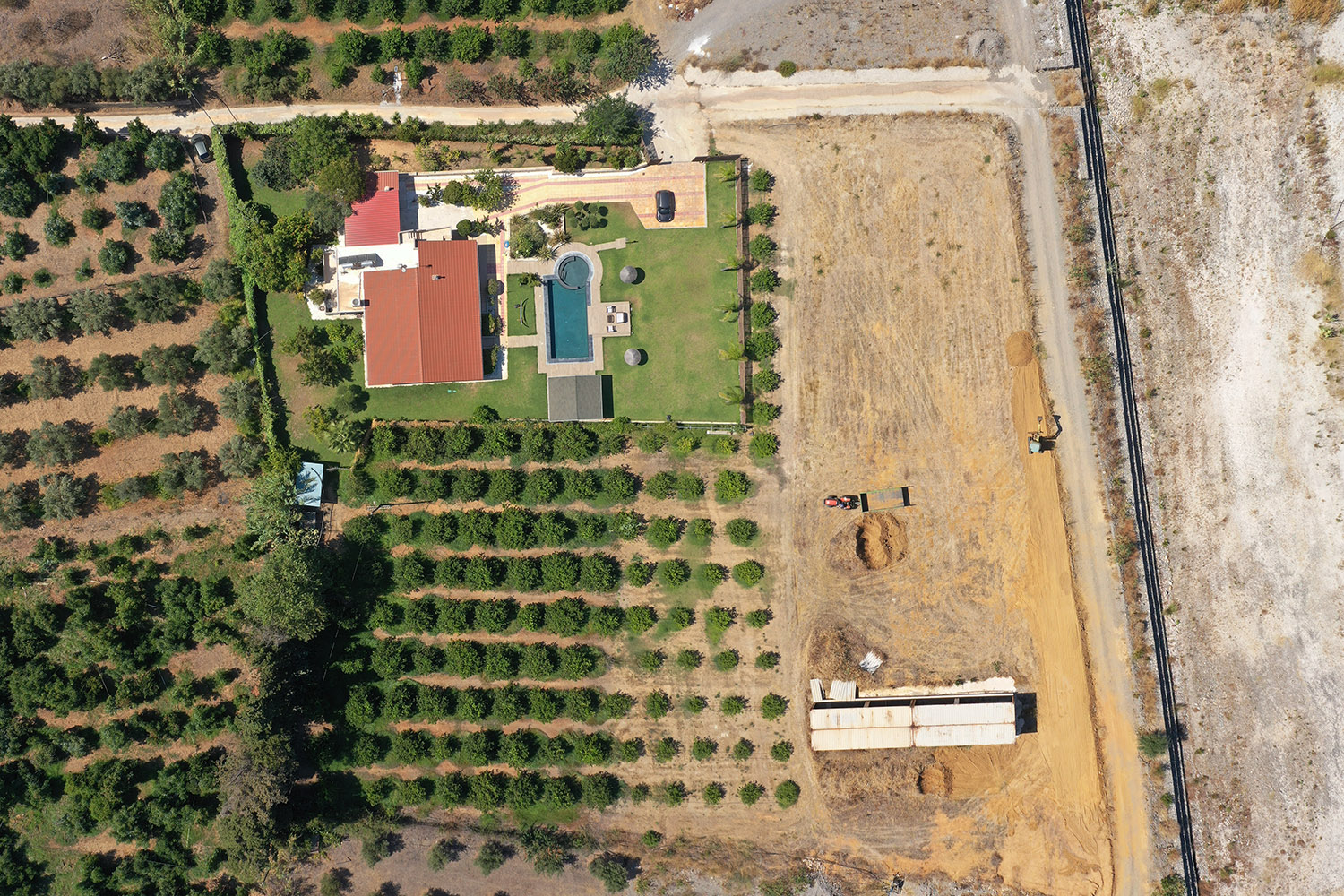 Μέχρι το σημείο φτάνει ένας βατός αγροτικός δρόμος, από όπου περνούν ελάχιστα αυτοκίνητα. Το αγροτεμάχιο του ακινήτου είναι τετράγωνο και σχεδόν επίπεδο με πολύ ήπια βορειοδυτική κλίση. Αυτή τη στιγμή έχει χωριστεί σε τρία μέρη. Η κατοικία και ο κήπος της βρίσκονται σε ένα τμήμα λίγο μεγαλύτερο των 2,000 m², το οποίο είναι οριοθετημένο με ψηλή περίφραξη. Περίπου 3,000 m² καλύπτονται από έναν όμορφο οπωρώνα με 120 λεμονιές. Στον χώρο αυτό υπάρχει πηγάδι που έχει τεθεί εκτός χρήσης αλλά μπορείτε να το διανοίξετε εκ νέου ώστε να ποτίζονται ο κήπος και τα δέντρα. Η υπόλοιπη επιφάνεια της έκτασης είναι χέρσα και έχει παραμείνει ανεκμετάλλευτη αλλά το έδαφος είναι ιδανικό για αβοκάντο ή άλλη καλλιέργεια που απαιτεί καλή αποστράγγιση.