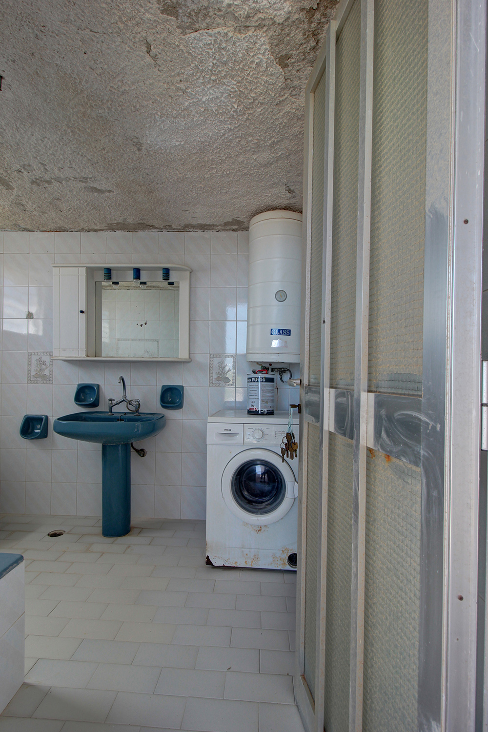 Πριν την κύρια είσοδο στο ισόγειο συναντάμε μία στεγασμένη βεράντα ενώ μία εξωτερική σκάλα παρέχει εναλλακτική ανεξάρτητη πρόσβαση στον όροφο. Μπαίνοντας στο ισόγειο συναντάμε έναν μεγάλο χώρο, όπου αυτή τη στιγμή βρίσκονται η τραπεζαρία, μία εντοιχισμένη ντουλάπα υπνοδωματίου καθώς και η εσωτερική ξύλινη σκάλα που οδηγεί στον όροφο. Το δωμάτιο αυτό μπορεί να διαχωριστεί ώστε να προστεθεί ένα υπνοδωμάτιο ή να φιλοξενήσει το σαλόνι, την τραπεζαρία και την κουζίνα, σε ενδεχόμενη ανακαίνιση. Η κουζίνα βρίσκεται αυτή τη στιγμή ακριβώς δίπλα, σε δικό της χώρο ενώ σε συνέχειά της συναντάμε το κομμάτι του σπιτιού που δεν έχει διαμορφωθεί. Επάνω ανεβαίνουμε σε έναν δεύτερο μεγάλο χώρο, ίσου μεγέθους με τον κάτω, ο οποίος και σε αυτή την περίπτωση μπορεί να στεγάσει όλους τους κύριους χώρους. Ο επάνω όροφος αποτελείται από ένα μεγάλο υπνοδωμάτιο και το τωρινό μπάνιο, το οποίο εφάπτεται με το κτήριο αλλά είναι εξωτερικό. Ο όροφος έχει εξόδους σε μπαλκόνια από το σαλόνι στην πρόσοψη και από το υπνοδωμάτιο πίσω και ανατολικά, με θέα στη θάλασσα και στην κορυφογραμμή των Λευκών Ορέων, αντίστοιχα.