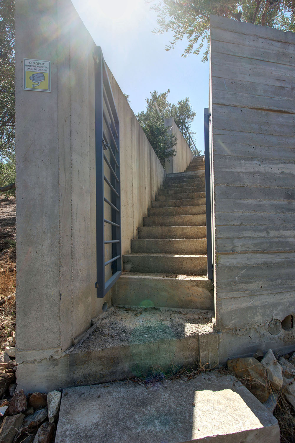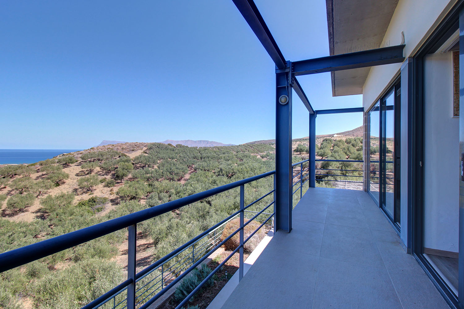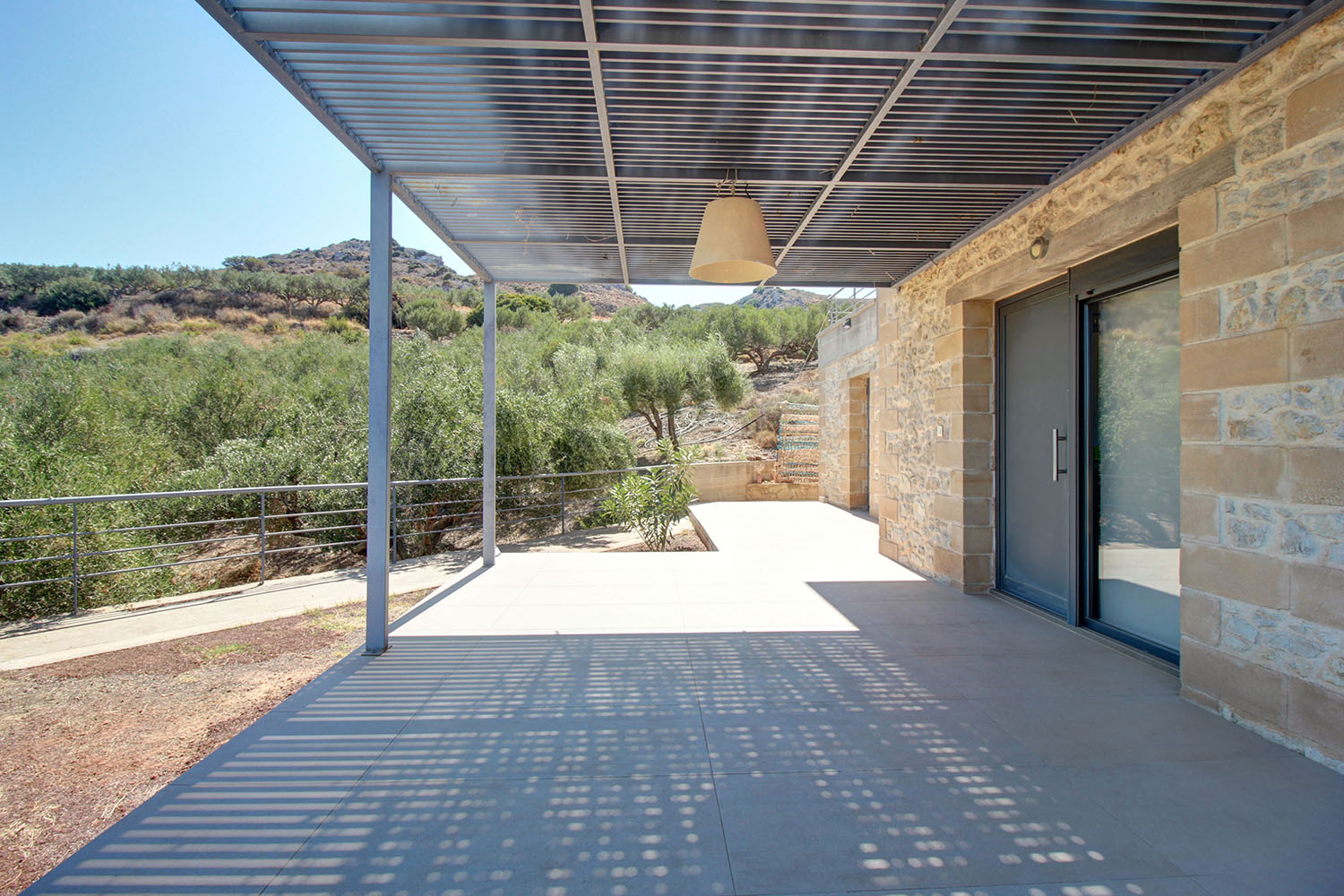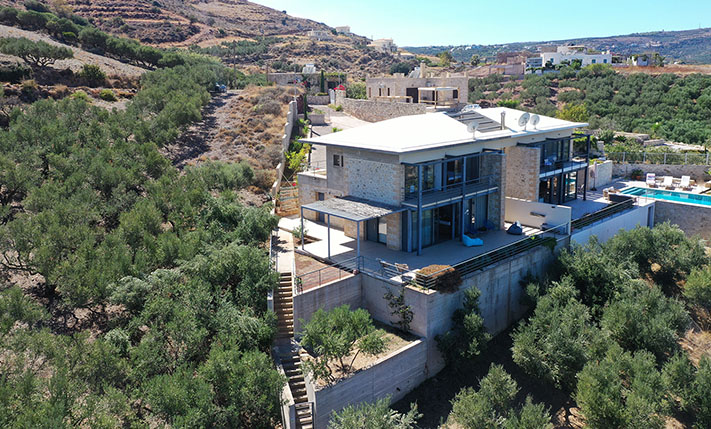 Η ιδιοκτησία είναι σε ένα συγκρότημα δύο πολυτελών κατοικιών, κάθε μία από τις οποίες έχει ένα μεγάλο οικόπεδο στην αποκλειστική της χρήση. Μοιράζονται μόνο έναν μεγάλο χώρο στάθμευσης 318 m² στην πρόσοψή τους. Το εν λόγω ακίνητο καταλαμβάνει το ανατολικό τμήμα και έχει εμβαδόν 1,023 m². Το κτήριο είναι σύγχρονο και έχει κατασκευαστεί με μεταλλικό σκελετό και τοίχους από τοπική πέτρα. Έχει μεγάλα ανοίγματα από όπου μπαίνει άπλετο φως καθώς και πολλά μοντέρνα στοιχεία, τα οποία δένουν άριστα με τα παραδοσιακά υλικά. Τα σπίτια είναι έξυπνα σχεδιασμένα ώστε να υπάρχει άριστη μεταξύ τους ιδιωτικότητα ενώ είναι προσανατολισμένα προς τη θάλασσα ώστε να απολαμβάνουν εντυπωσιακή θέα επάνω από τον ιδιωτικό τους ελαιώνα, στην κατάφυτη γύρω περιοχή και μέχρι τη θάλασσα στο βάθος.