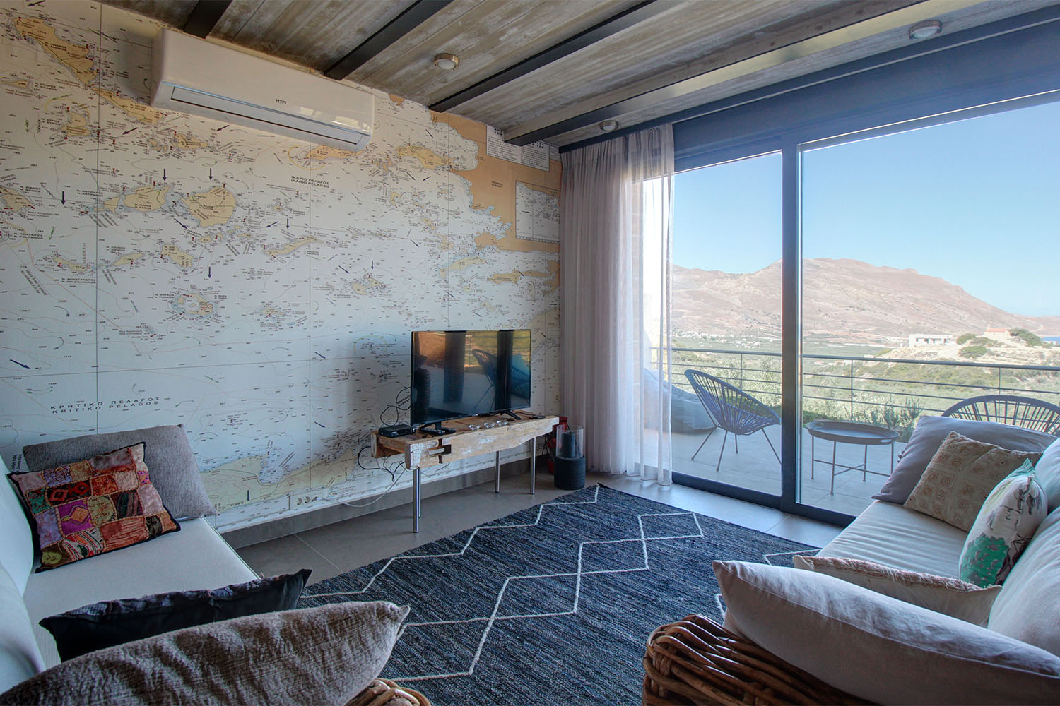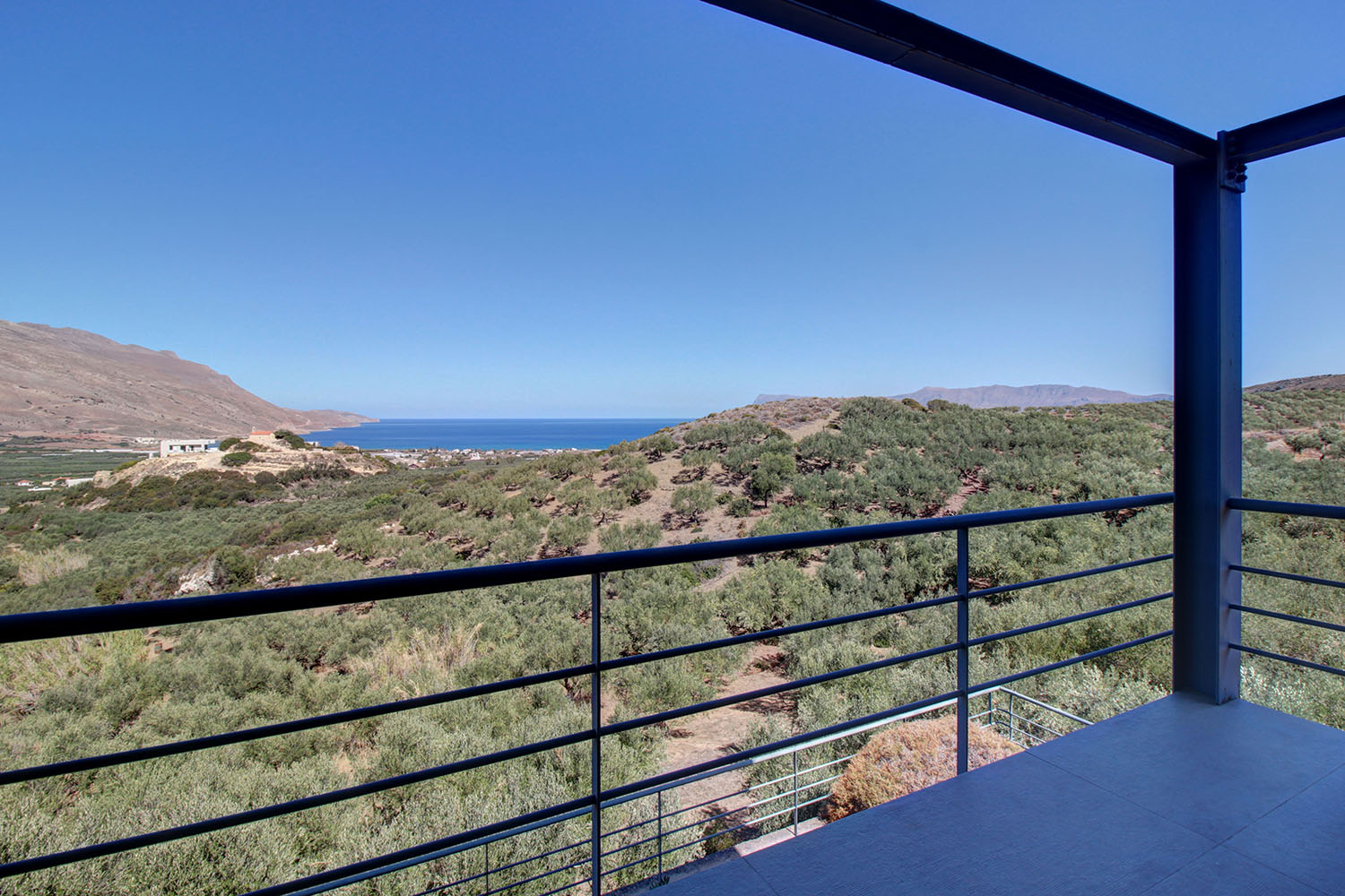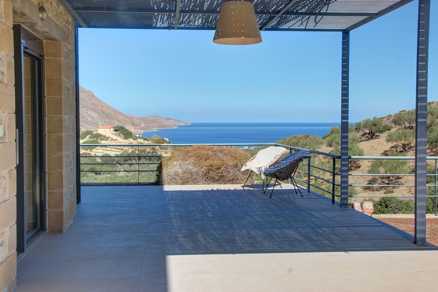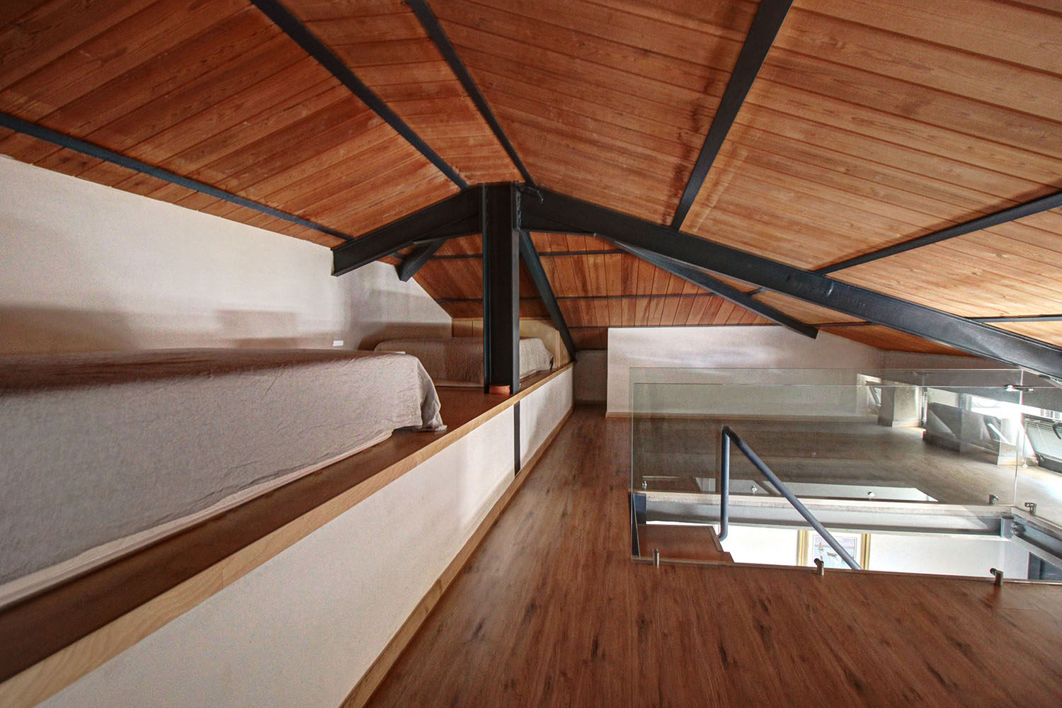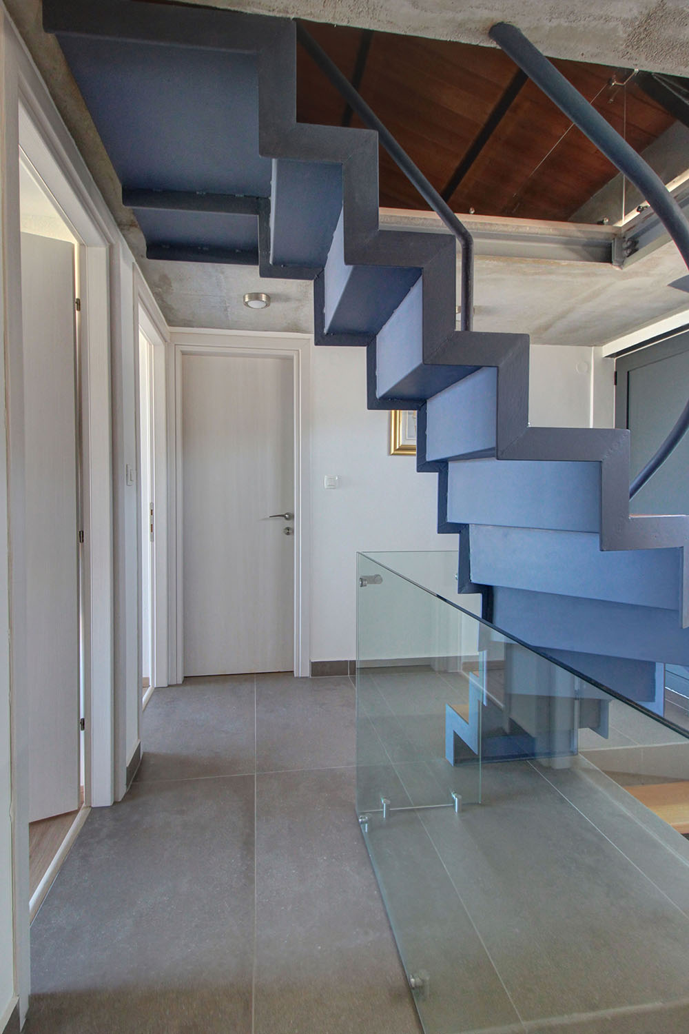 Μεταλλικές σκάλες με ξύλινα πατήματα ενοποιούν εσωτερικά όλα τα επίπεδα. Ο επάνω όροφος φιλοξενεί δύο μεγάλα υπνοδωμάτια, καθένα με μπάνιο στη χρήση του. Και τα δύο επίσης βγαίνουν σε ένα βορινό μπαλκόνι με εντυπωσιακή θέα. Μία πόρτα βγάζει, επίσης, σε ένα δεύτερο μπαλκόνι στη νότια όψη, το οποίο έχει ήλιο όλες τις ώρες της ημέρας. Το κεντρικό κλιμακοστάσιο καταλήγει στο πατάρι, το οποίο χρησιμοποιείται σαν τέταρτη κρεβατοκάμαρα-ξενώνας.
