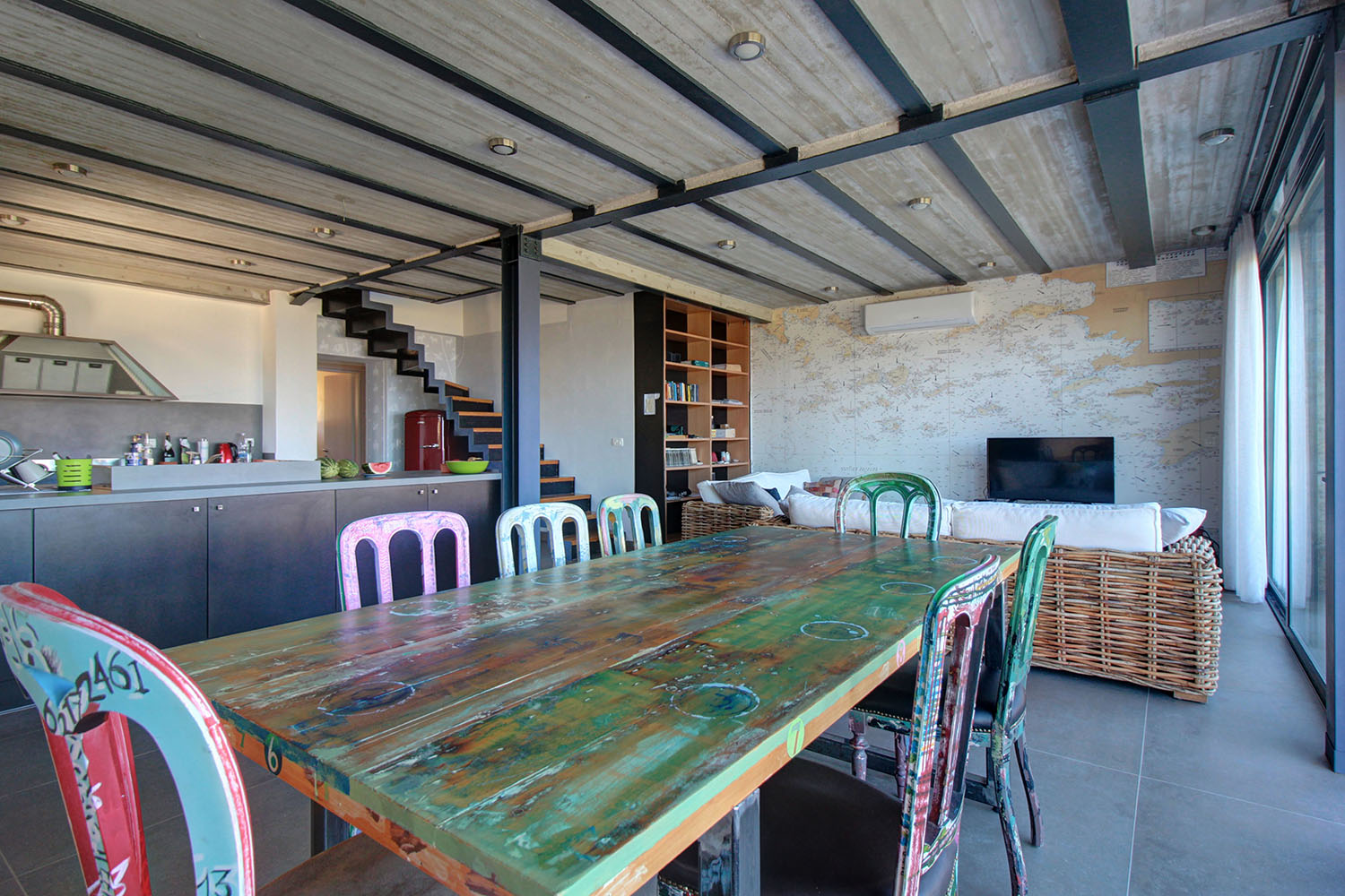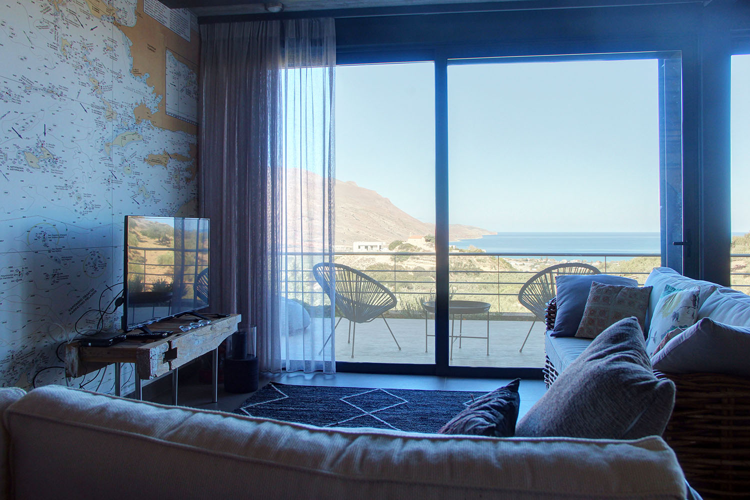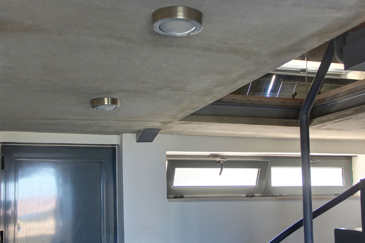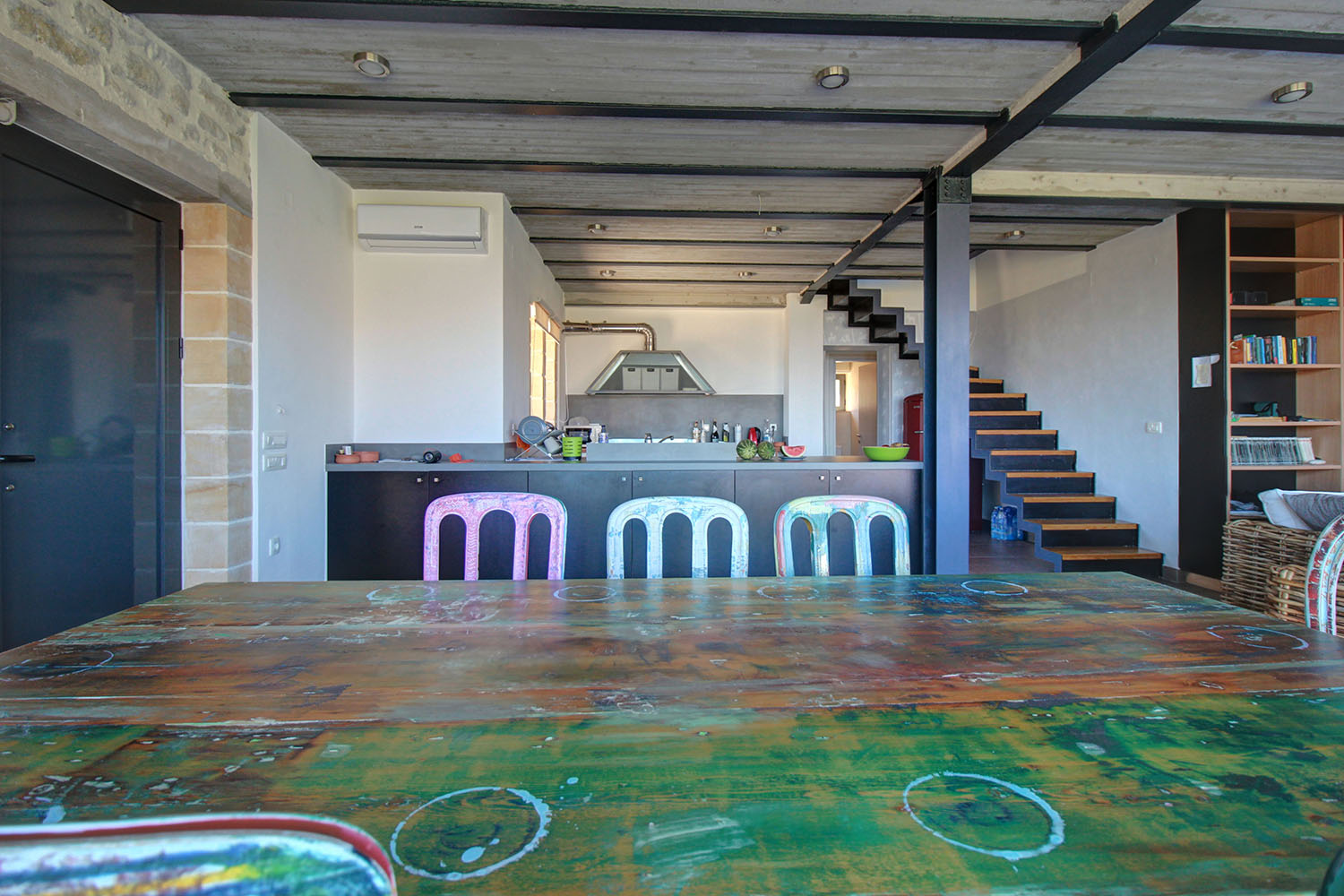 Μεταλλικές σκάλες με ξύλινα πατήματα ενοποιούν εσωτερικά όλα τα επίπεδα. Ο επάνω όροφος φιλοξενεί δύο μεγάλα υπνοδωμάτια, καθένα με μπάνιο στη χρήση του. Και τα δύο επίσης βγαίνουν σε ένα βορινό μπαλκόνι με εντυπωσιακή θέα. Μία πόρτα βγάζει, επίσης, σε ένα δεύτερο μπαλκόνι στη νότια όψη, το οποίο έχει ήλιο όλες τις ώρες της ημέρας. Το κεντρικό κλιμακοστάσιο καταλήγει στο πατάρι, το οποίο χρησιμοποιείται σαν τέταρτη κρεβατοκάμαρα-ξενώνας.