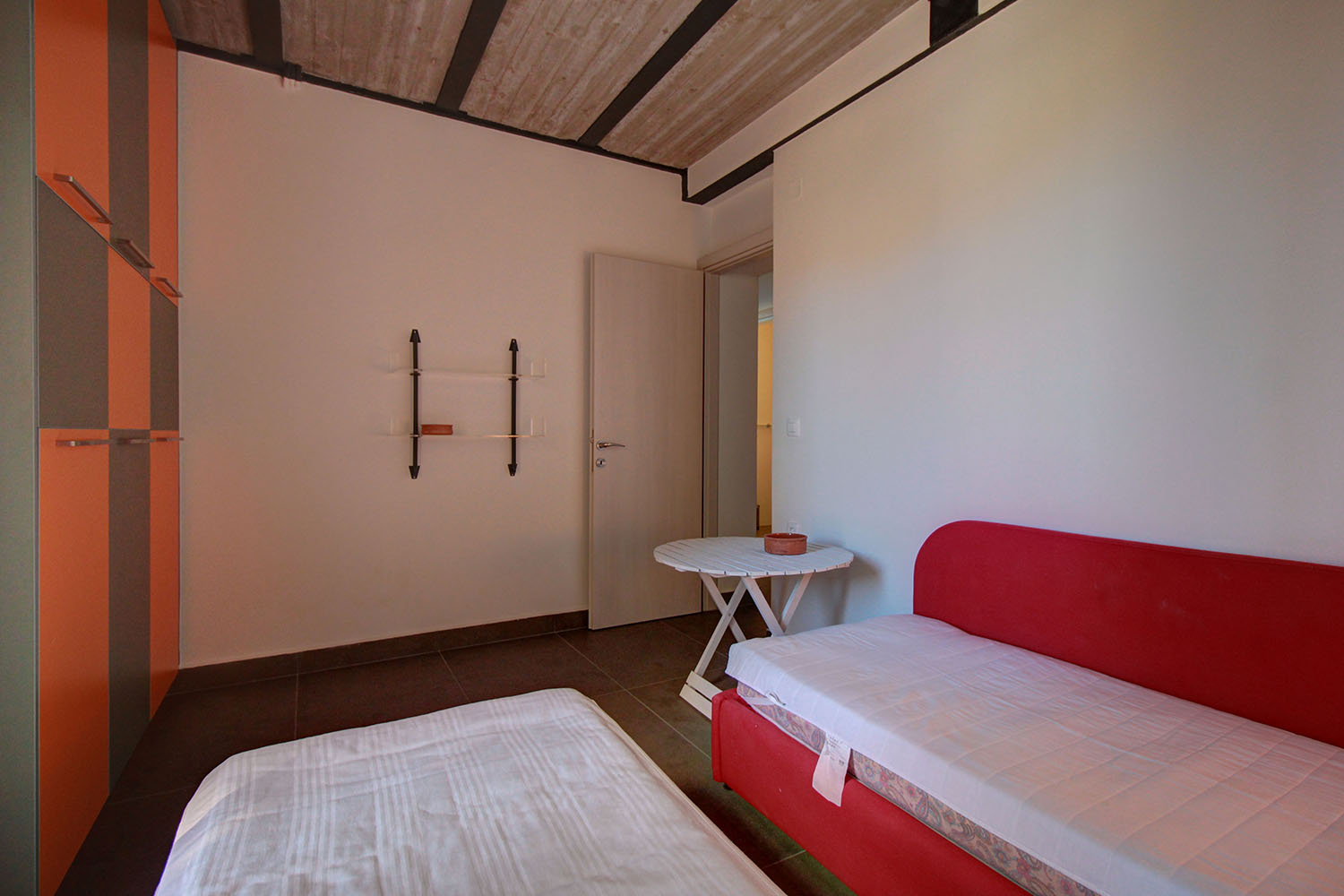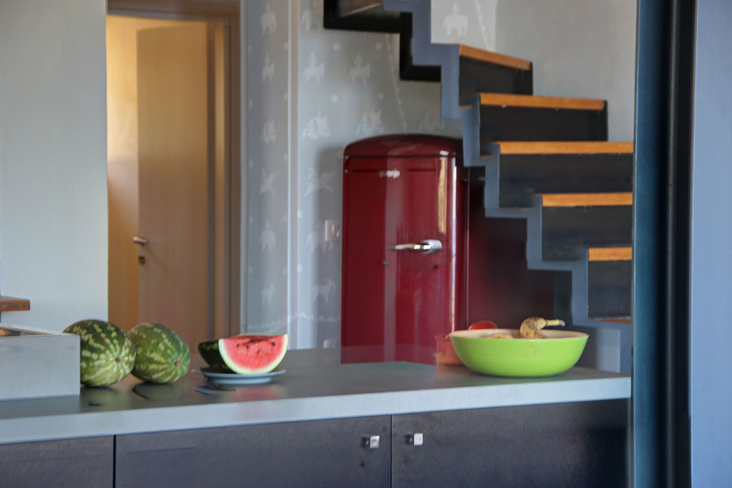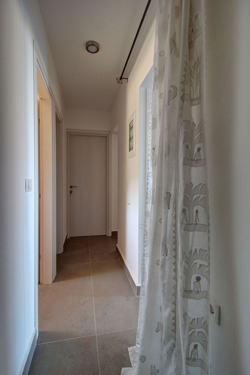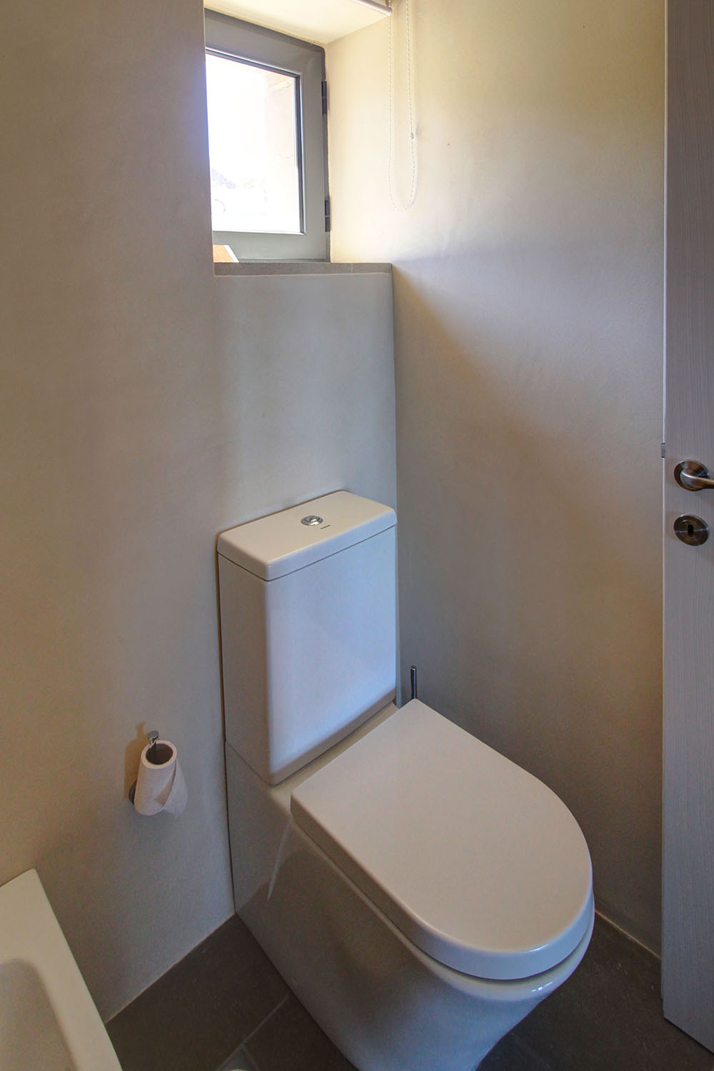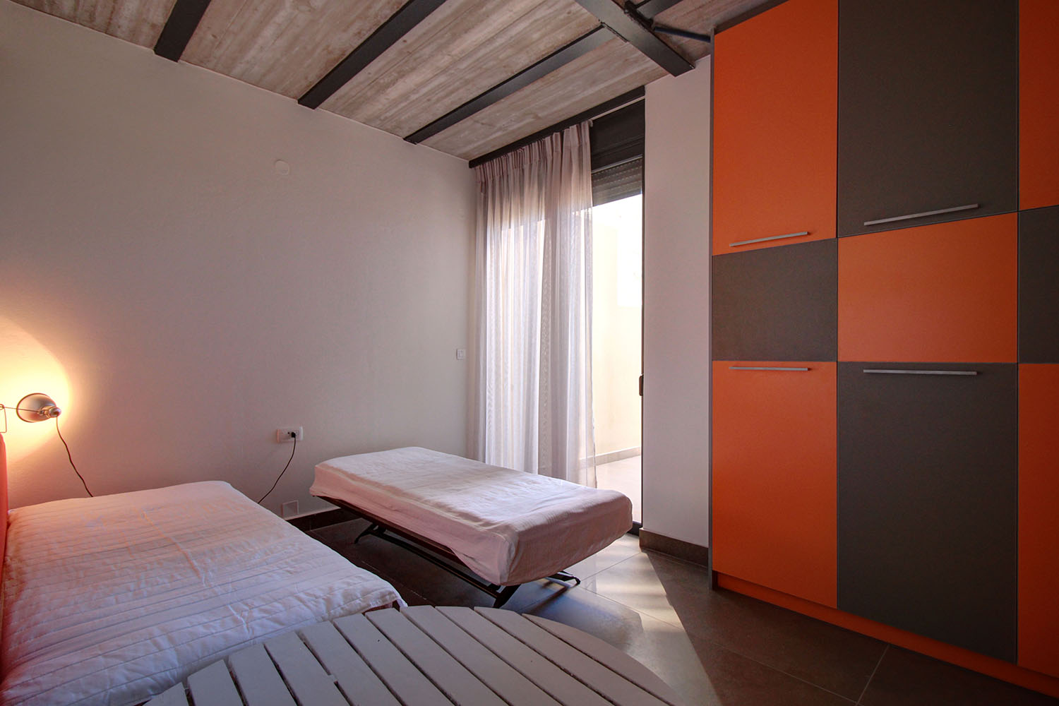 Μεταλλικές σκάλες με ξύλινα πατήματα ενοποιούν εσωτερικά όλα τα επίπεδα. Ο επάνω όροφος φιλοξενεί δύο μεγάλα υπνοδωμάτια, καθένα με μπάνιο στη χρήση του. Και τα δύο επίσης βγαίνουν σε ένα βορινό μπαλκόνι με εντυπωσιακή θέα. Μία πόρτα βγάζει, επίσης, σε ένα δεύτερο μπαλκόνι στη νότια όψη, το οποίο έχει ήλιο όλες τις ώρες της ημέρας. Το κεντρικό κλιμακοστάσιο καταλήγει στο πατάρι, το οποίο χρησιμοποιείται σαν τέταρτη κρεβατοκάμαρα-ξενώνας.
