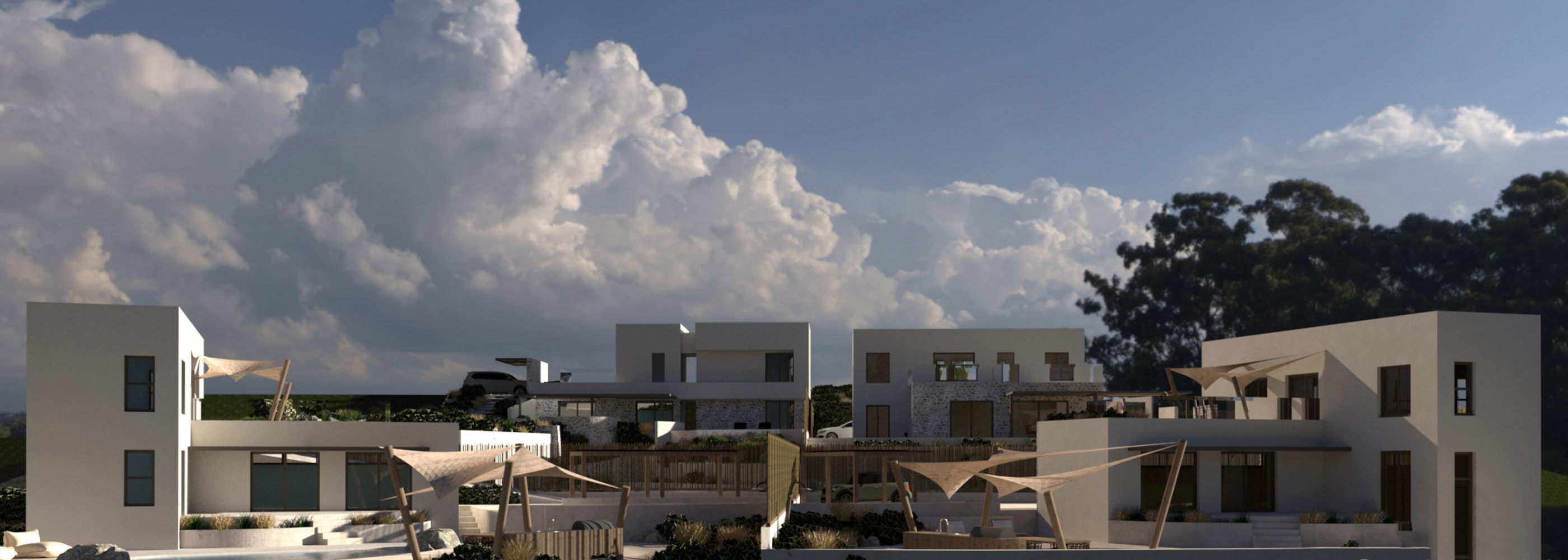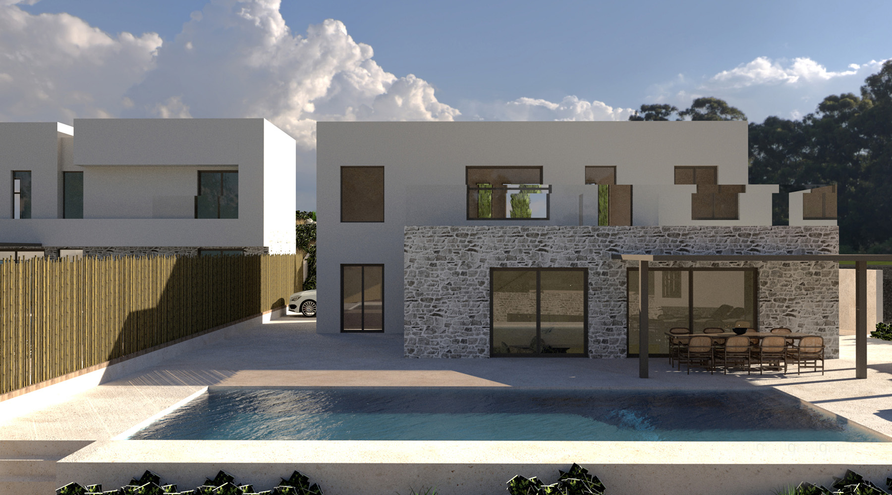 Η κατοικία θα κατασκευαστεί σε ένα πολυτελές συγκρότημα τεσσάρων ιδιοκτησιών, οι οποίες είναι αυτόνομες καθώς κάθε μία έχει οικόπεδο και πισίνα στην αποκλειστική της χρήση. Η εν λόγω κατοικία είναι σε δύο επίπεδα με ισόγειο 96 m² και όροφο 59 m². Θα κατασκευαστεί σε οικόπεδο 841 m² με χώρους στάθμευσης, αυλές και χώρο για έναν όμορφο κήπο. Στην τιμή διάθεσης θα συμπεριληφθεί, επίσης, ιδιωτική πισίνα 50 m².