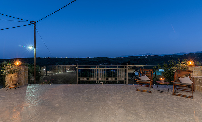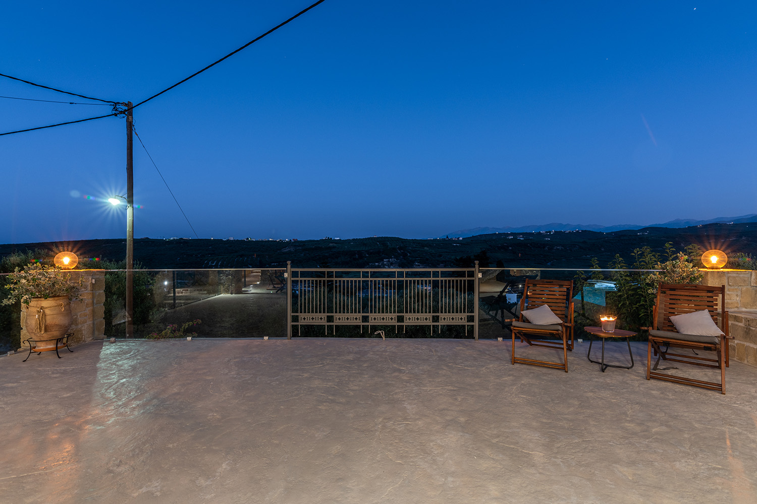 Το κτήριο είναι υπερυψωμένο σε σχέση με τον δρόμο που περνά ακριβώς μπροστά ενώ γύρω του έχουν τοποθετηθεί τοιχία και φύτευση. Ως εκ τούτου προσφέρει εξαιρετική ιδιωτικότητα, αν και βρίσκεται σχεδόν στο κέντρο του χωριού και μάλιστα χωρίς να χάνει καθόλου από την όμορφη θέα που προσφέρει το σημείο. Το οικόπεδο είναι άριστα προσανατολισμένο σε μία νοτιοανατολική πλαγιά και από όλες τις στάθμες κοιτά ανεμπόδιστα προς τα Λευκά Όρη, επάνω από έναν κατάφυτο κάμπο και μέχρι τη θάλασσα στο βάθος. Είναι, επίσης, οριοθετημένο περιμετρικά ώστε να είναι ιδανικό για να περιορίσετε τα κατοικίδιά σας ή για να παίζουν τα παιδιά σας με ασφάλεια. Στο επίπεδο του δρόμου έχει φτιαχτεί ένα μεγάλο γκαράζ, όπου σε 82 m² μπορούν να στεγαστούν ως και τρία οχήματα. Ακριβώς δίπλα υπάρχει μία πόρτα επισκεπτών, από όπου με σκαλοπάτια περνάμε στο επίπεδο του ισογείου. Οι εξωτερικοί χώροι είναι στρωμένοι με αυλές ώστε να διευκολύνεται η συντήρησή τους ενώ σε μία περίοπτη γωνία έχει τοποθετηθεί η ιδιωτική πισίνα του σπιτιού.