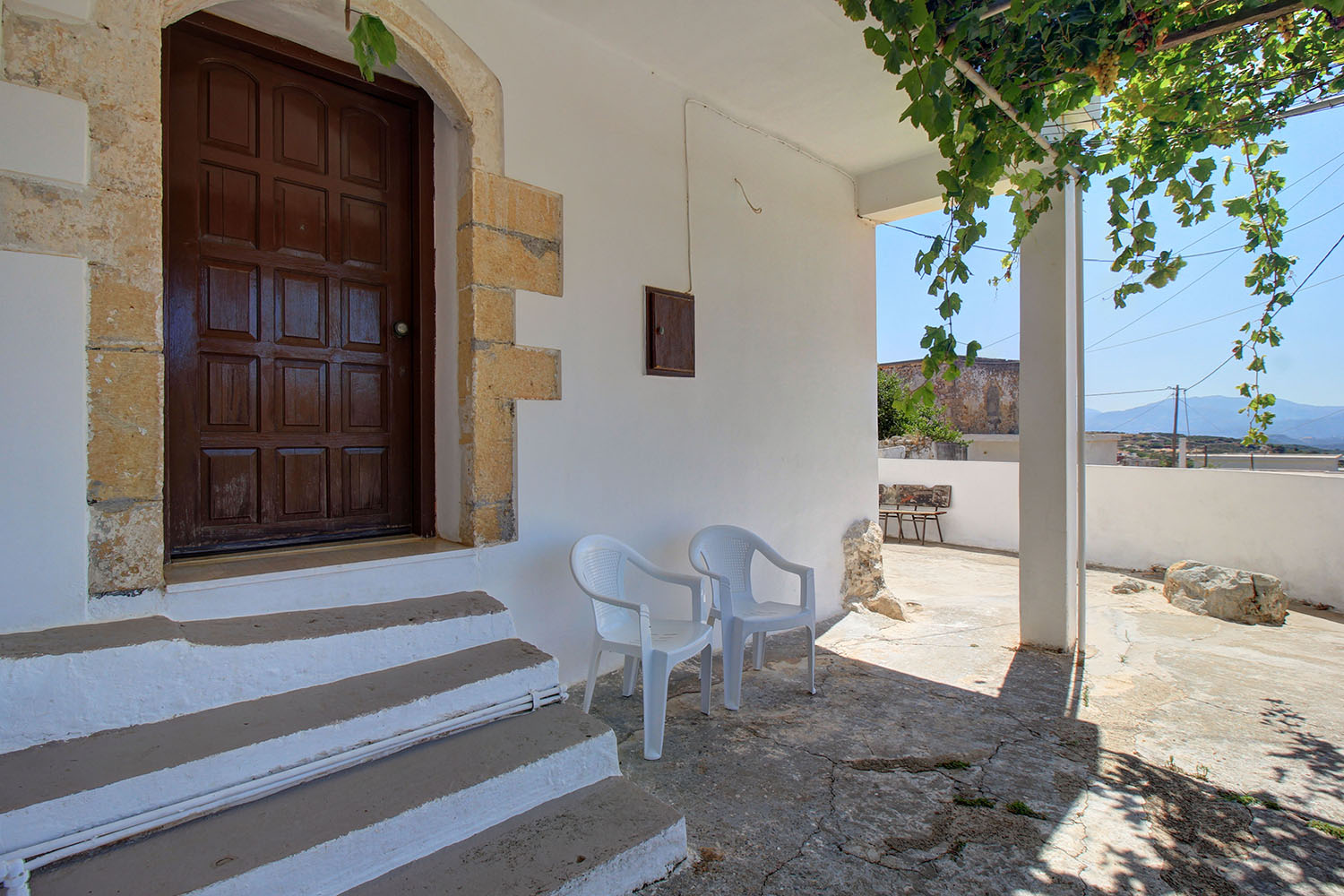 Το σπίτι είναι υπερυψωμένο ώστε να έχει ιδιωτικότητα σε σχέση με τον δρόμο που περνά ακριβώς μπροστά του ενώ πριν την κύρια είσοδο μας υποδέχεται μία αυλή που σκεπάζεται με κληματαριά. Η θέα είναι όμορφη ακόμα και από το ισόγειο και το κτήριο είναι προσανατολισμένο νοτιοδυτικά, ώστε να βλέπει επάνω από το χωριό καθώς και στο βάθος μέχρι τη δυτική κορυφογραμμή των Λευκών Ορέων. Στο εσωτερικό μας υποδέχεται ένα φαρδύ χολ, το οποίο επικοινωνεί με την κουζίνα που είναι σε δικό της χώρο, με το μπάνιο του σπιτιού καθώς και με έναν χώρο σαλονιού και τραπεζαρίας. Μία ξύλινη σκάλα οδηγεί επάνω, σε δύο δωμάτια κάθε ένα από τα οποία χρησιμοποιείται σαν υπνοδωμάτιο. Η πρόσβαση του ενός είναι μέσω του άλλου αλλά το μέγεθός τους είναι πέραν του επαρκούς αν θελήσετε να φτιάξετε μεταξύ τους διάδρομο για να δοθεί ανεξάρτητη πρόσβαση. Ο όροφος βγαίνει σε ένα μεγάλο μπαλκόνι, μέρος του οποίου είναι στεγασμένο με πέργκολα. Στην τιμή πώλησης του σπιτιού συμπεριλαμβάνονται όλη η υφιστάμενη επίπλωση και οι ηλεκτρικές συσκευές.