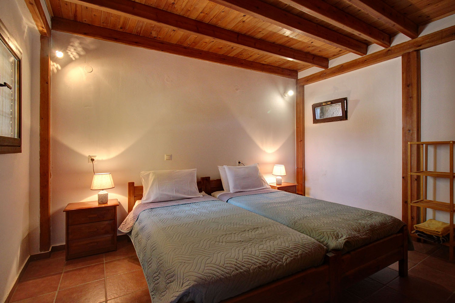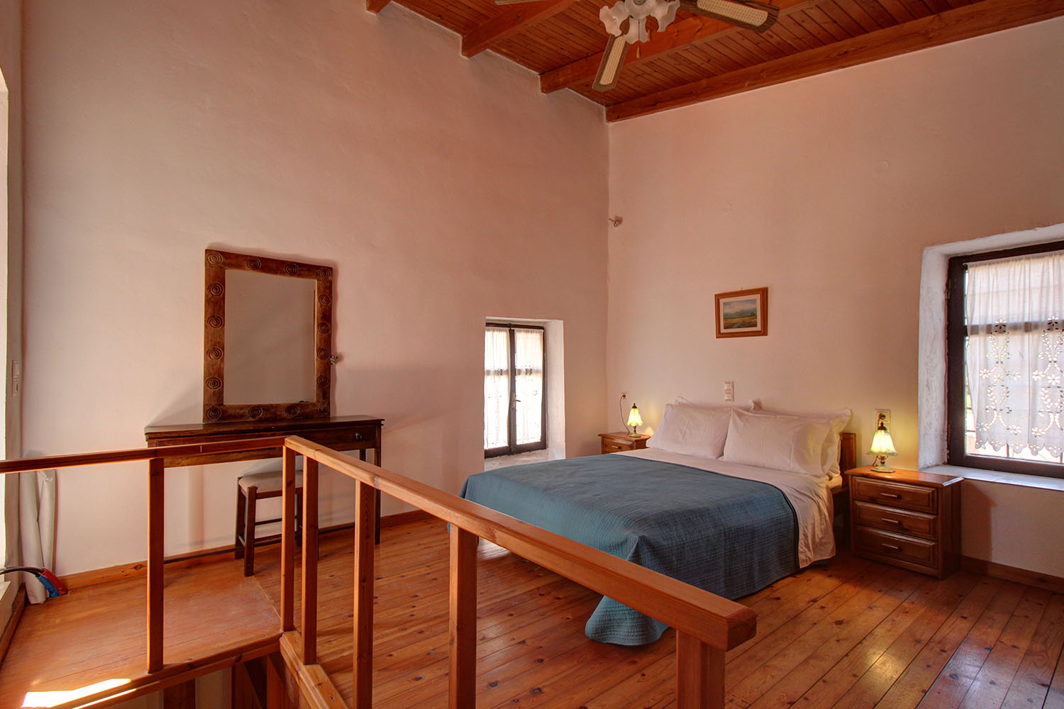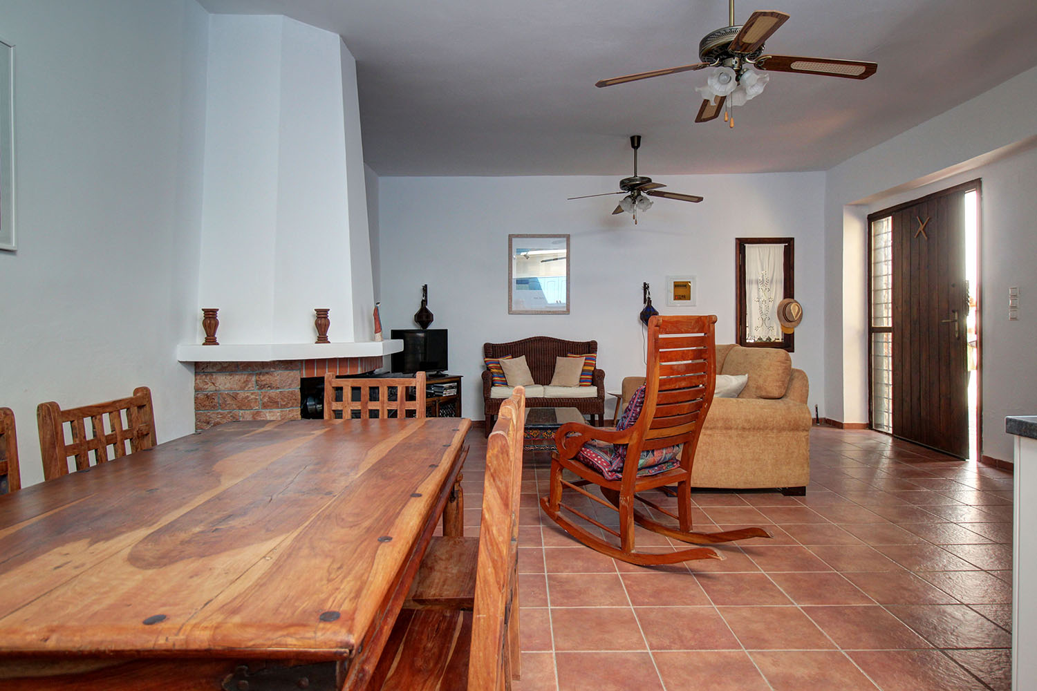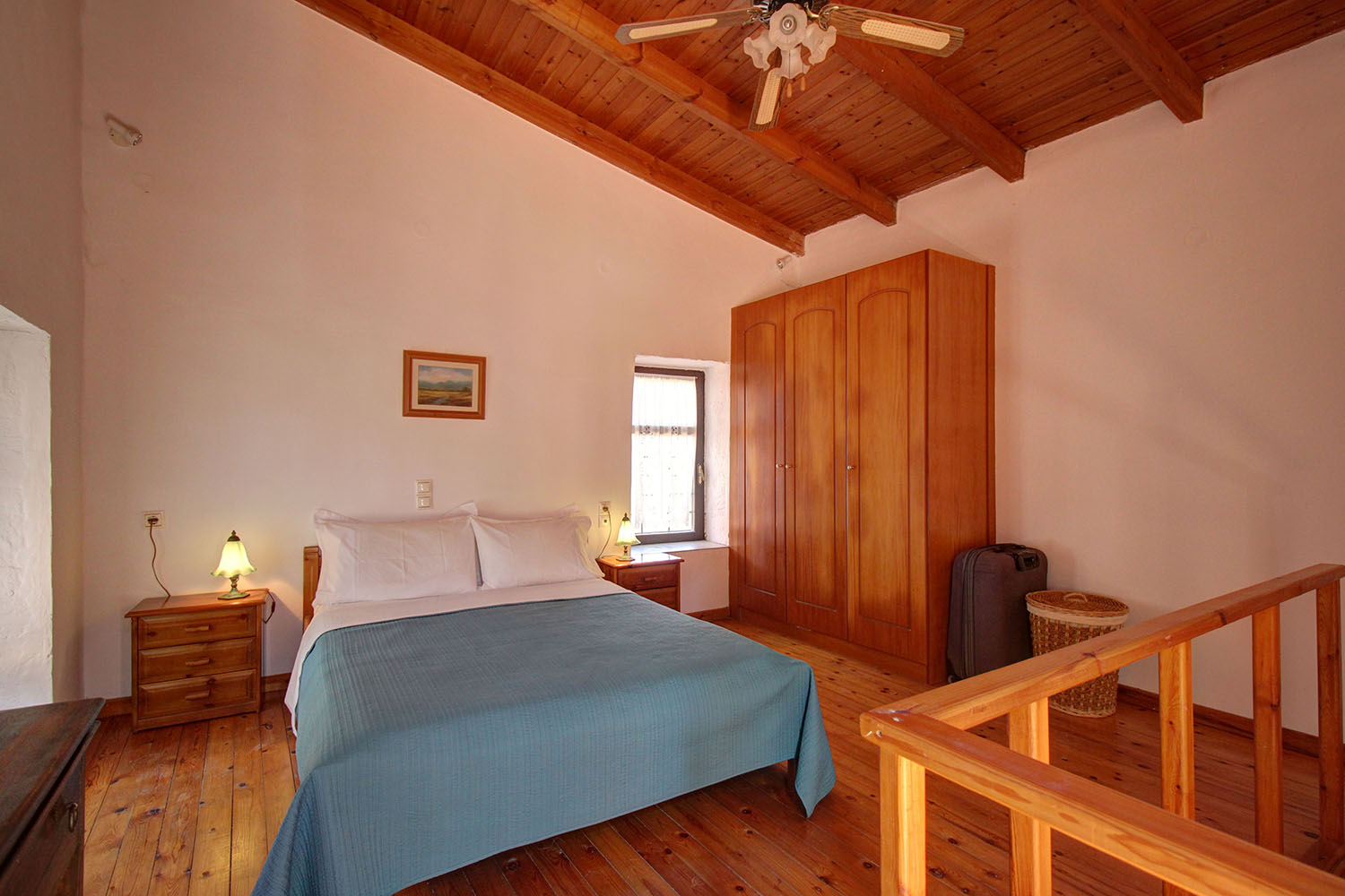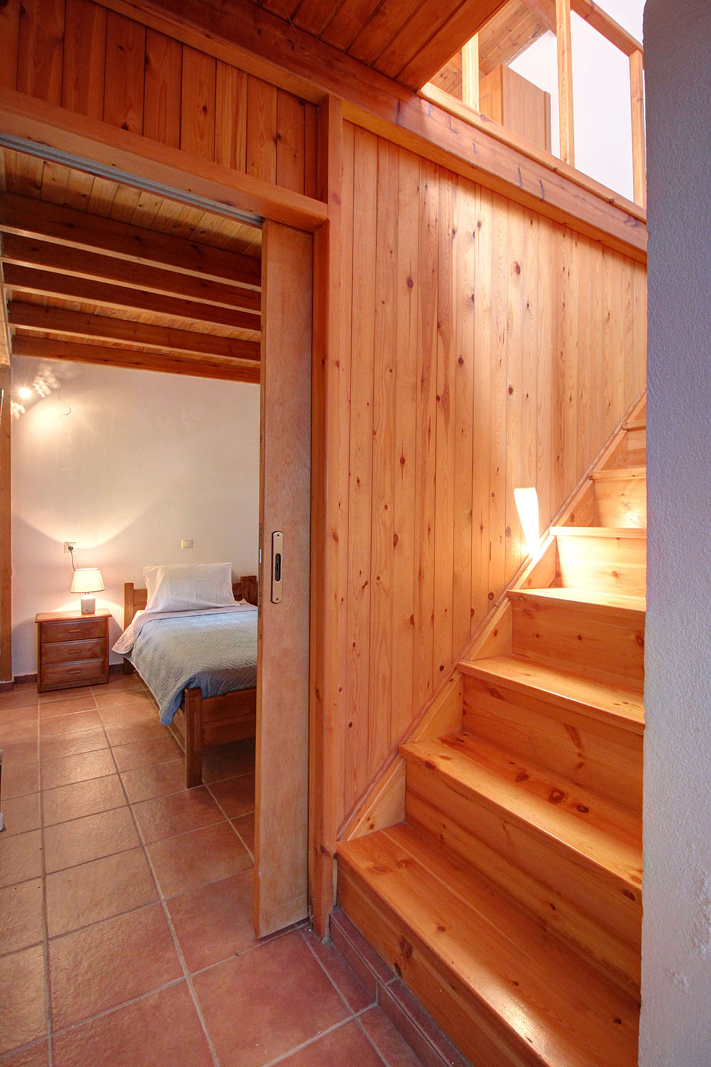 Στο ισόγειο μας υποδέχεται ένας όμορφος ενιαίος χώρος όπου βρίσκονται το σαλόνι, η τραπεζαρία και η κουζίνα. Στο σαλόνι υπάρχει ένα κεντρικό τζάκι που προσθέτει θαλπωρή στον χώρο, όπου έχει τοποθετηθεί μαντεμένια ξυλόσομπα για διευκόλυνση χρήσης. Η κουζίνα φωτίζεται όμορφα με φωταγωγό οροφής και έχει μεγάλο πάγκο και πολλά ντουλάπια. Στο ισόγειο βρίσκονται, επίσης, το ένα από τα υπνοδωμάτια, καθώς και ένα άνετο μπάνιο, που συνδυαστικά με μικρές παρεμβάσεις μπορούν να καταστήσουν το μεγαλύτερο μέρος της οικίας προσβάσιμο από άτομα με κινητικές δυσκολίες. Μία ξύλινη σκάλα οδηγεί επάνω, σε ένα μεγάλο υπνοδωμάτιο με ξύλινο πάτωμα και ταβάνι. Βασικό προσόν του σπιτιού αποτελεί το μεγάλο μπαλκόνι του ορόφου το οποίο είναι προσβάσιμο και από εξωτερική σκάλα. Είναι σχεδόν 50 m² και ένα μέρος του είναι στεγασμένο με πέργκολα. Ο όροφος έχει επίσης ένα εξωτερικό WC το οποίο είναι προσβάσιμο εξωτερικά και διαθέτει ντους.