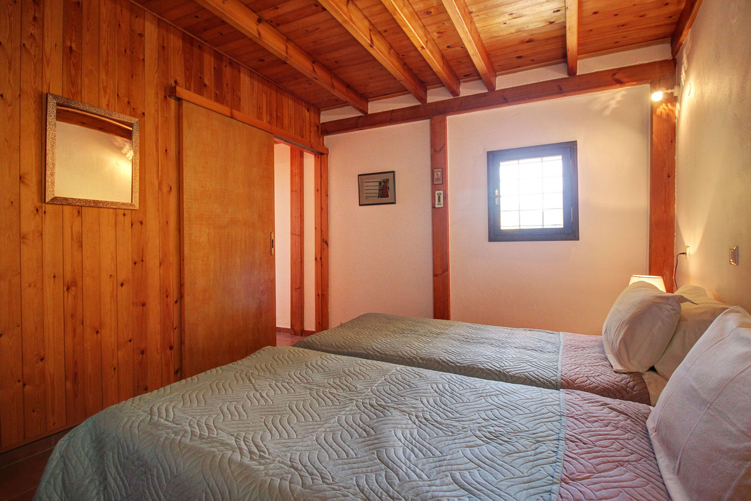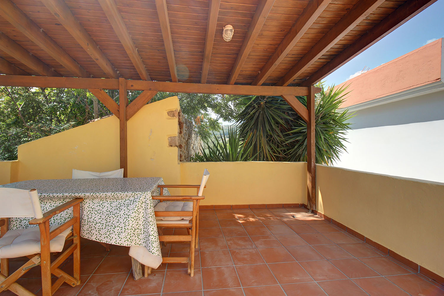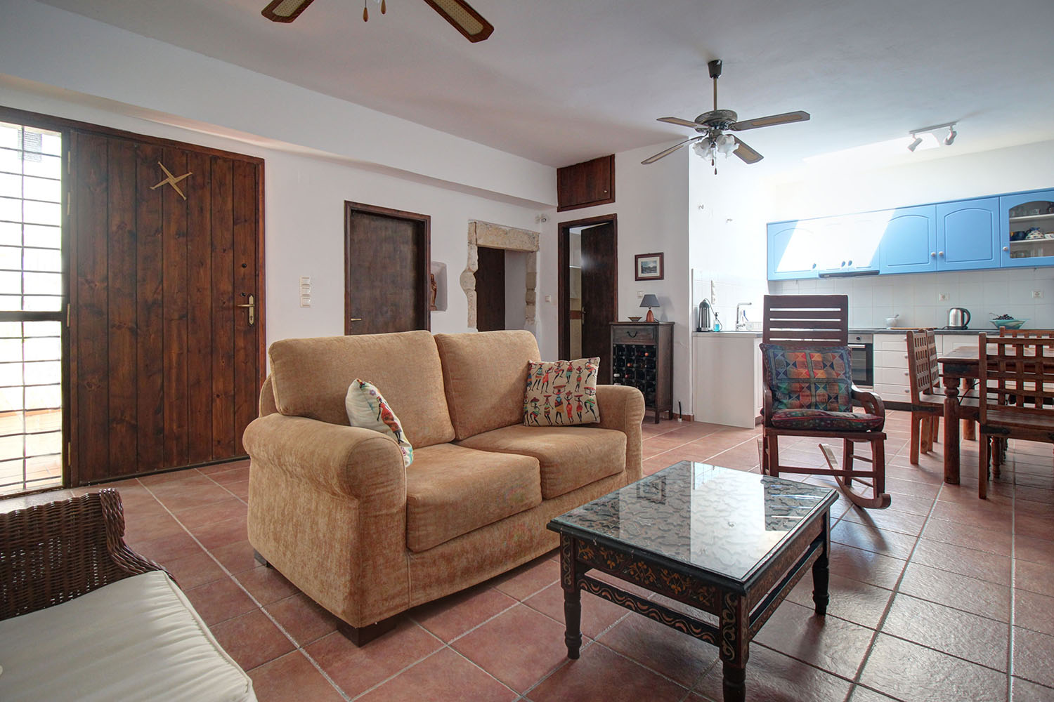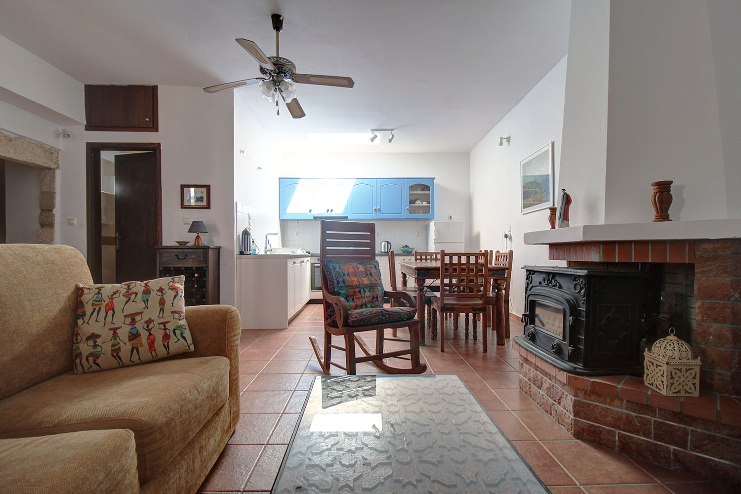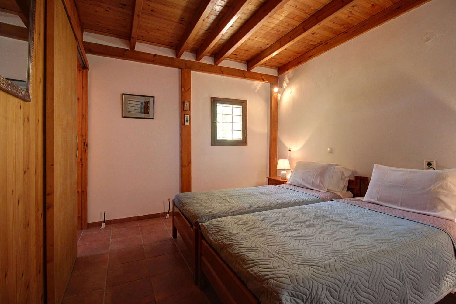 Στο ισόγειο μας υποδέχεται ένας όμορφος ενιαίος χώρος όπου βρίσκονται το σαλόνι, η τραπεζαρία και η κουζίνα. Στο σαλόνι υπάρχει ένα κεντρικό τζάκι που προσθέτει θαλπωρή στον χώρο, όπου έχει τοποθετηθεί μαντεμένια ξυλόσομπα για διευκόλυνση χρήσης. Η κουζίνα φωτίζεται όμορφα με φωταγωγό οροφής και έχει μεγάλο πάγκο και πολλά ντουλάπια. Στο ισόγειο βρίσκονται, επίσης, το ένα από τα υπνοδωμάτια, καθώς και ένα άνετο μπάνιο, που συνδυαστικά με μικρές παρεμβάσεις μπορούν να καταστήσουν το μεγαλύτερο μέρος της οικίας προσβάσιμο από άτομα με κινητικές δυσκολίες. Μία ξύλινη σκάλα οδηγεί επάνω, σε ένα μεγάλο υπνοδωμάτιο με ξύλινο πάτωμα και ταβάνι. Βασικό προσόν του σπιτιού αποτελεί το μεγάλο μπαλκόνι του ορόφου το οποίο είναι προσβάσιμο και από εξωτερική σκάλα. Είναι σχεδόν 50 m² και ένα μέρος του είναι στεγασμένο με πέργκολα. Ο όροφος έχει επίσης ένα εξωτερικό WC το οποίο είναι προσβάσιμο εξωτερικά και διαθέτει ντους.