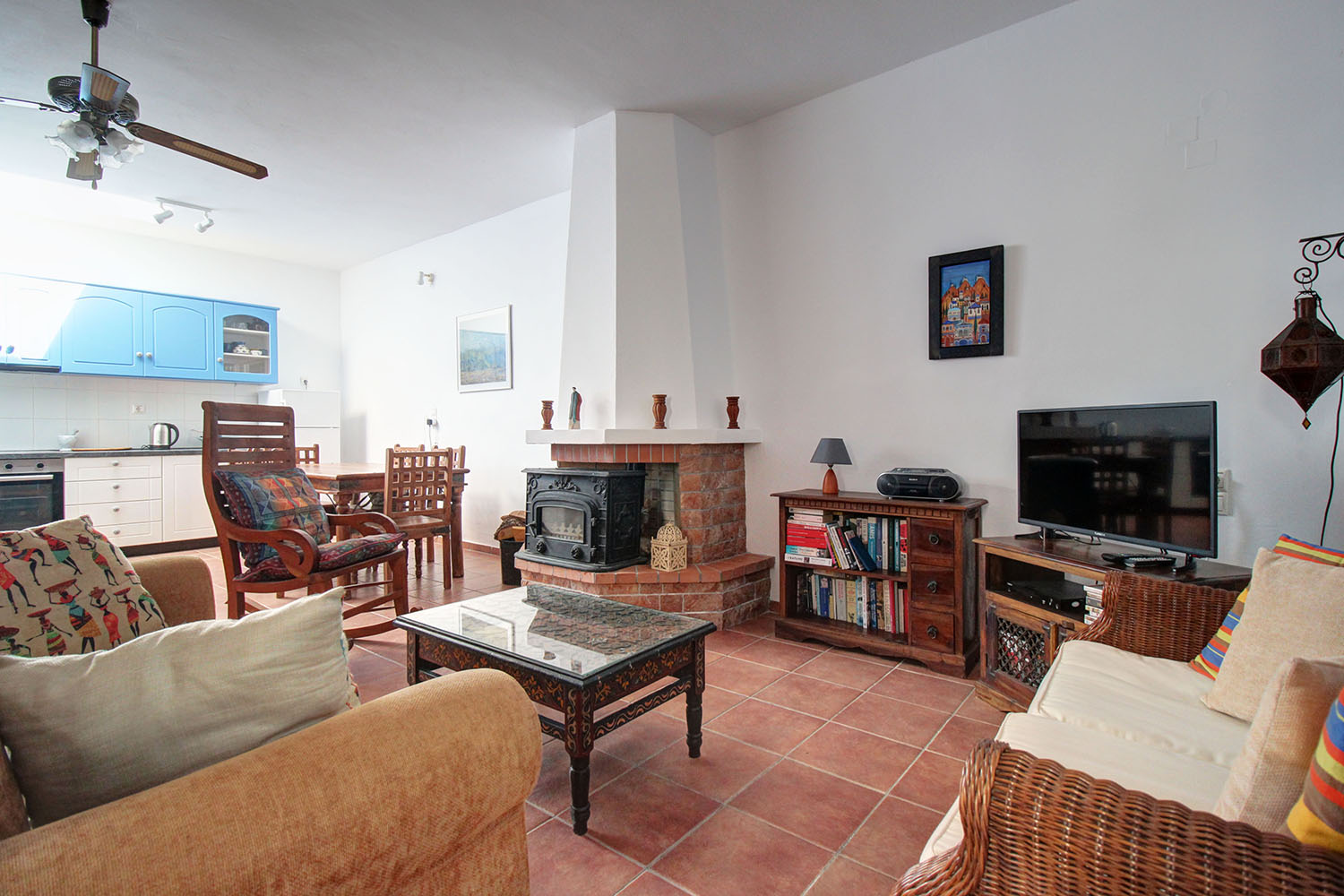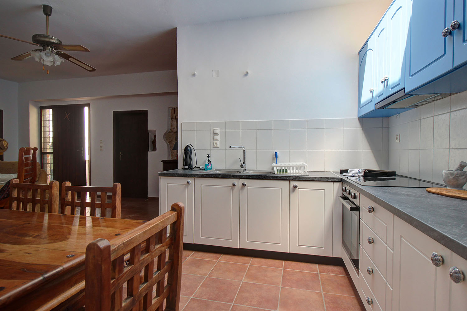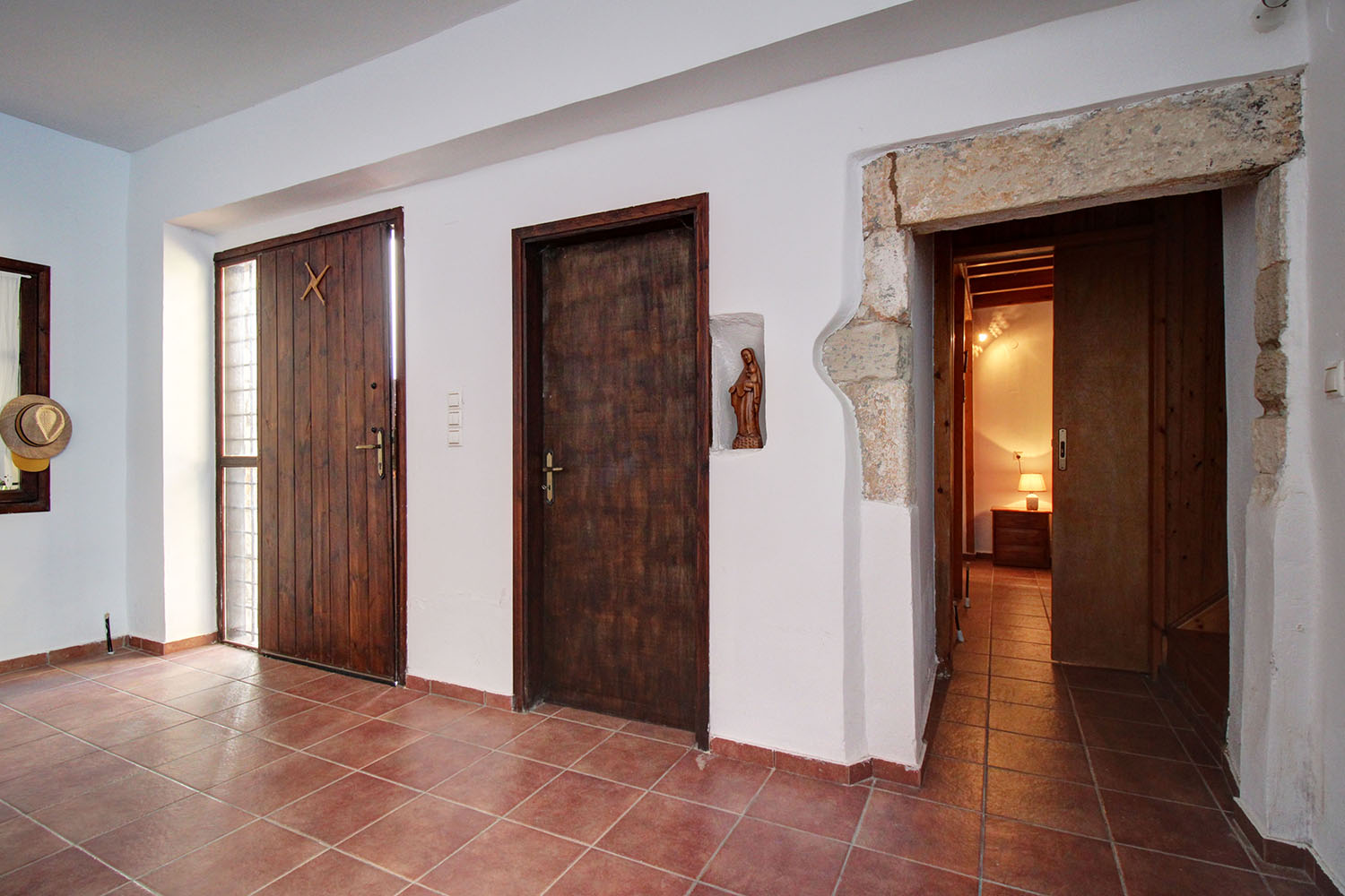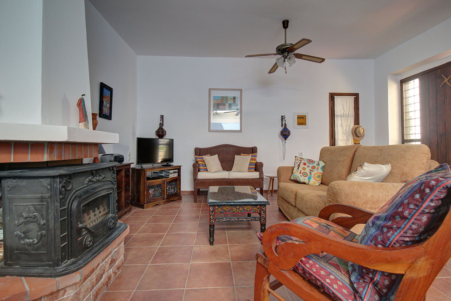 Στο ισόγειο μας υποδέχεται ένας όμορφος ενιαίος χώρος όπου βρίσκονται το σαλόνι, η τραπεζαρία και η κουζίνα. Στο σαλόνι υπάρχει ένα κεντρικό τζάκι που προσθέτει θαλπωρή στον χώρο, όπου έχει τοποθετηθεί μαντεμένια ξυλόσομπα για διευκόλυνση χρήσης. Η κουζίνα φωτίζεται όμορφα με φωταγωγό οροφής και έχει μεγάλο πάγκο και πολλά ντουλάπια. Στο ισόγειο βρίσκονται, επίσης, το ένα από τα υπνοδωμάτια, καθώς και ένα άνετο μπάνιο, που συνδυαστικά με μικρές παρεμβάσεις μπορούν να καταστήσουν το μεγαλύτερο μέρος της οικίας προσβάσιμο από άτομα με κινητικές δυσκολίες. Μία ξύλινη σκάλα οδηγεί επάνω, σε ένα μεγάλο υπνοδωμάτιο με ξύλινο πάτωμα και ταβάνι. Βασικό προσόν του σπιτιού αποτελεί το μεγάλο μπαλκόνι του ορόφου το οποίο είναι προσβάσιμο και από εξωτερική σκάλα. Είναι σχεδόν 50 m² και ένα μέρος του είναι στεγασμένο με πέργκολα. Ο όροφος έχει επίσης ένα εξωτερικό WC το οποίο είναι προσβάσιμο εξωτερικά και διαθέτει ντους.