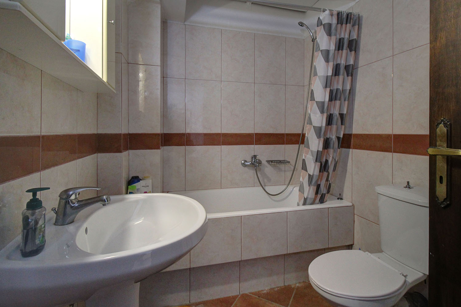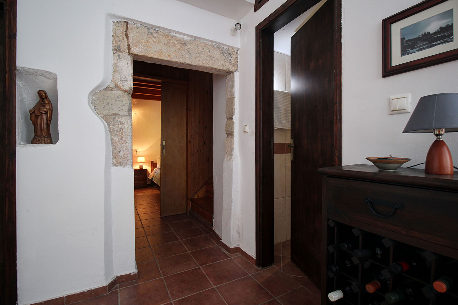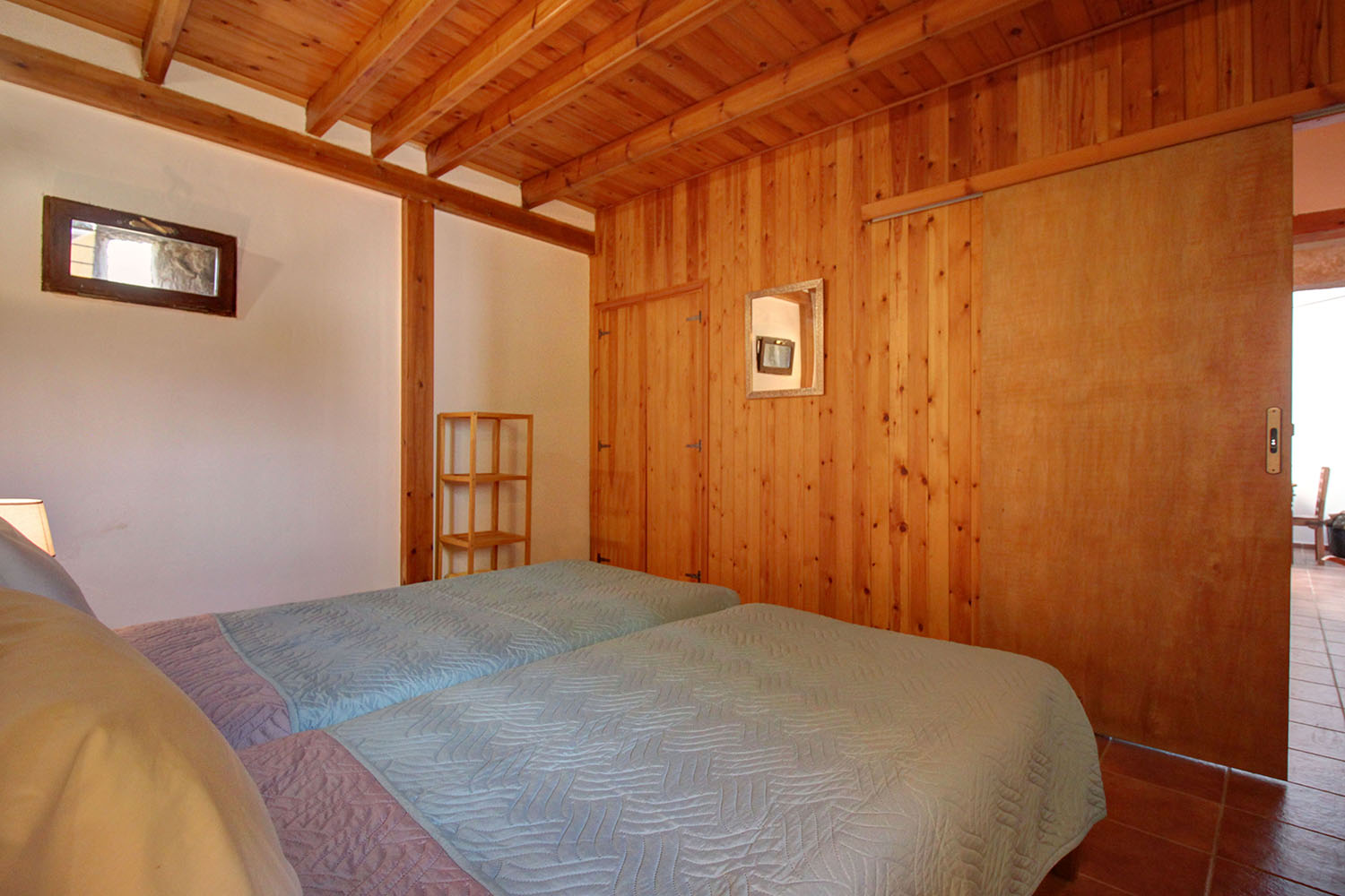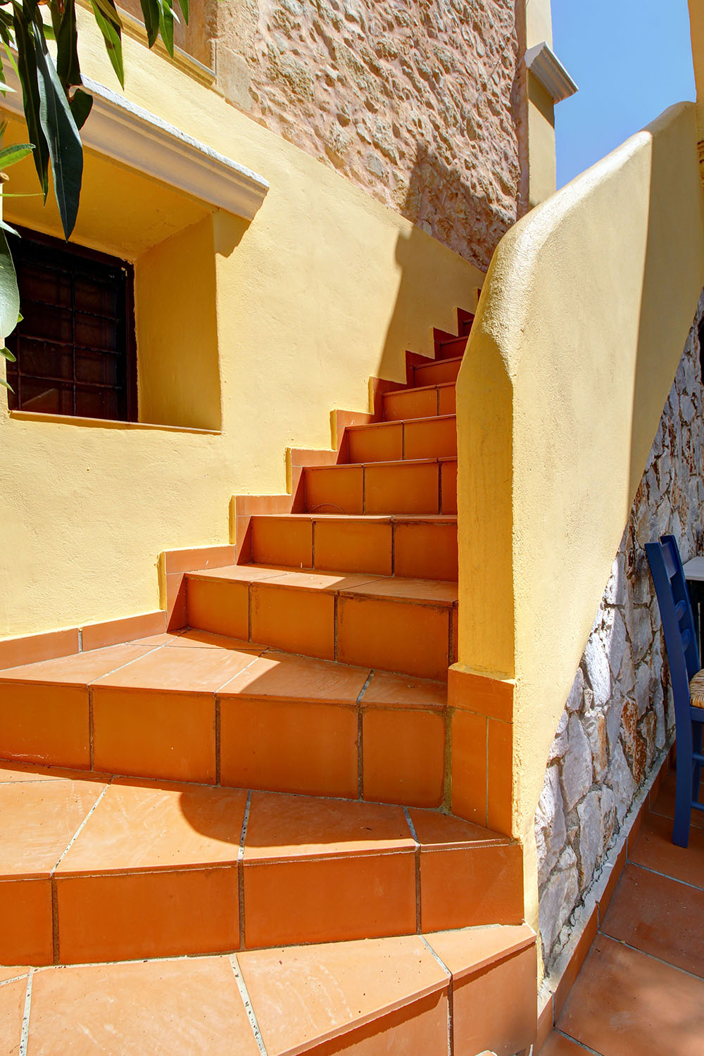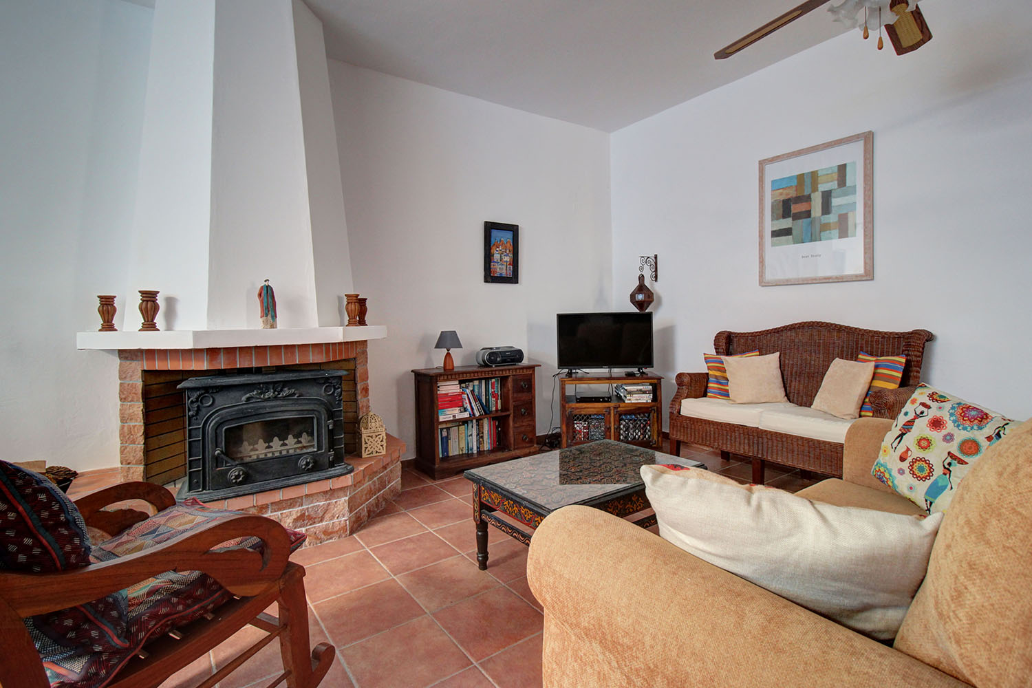 Στο ισόγειο μας υποδέχεται ένας όμορφος ενιαίος χώρος όπου βρίσκονται το σαλόνι, η τραπεζαρία και η κουζίνα. Στο σαλόνι υπάρχει ένα κεντρικό τζάκι που προσθέτει θαλπωρή στον χώρο, όπου έχει τοποθετηθεί μαντεμένια ξυλόσομπα για διευκόλυνση χρήσης. Η κουζίνα φωτίζεται όμορφα με φωταγωγό οροφής και έχει μεγάλο πάγκο και πολλά ντουλάπια. Στο ισόγειο βρίσκονται, επίσης, το ένα από τα υπνοδωμάτια, καθώς και ένα άνετο μπάνιο, που συνδυαστικά με μικρές παρεμβάσεις μπορούν να καταστήσουν το μεγαλύτερο μέρος της οικίας προσβάσιμο από άτομα με κινητικές δυσκολίες. Μία ξύλινη σκάλα οδηγεί επάνω, σε ένα μεγάλο υπνοδωμάτιο με ξύλινο πάτωμα και ταβάνι. Βασικό προσόν του σπιτιού αποτελεί το μεγάλο μπαλκόνι του ορόφου το οποίο είναι προσβάσιμο και από εξωτερική σκάλα. Είναι σχεδόν 50 m² και ένα μέρος του είναι στεγασμένο με πέργκολα. Ο όροφος έχει επίσης ένα εξωτερικό WC το οποίο είναι προσβάσιμο εξωτερικά και διαθέτει ντους.