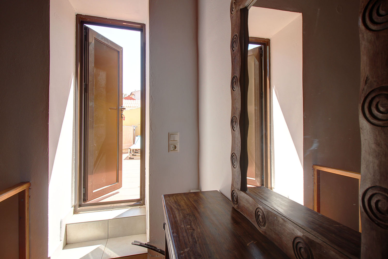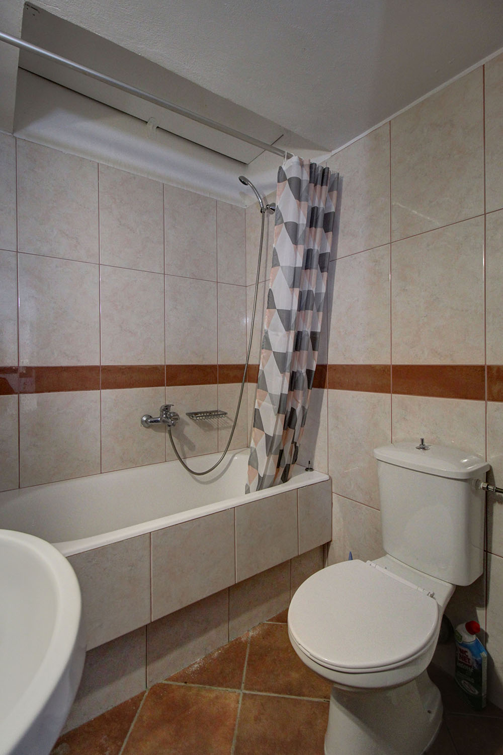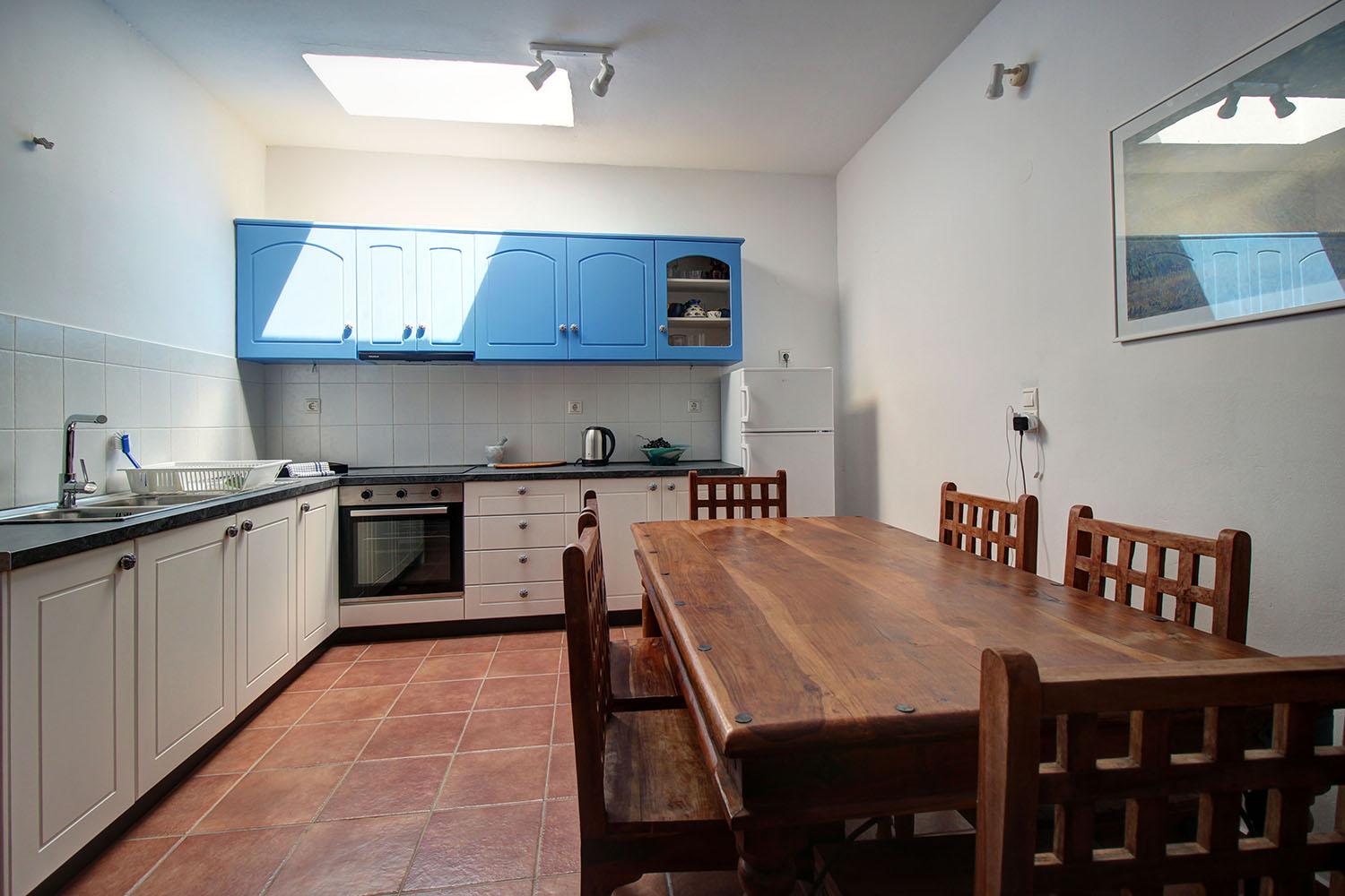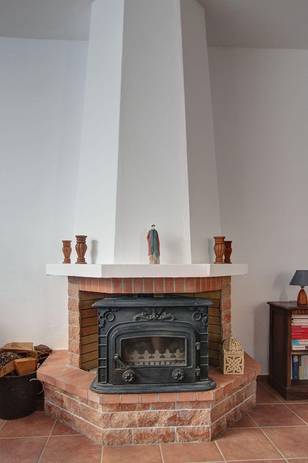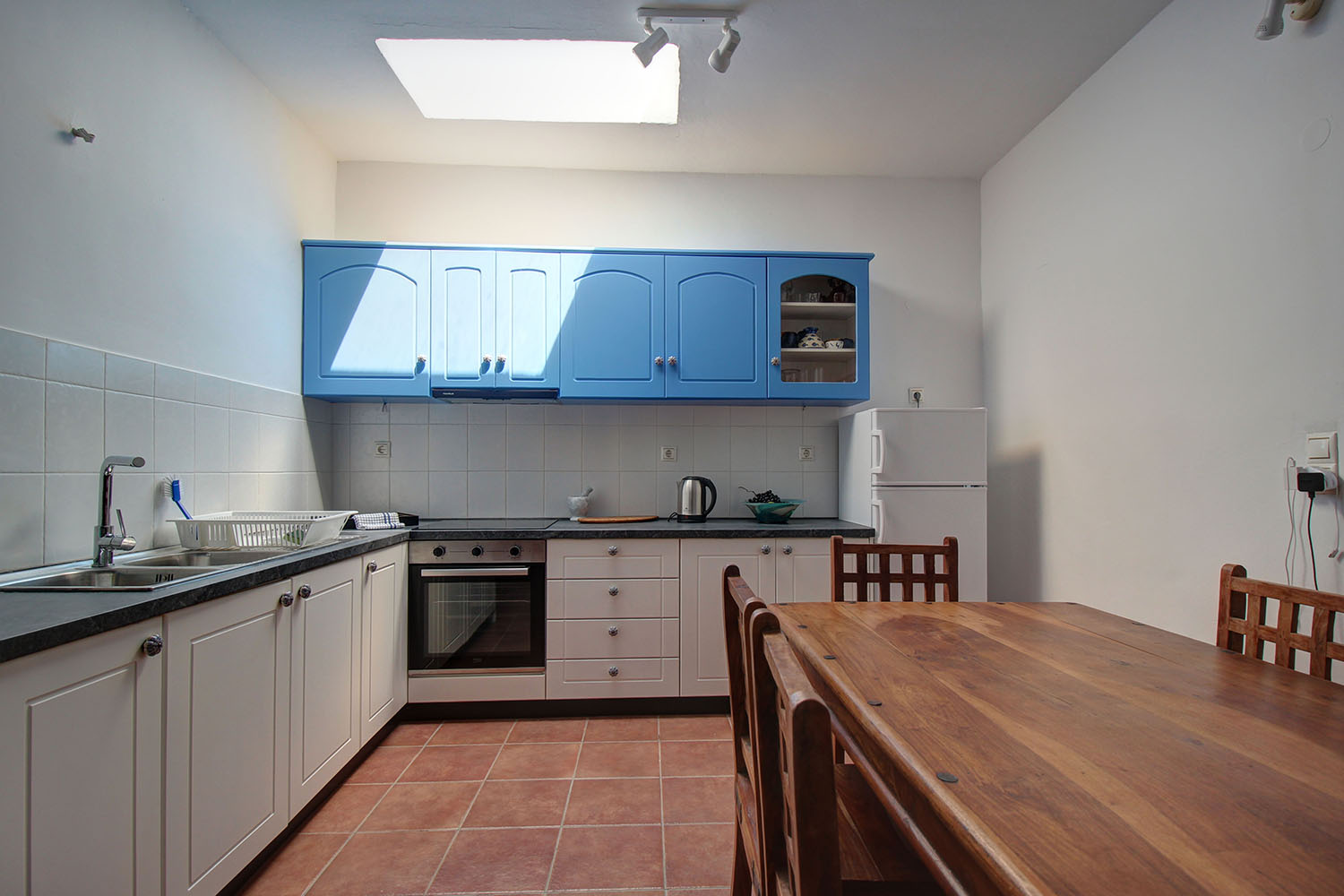 Στο ισόγειο μας υποδέχεται ένας όμορφος ενιαίος χώρος όπου βρίσκονται το σαλόνι, η τραπεζαρία και η κουζίνα. Στο σαλόνι υπάρχει ένα κεντρικό τζάκι που προσθέτει θαλπωρή στον χώρο, όπου έχει τοποθετηθεί μαντεμένια ξυλόσομπα για διευκόλυνση χρήσης. Η κουζίνα φωτίζεται όμορφα με φωταγωγό οροφής και έχει μεγάλο πάγκο και πολλά ντουλάπια. Στο ισόγειο βρίσκονται, επίσης, το ένα από τα υπνοδωμάτια, καθώς και ένα άνετο μπάνιο, που συνδυαστικά με μικρές παρεμβάσεις μπορούν να καταστήσουν το μεγαλύτερο μέρος της οικίας προσβάσιμο από άτομα με κινητικές δυσκολίες. Μία ξύλινη σκάλα οδηγεί επάνω, σε ένα μεγάλο υπνοδωμάτιο με ξύλινο πάτωμα και ταβάνι. Βασικό προσόν του σπιτιού αποτελεί το μεγάλο μπαλκόνι του ορόφου το οποίο είναι προσβάσιμο και από εξωτερική σκάλα. Είναι σχεδόν 50 m² και ένα μέρος του είναι στεγασμένο με πέργκολα. Ο όροφος έχει επίσης ένα εξωτερικό WC το οποίο είναι προσβάσιμο εξωτερικά και διαθέτει ντους.